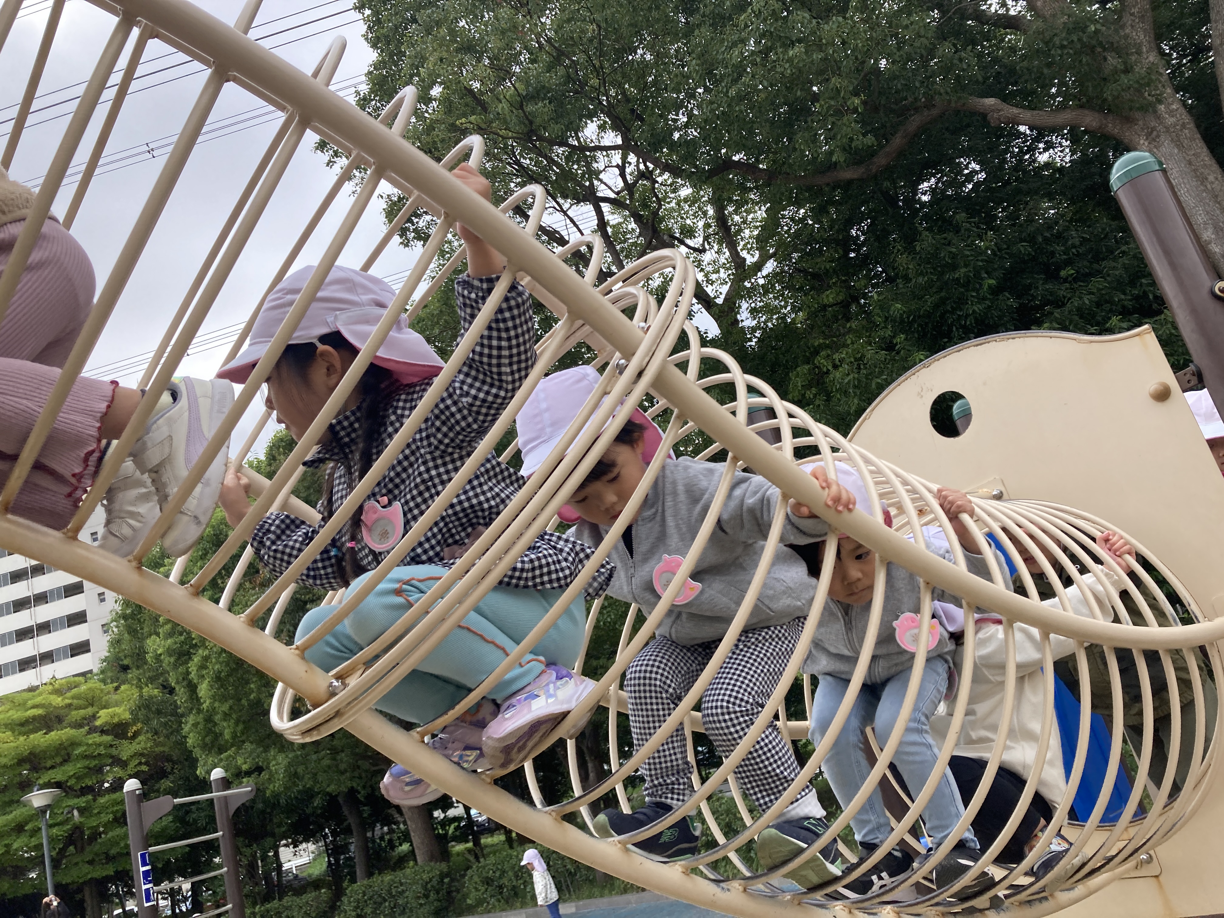 公園では、滑り台を滑ったりトンネルをくぐったり芝生の場所でしっぽとりゲームをしてたくさん体を動かして楽しんでいました。