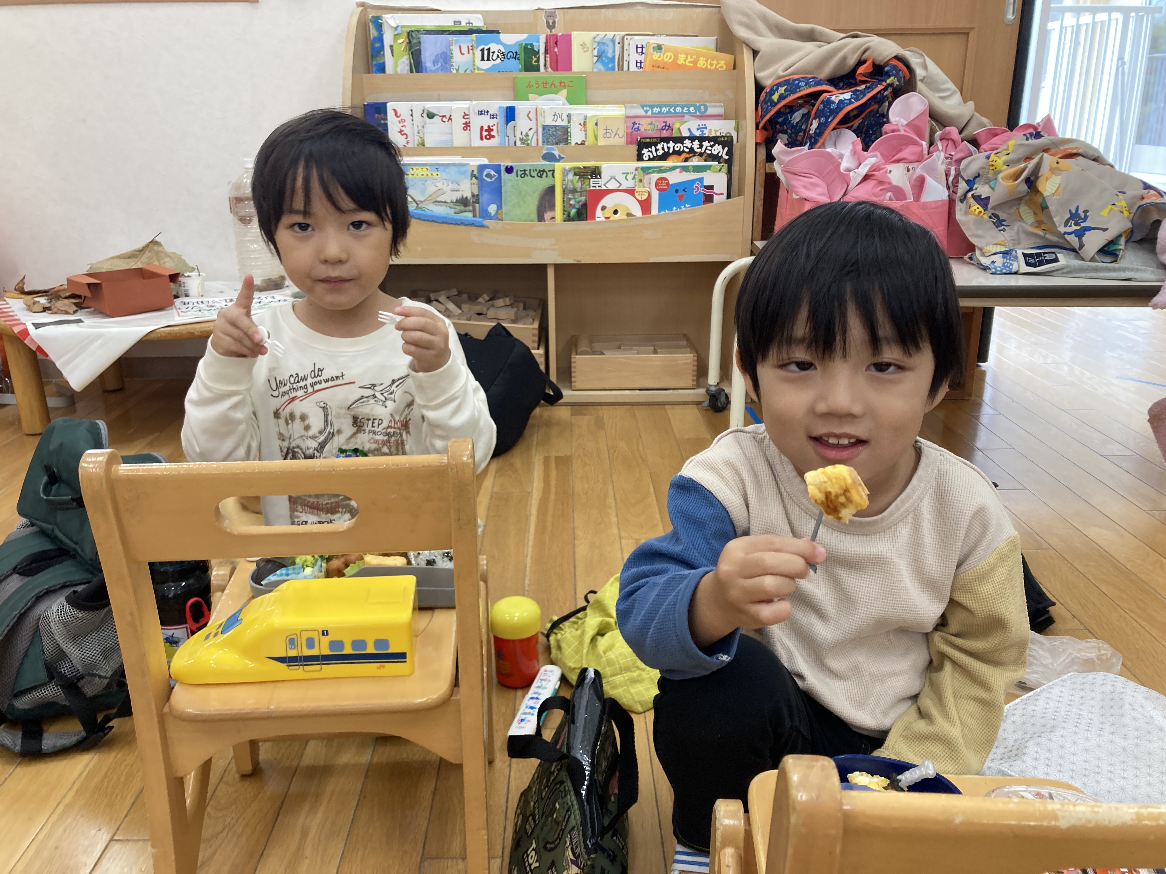 天候が不安定だった為、保育園に戻りみんなでお弁当を食べました。友達にお弁当を見せたり大好きなおかずが入っていることに大喜びでした。