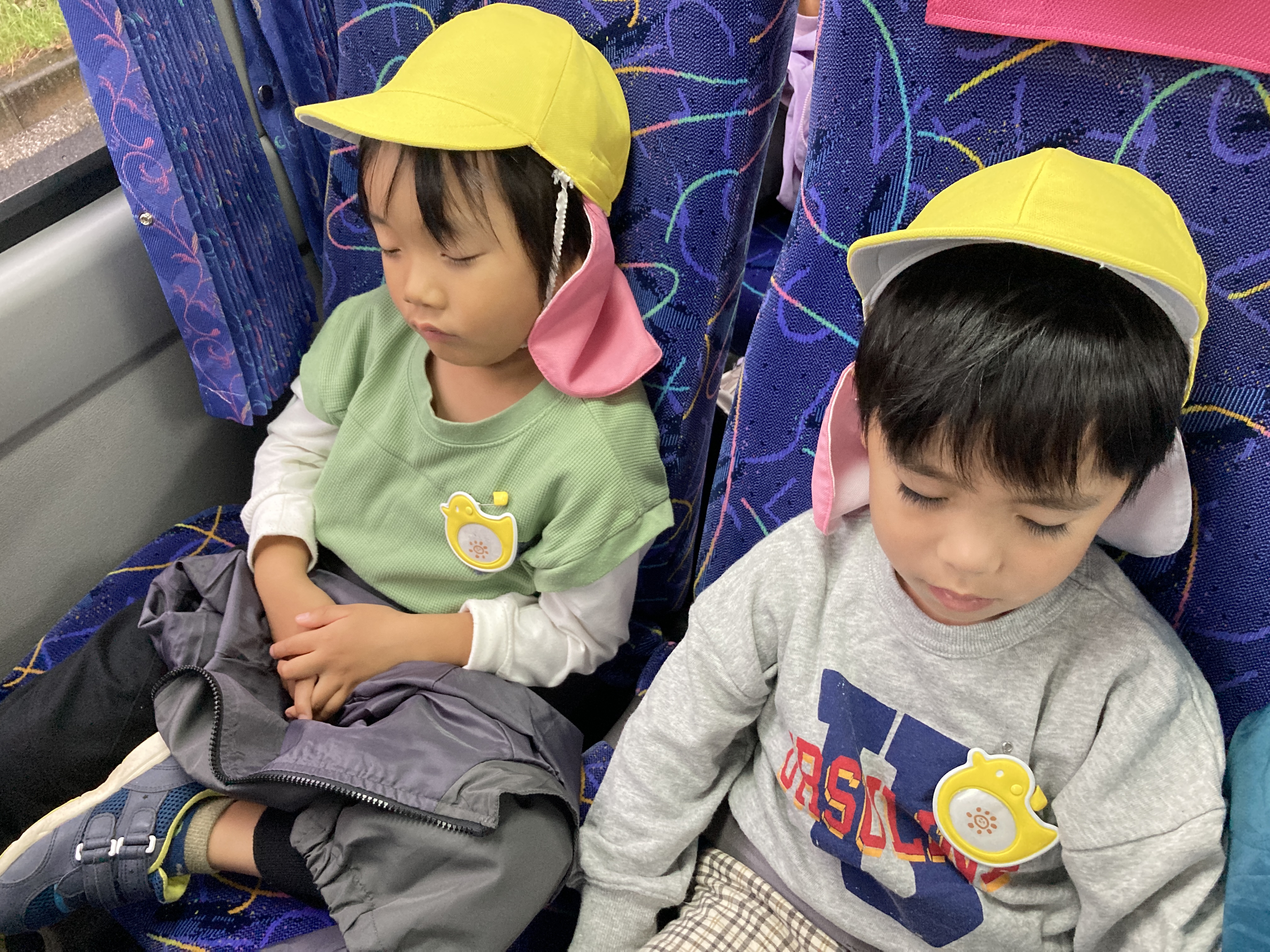お弁当を食べてお腹いっぱいになったのでバスに乗って帰ります。たくさん歩いて少し疲れたのでおやすみタイム。元気いっぱい楽しい一日を過ごすことができましたね。