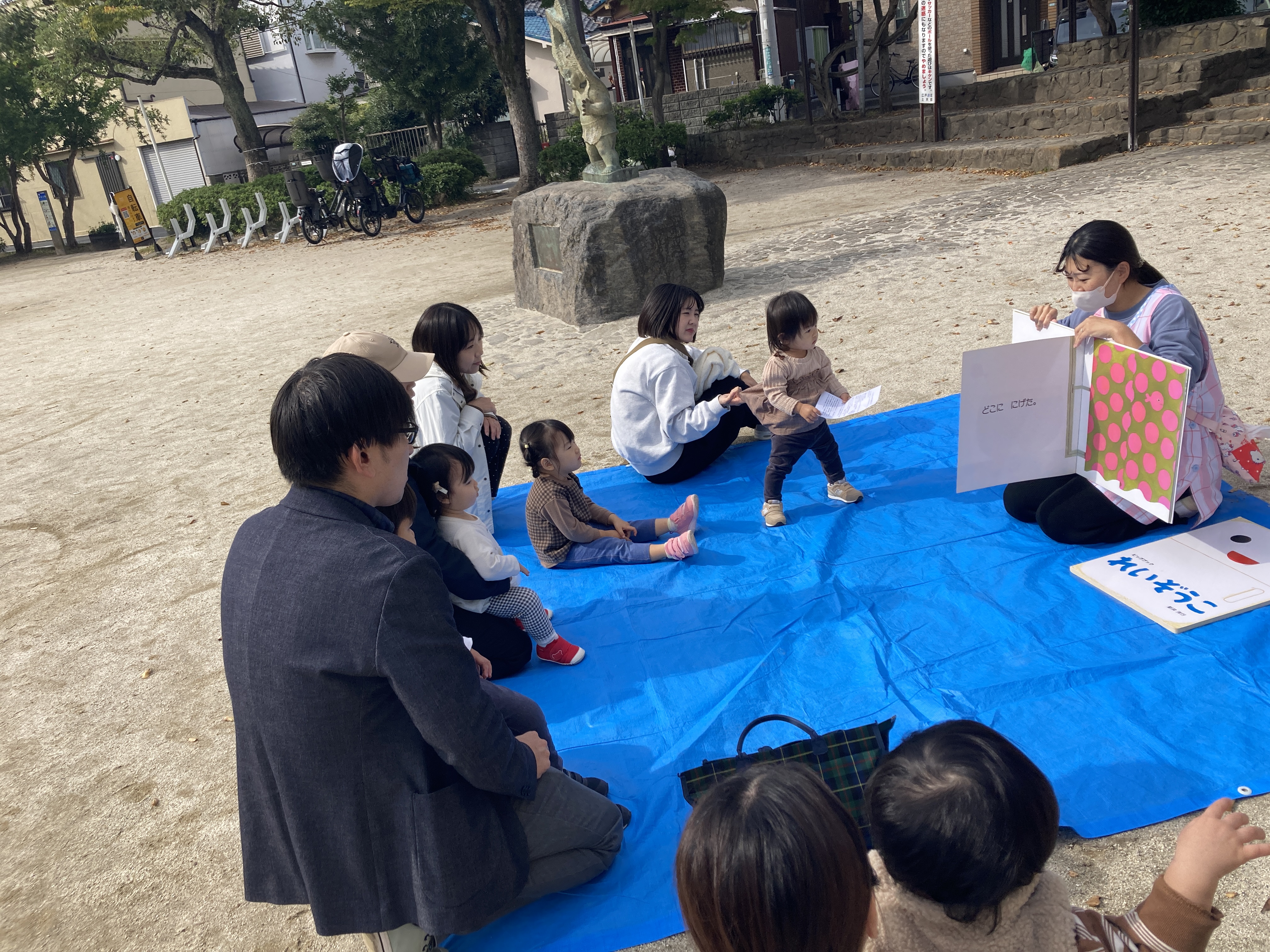 今日の広場の内容は、「絵本の読み聞かせ」と「公園の広場で遊ぶ」でした。