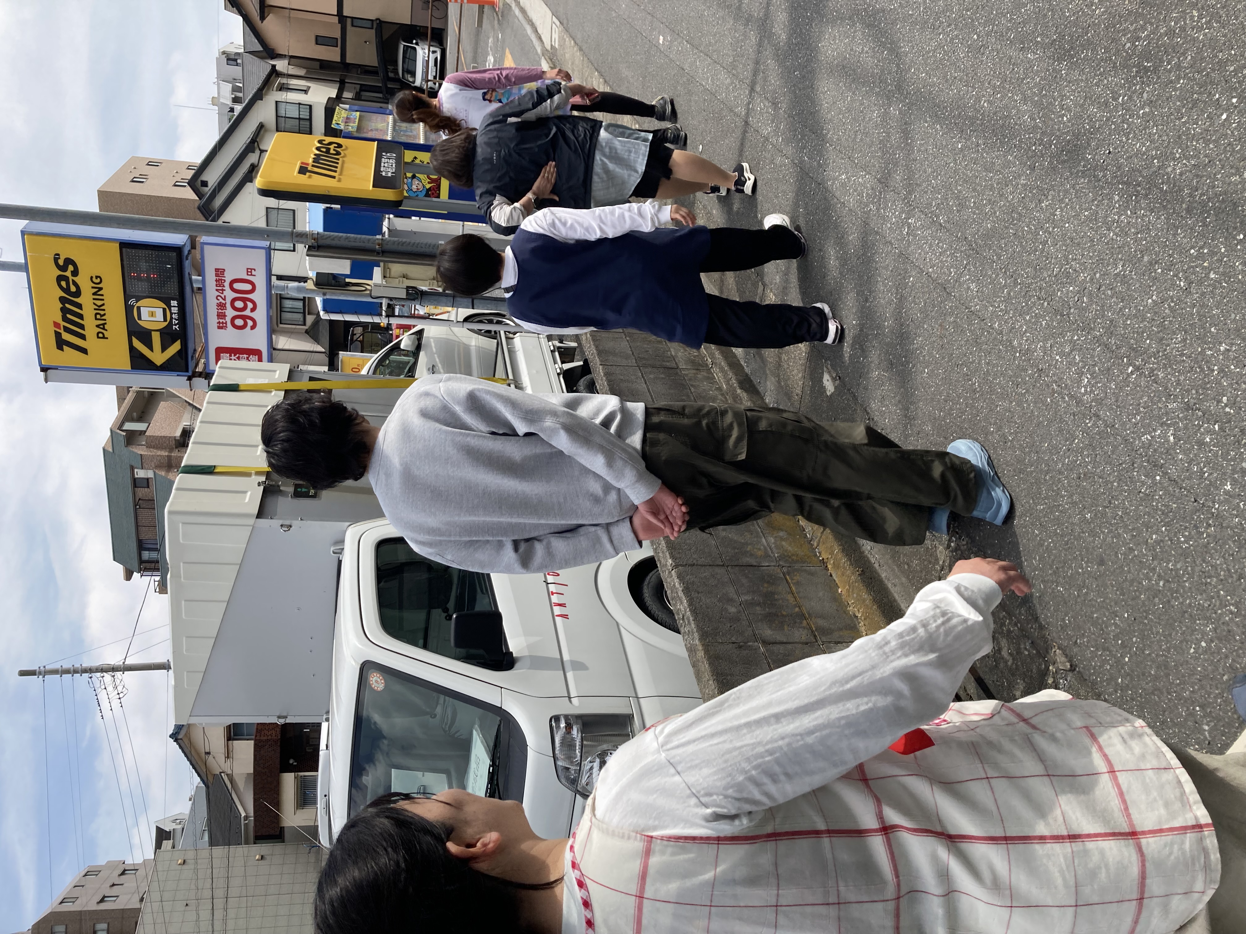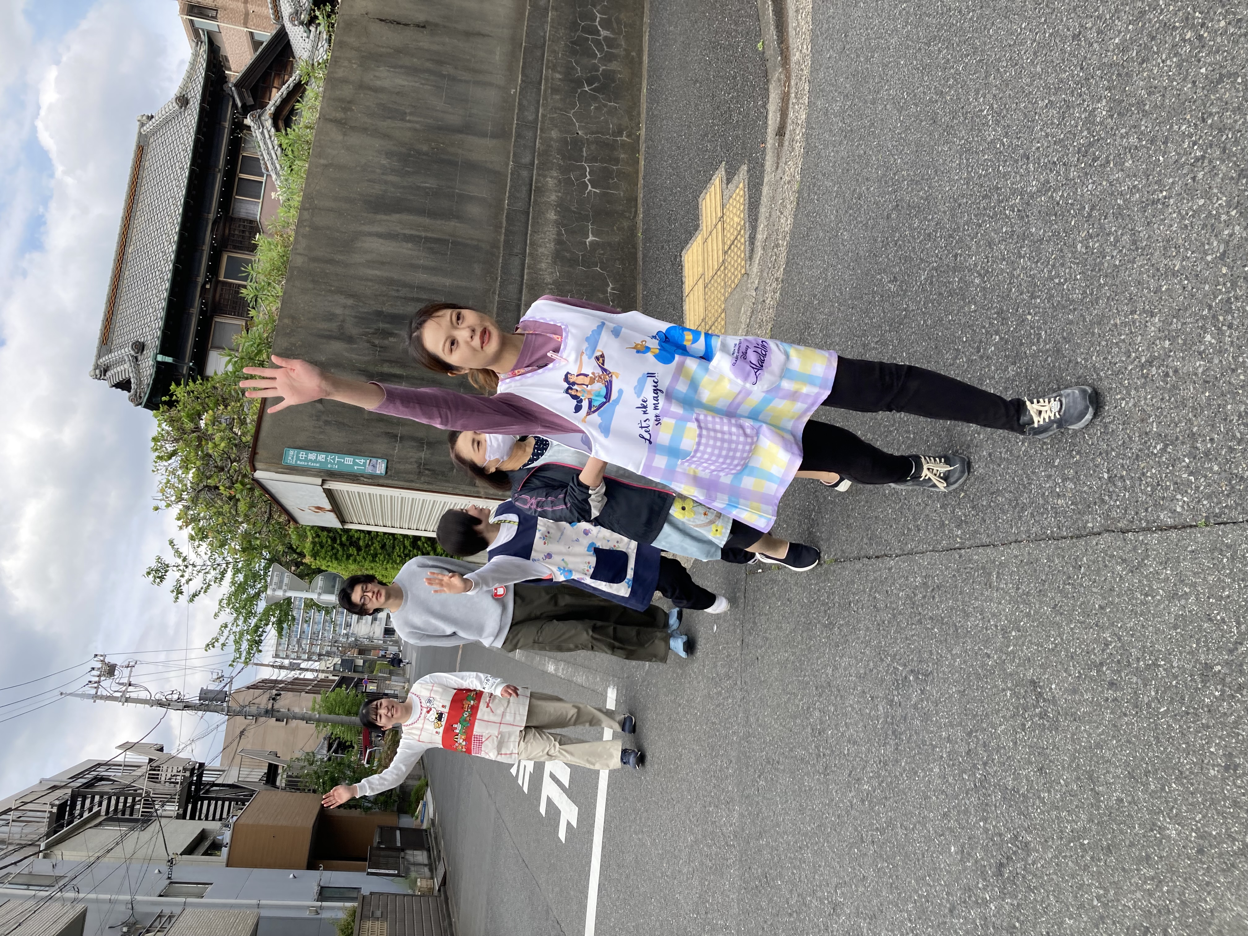 先生役と子ども役で散歩に出発しました。手を上げて渡ります。