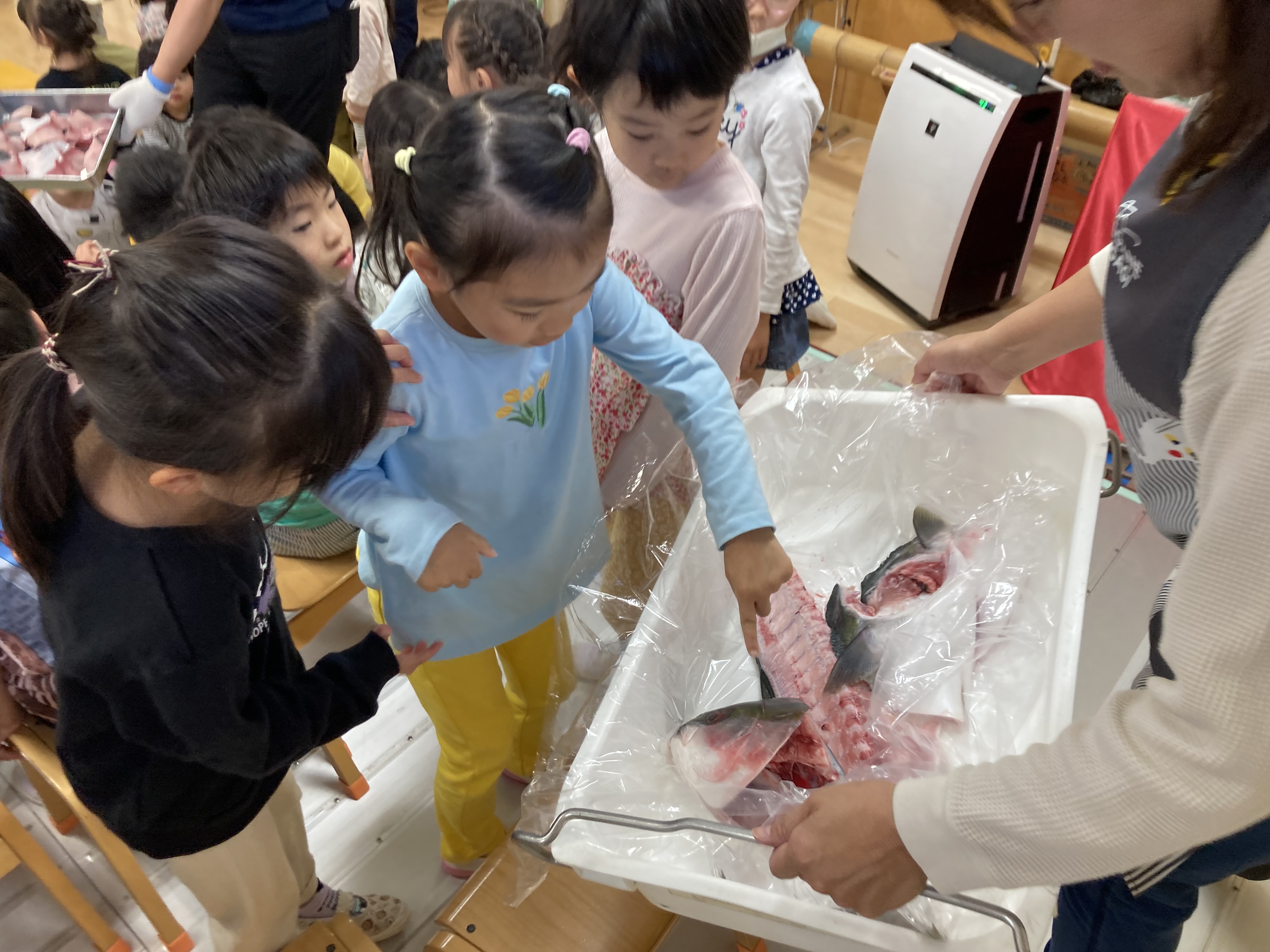 魚の頭は「かぶと」首の辺りは「かま」など名称も教えてもらい1つ物知りになった子どもたちでした。最後には「あら」を見せてもらいこわごわ触ったりと興味津々でしたよ。
