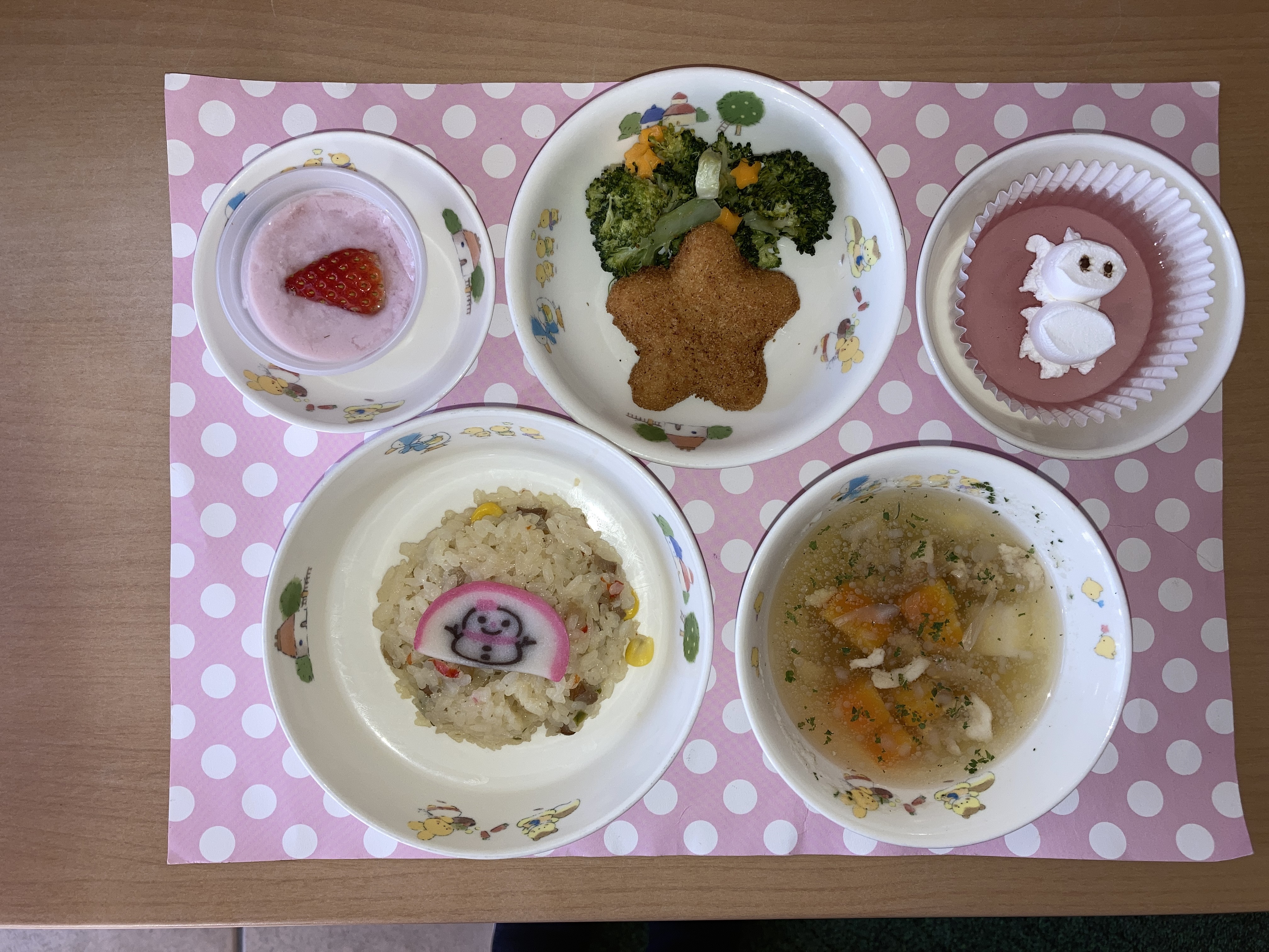 給食の雪だるまのかまぼこや星形のコロッケにに大喜びの子どもたち。