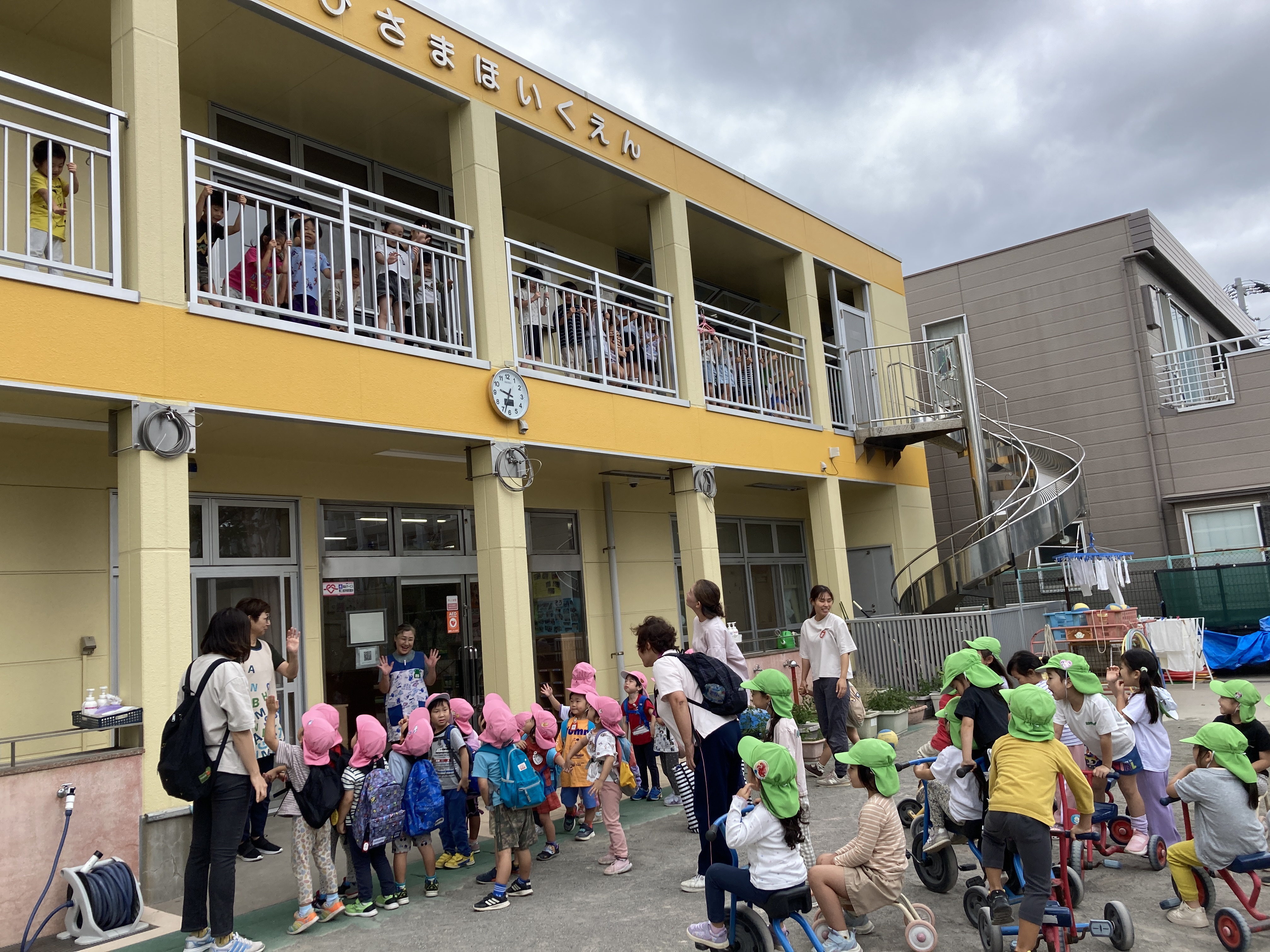 出発の時には保育園の皆が見送ってくれたので、元気に「いってきま~す!」と手を振っていました。