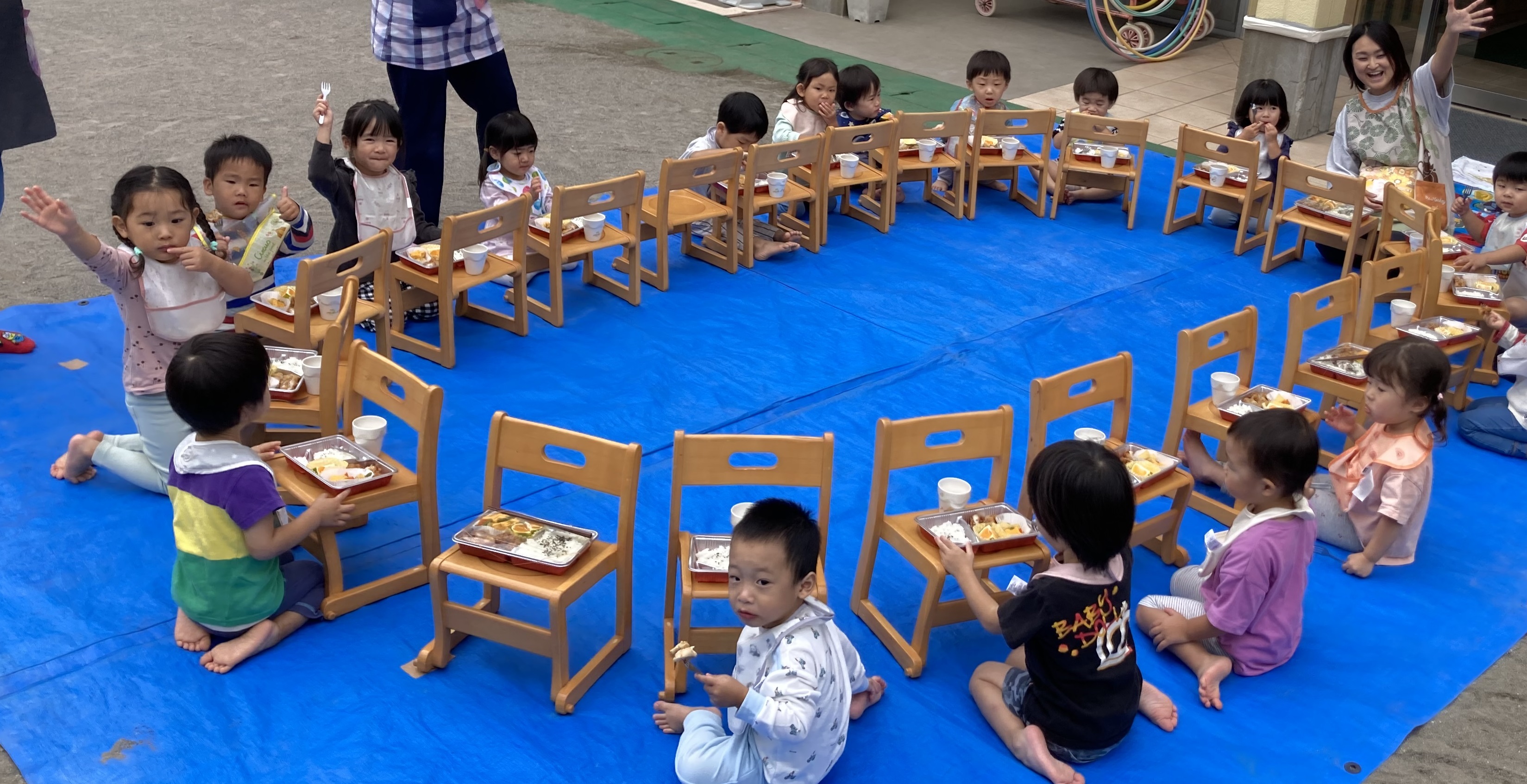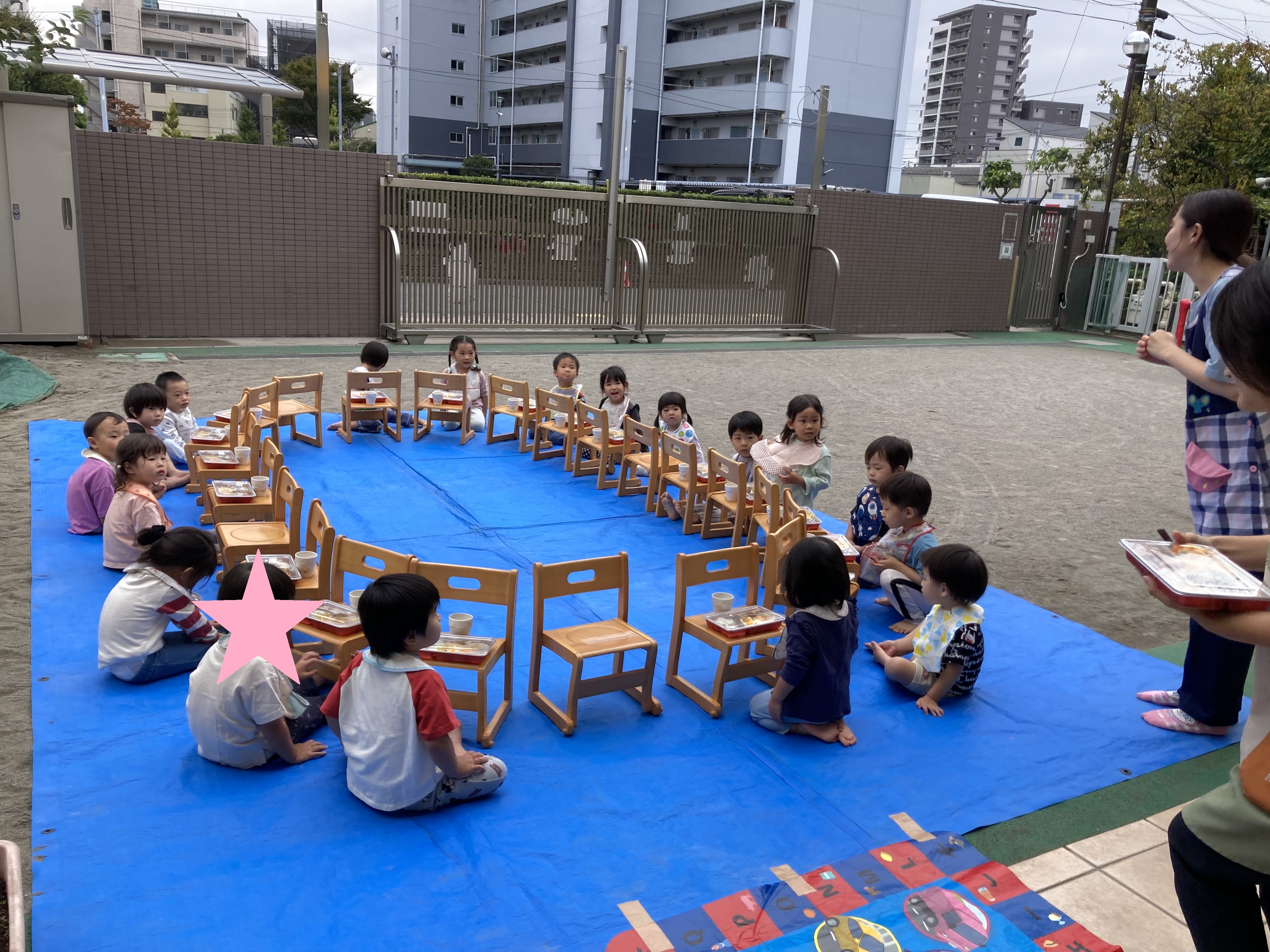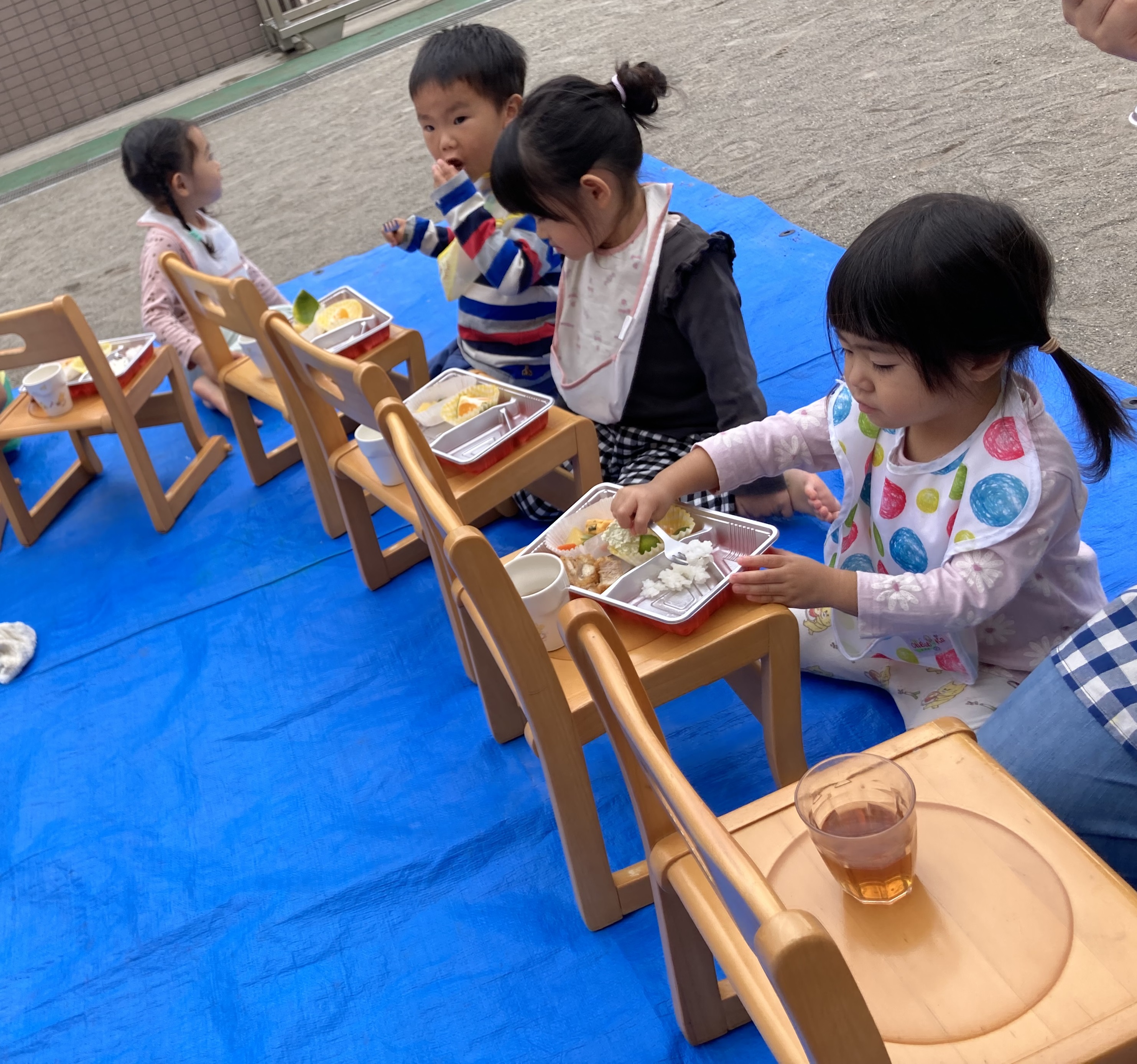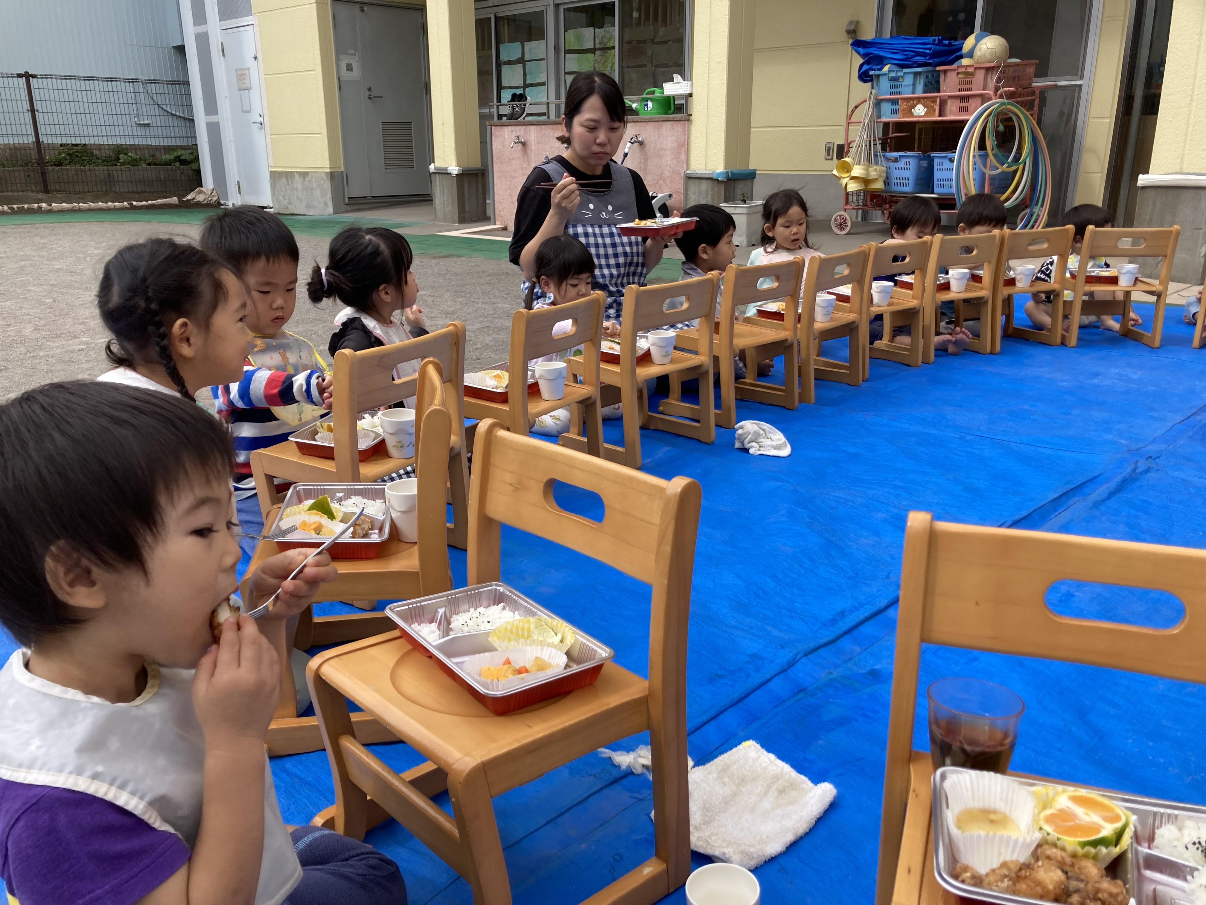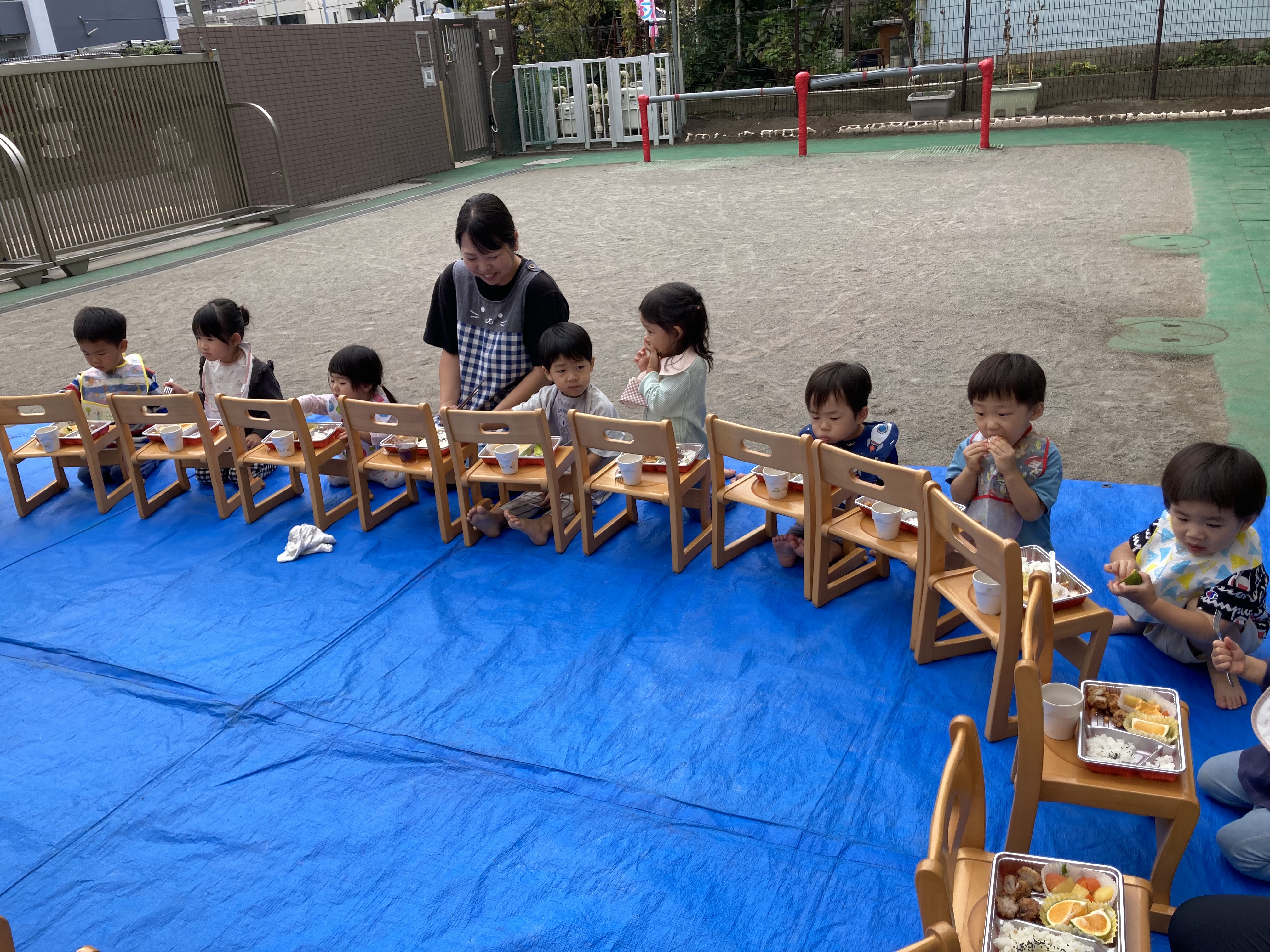 最初は「おそとでたべるの?!」と驚いている子もいましたが、食べ始めると「たのしい!」「おいしいね」と、いつもよりも沢山の声が聞こえてきました。お友達のお弁当を覗いて「からあげおいしいよ、たべてみて」と言ったり、「みてみて、たまごがキラキラおほしさま!」と会話を楽しみながら食べ進める様子に嬉しく思いました。