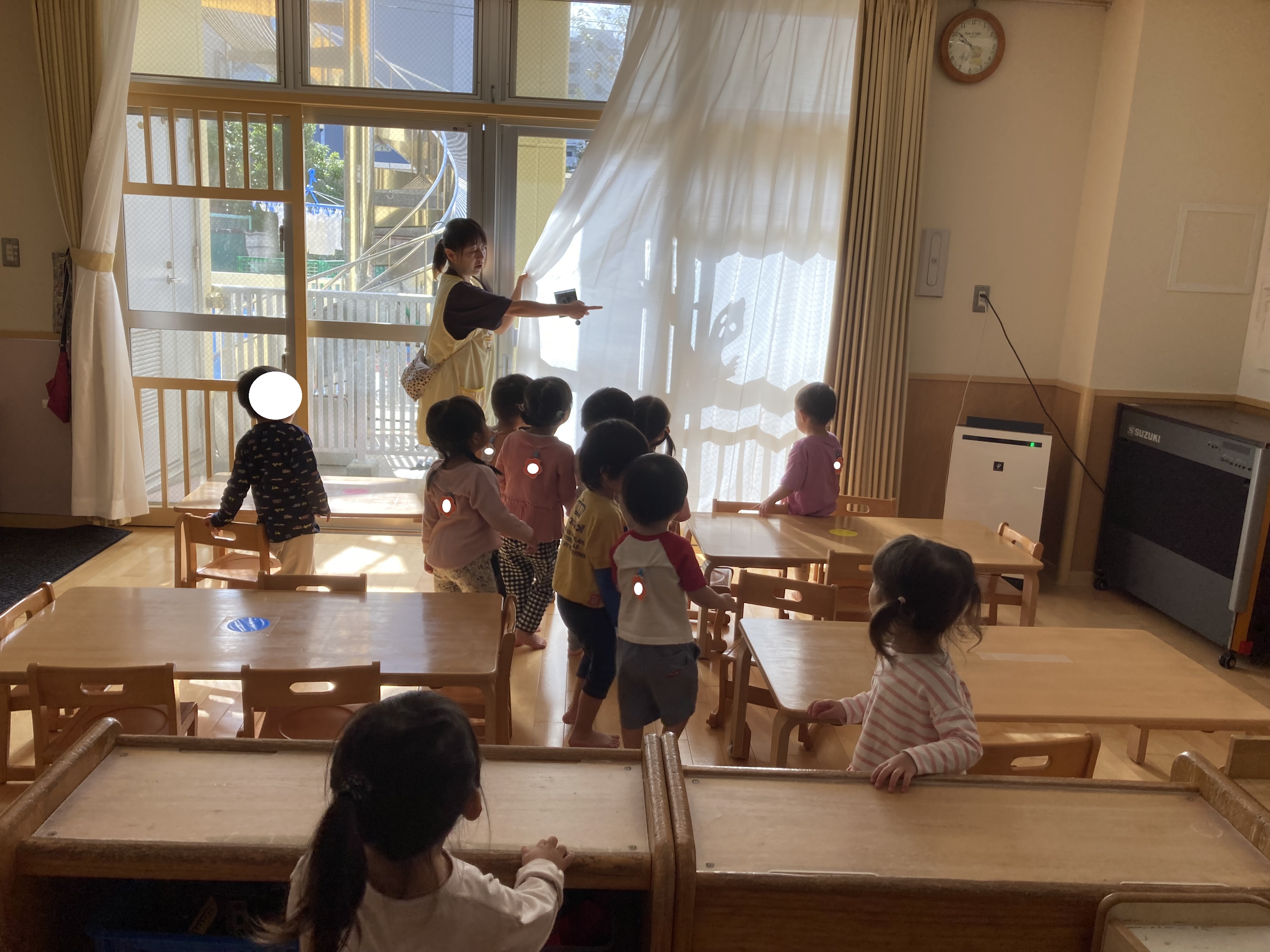 また、光が差し込むカーテンに映ったハロウィン装飾の『おばけのかげ』を見つけて「おばけがいる~!」と、みんなビックリ!!