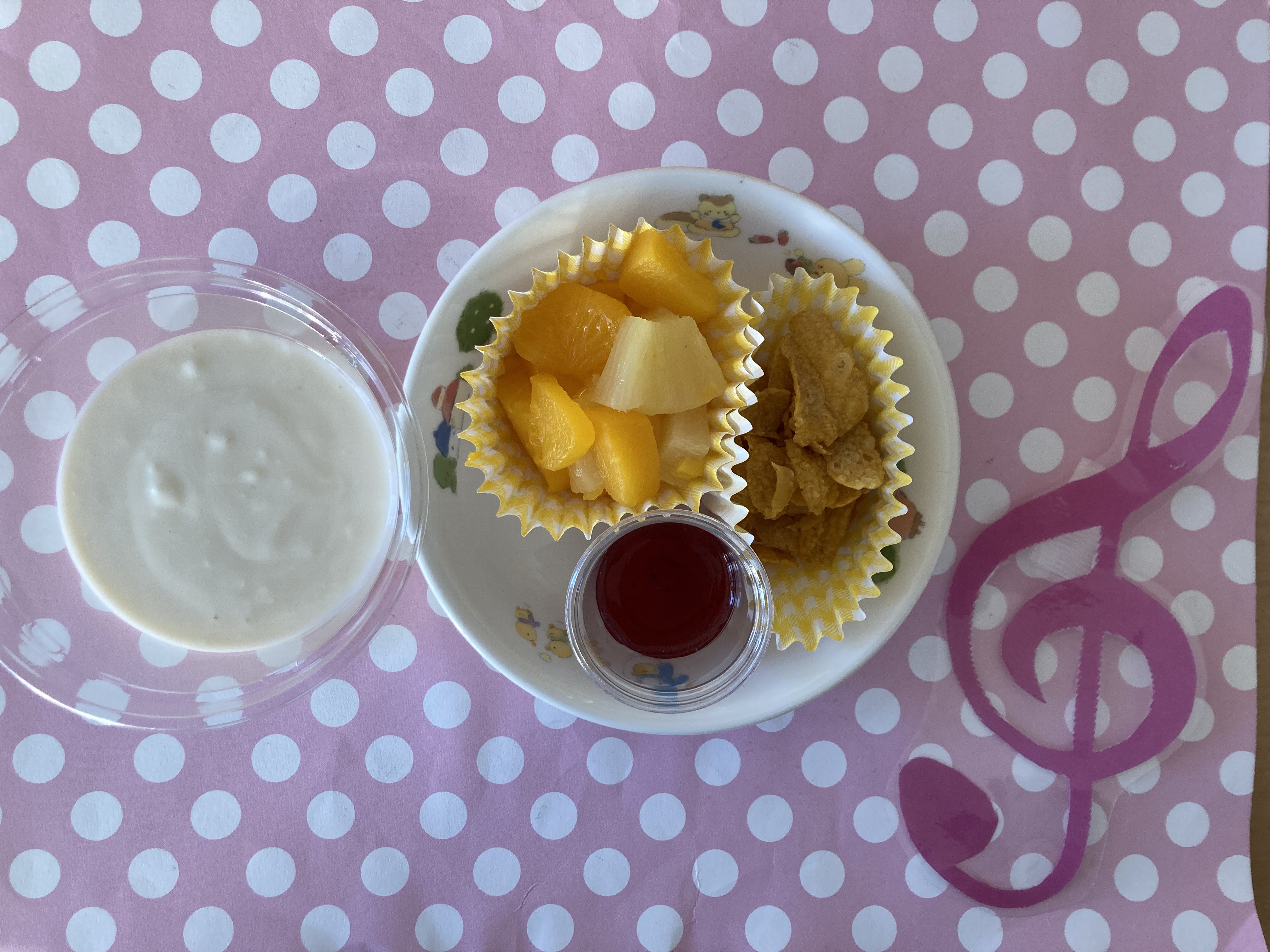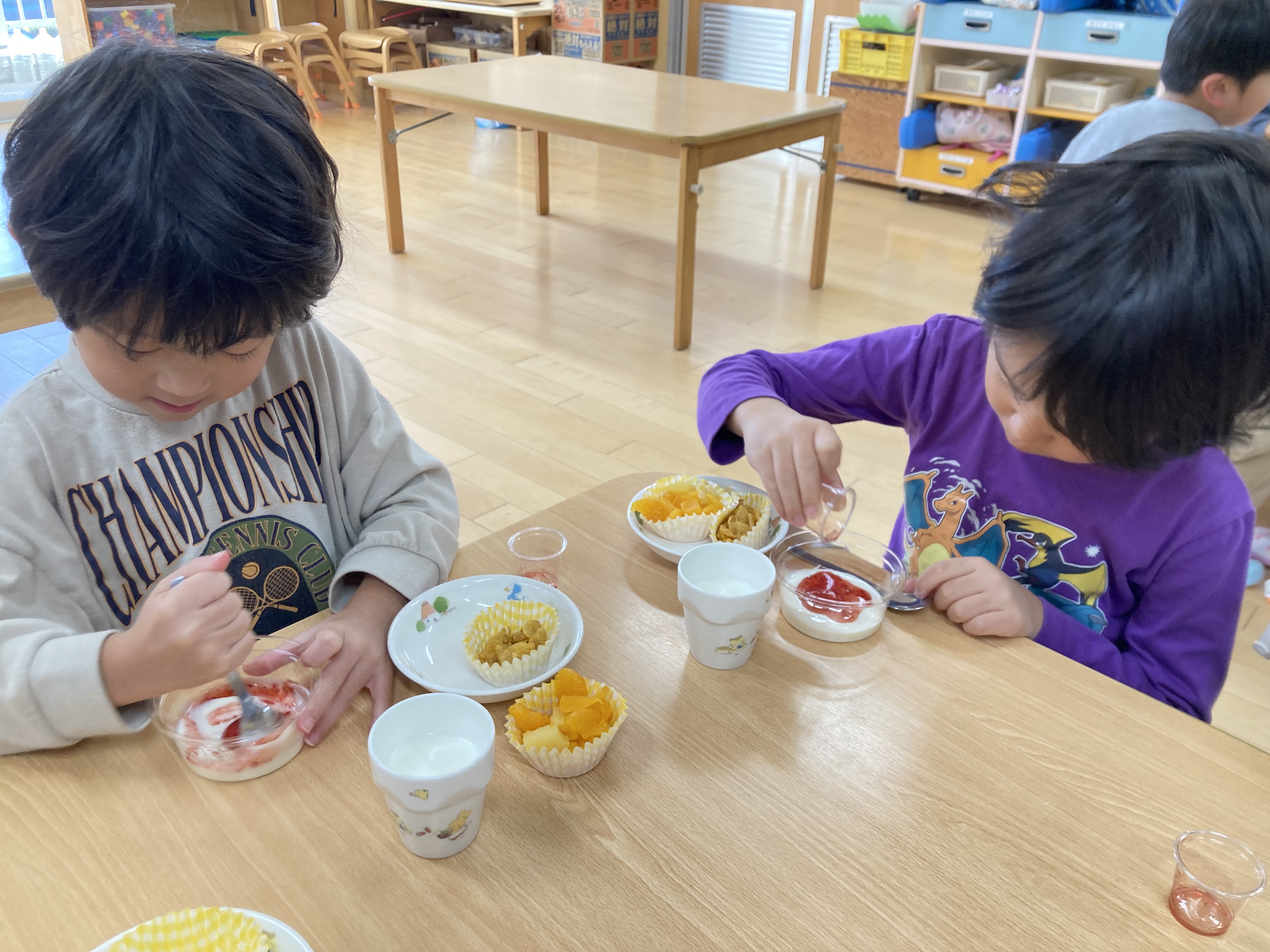 2歳児~5歳児のお友達は自分でトッピングを楽しみ、パフェを作りました。