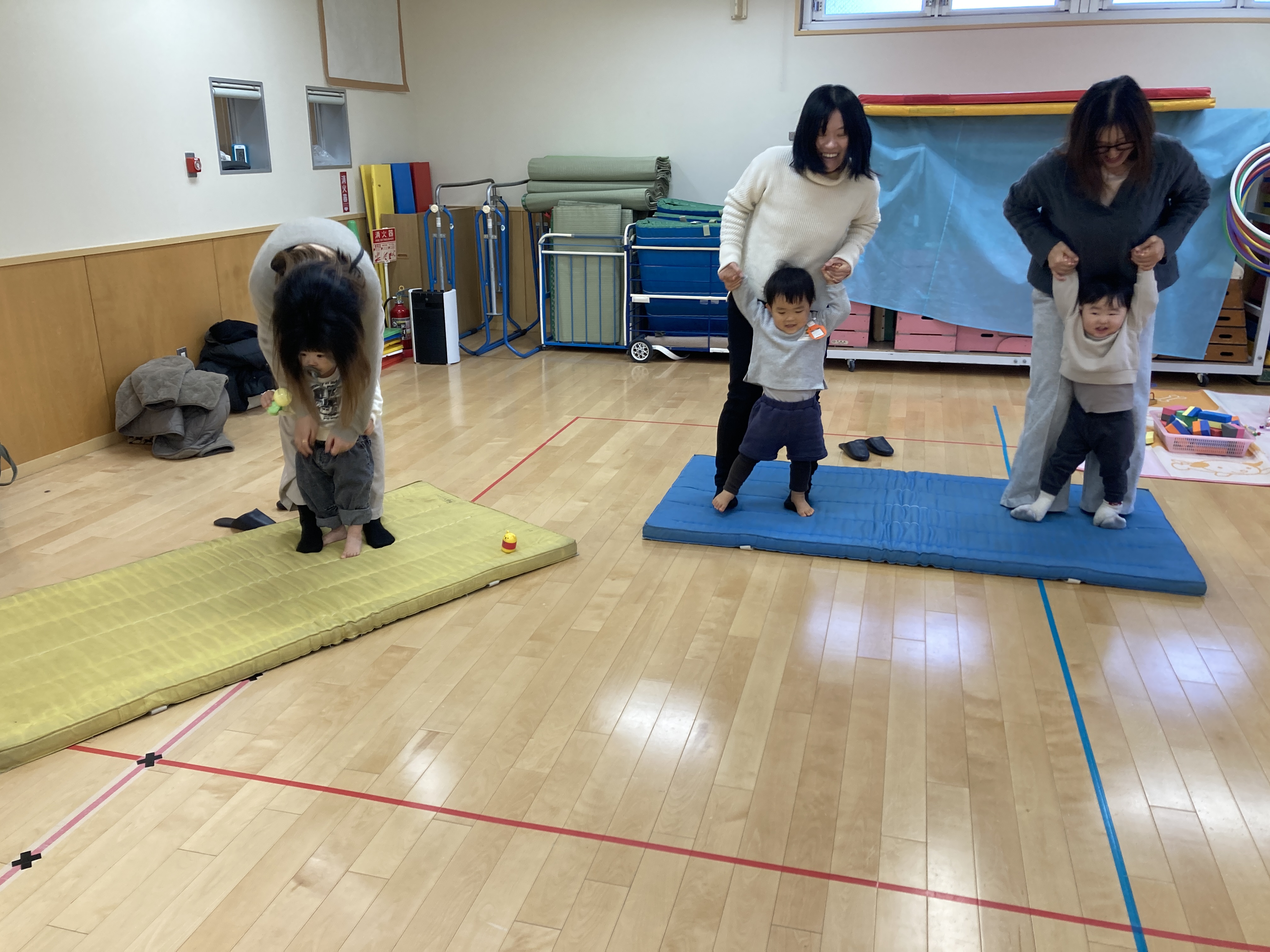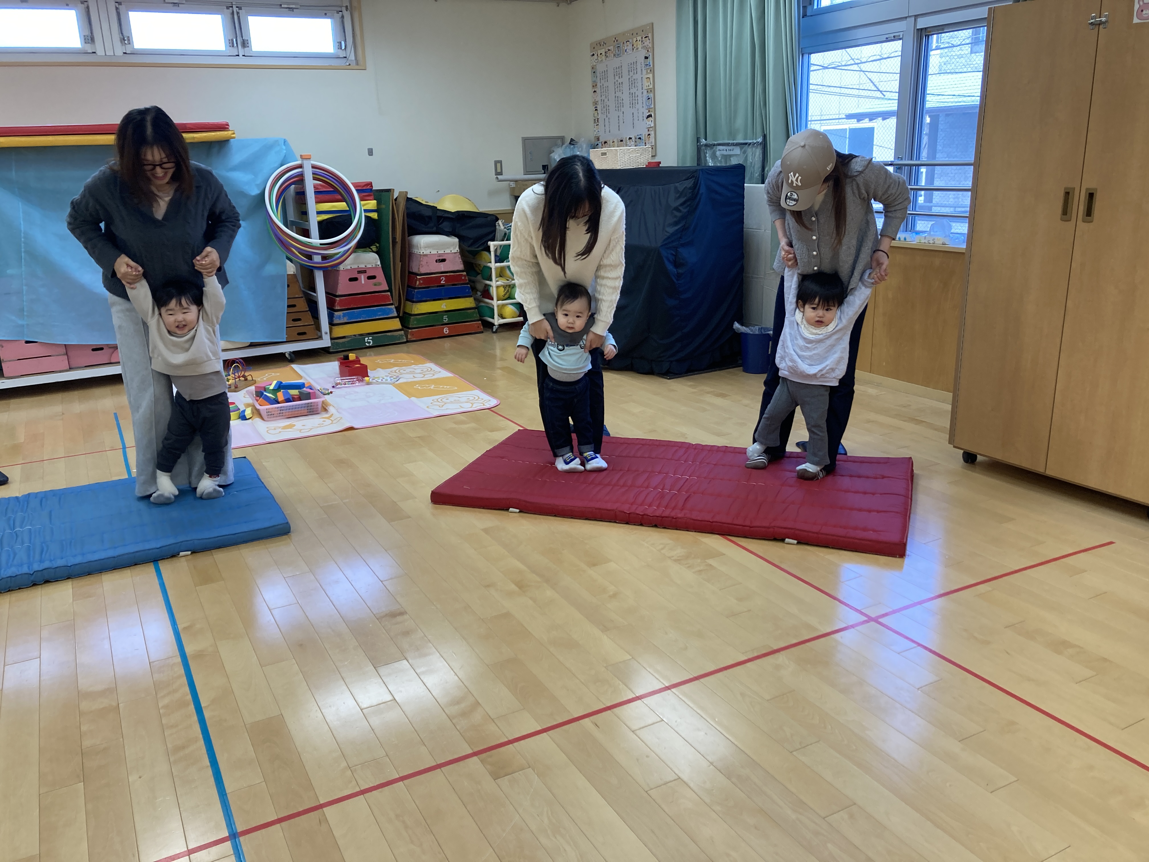 親子での触れ合い遊びでは1本橋やあしあしあひる、バスに乗って、飛行機などを一緒に行いました。こちょこちょくすぐられたり、足の上に乗って歩いたり、笑顔もたくさんみられるようになっていました。