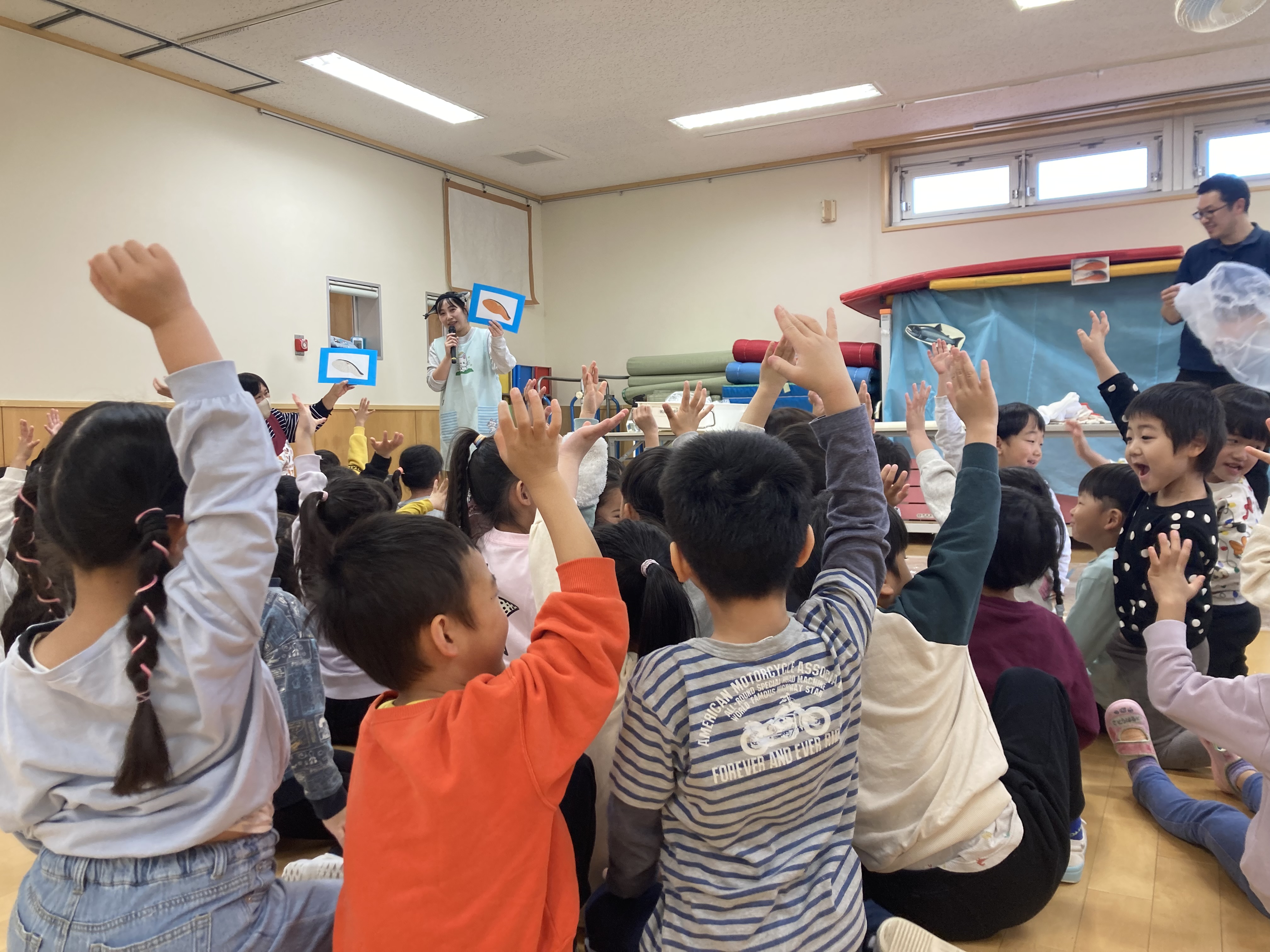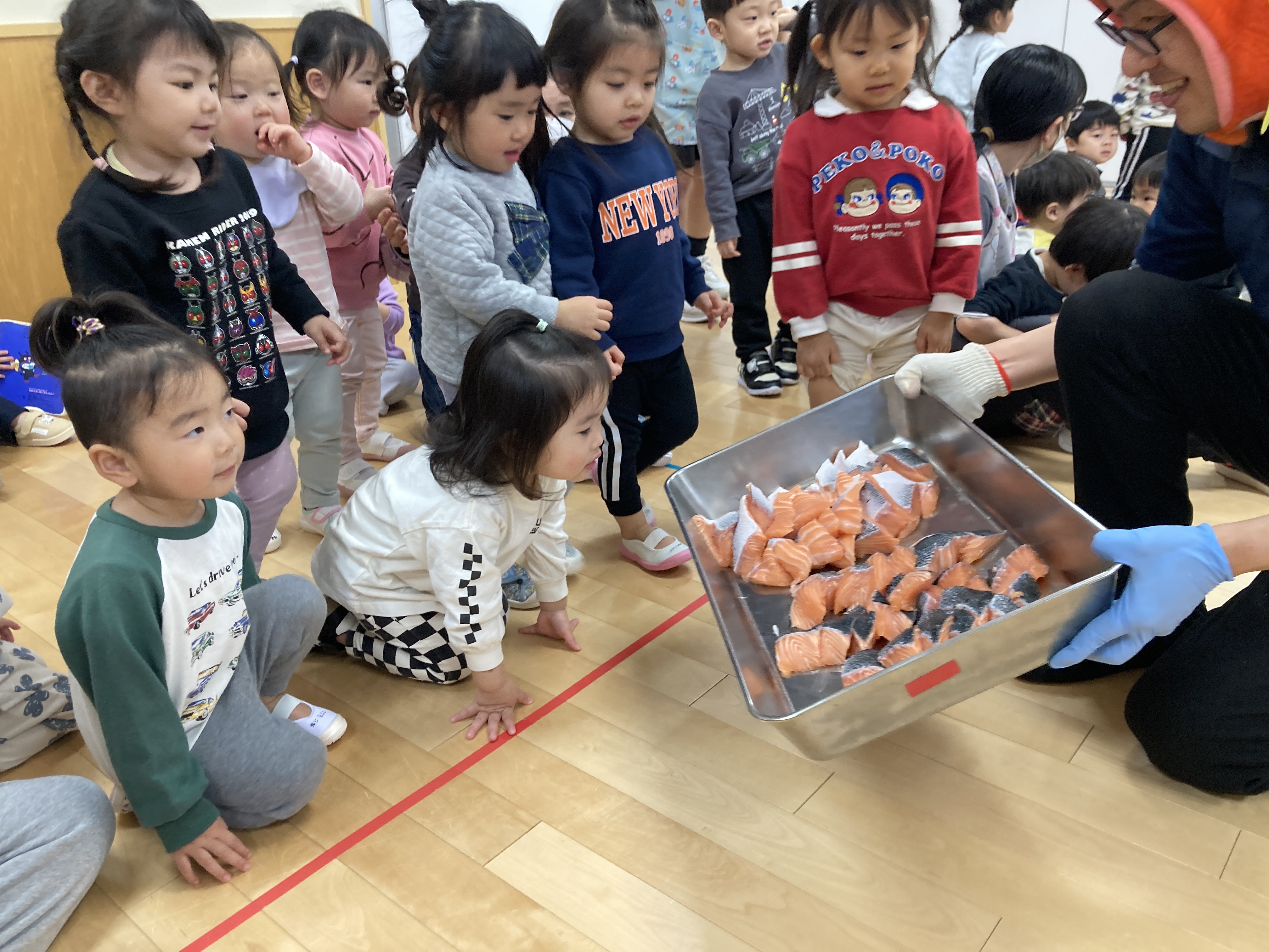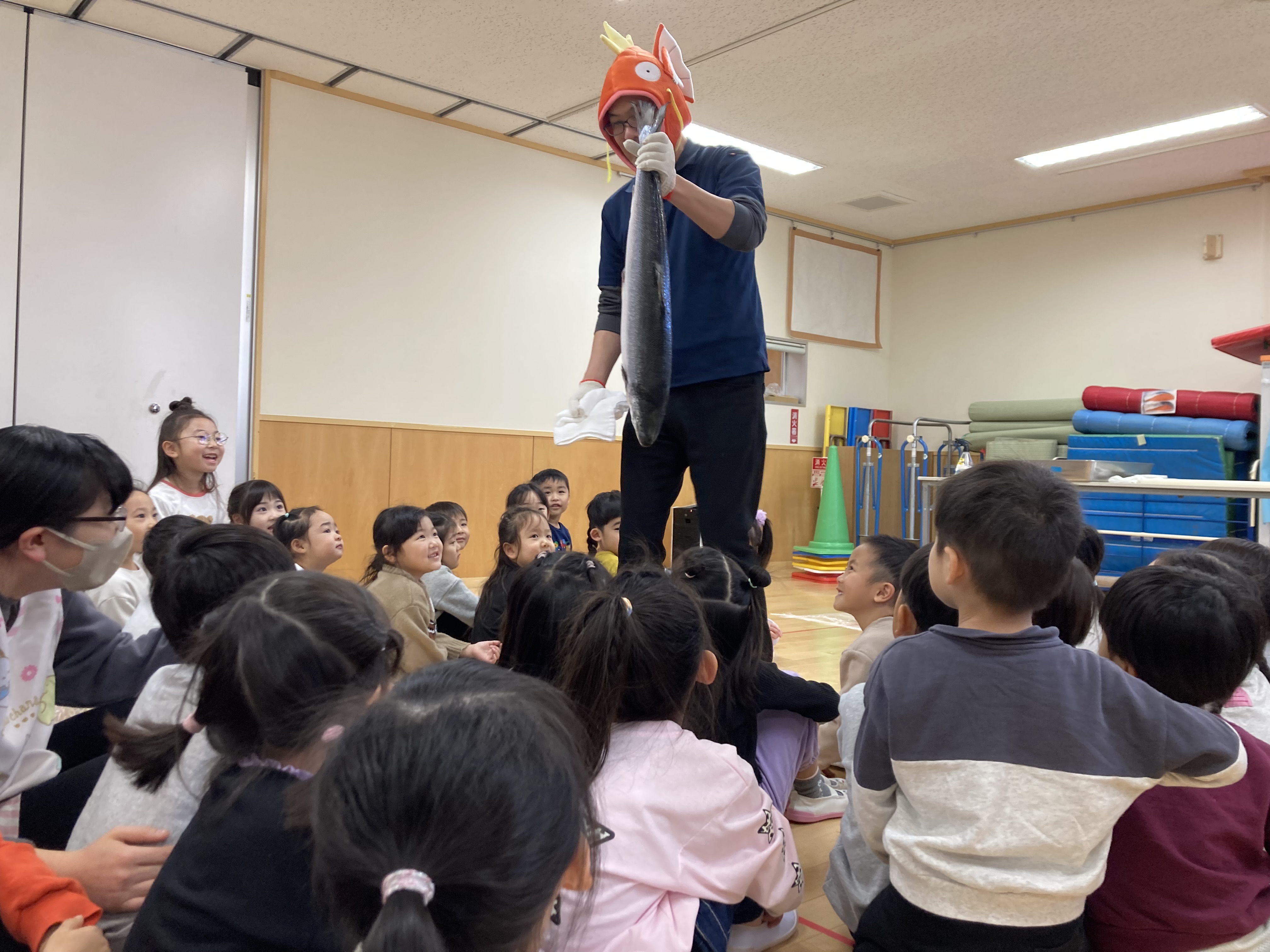 大きな鮭に「大きい」「お魚だ」と喜ぶ子ども達でした。