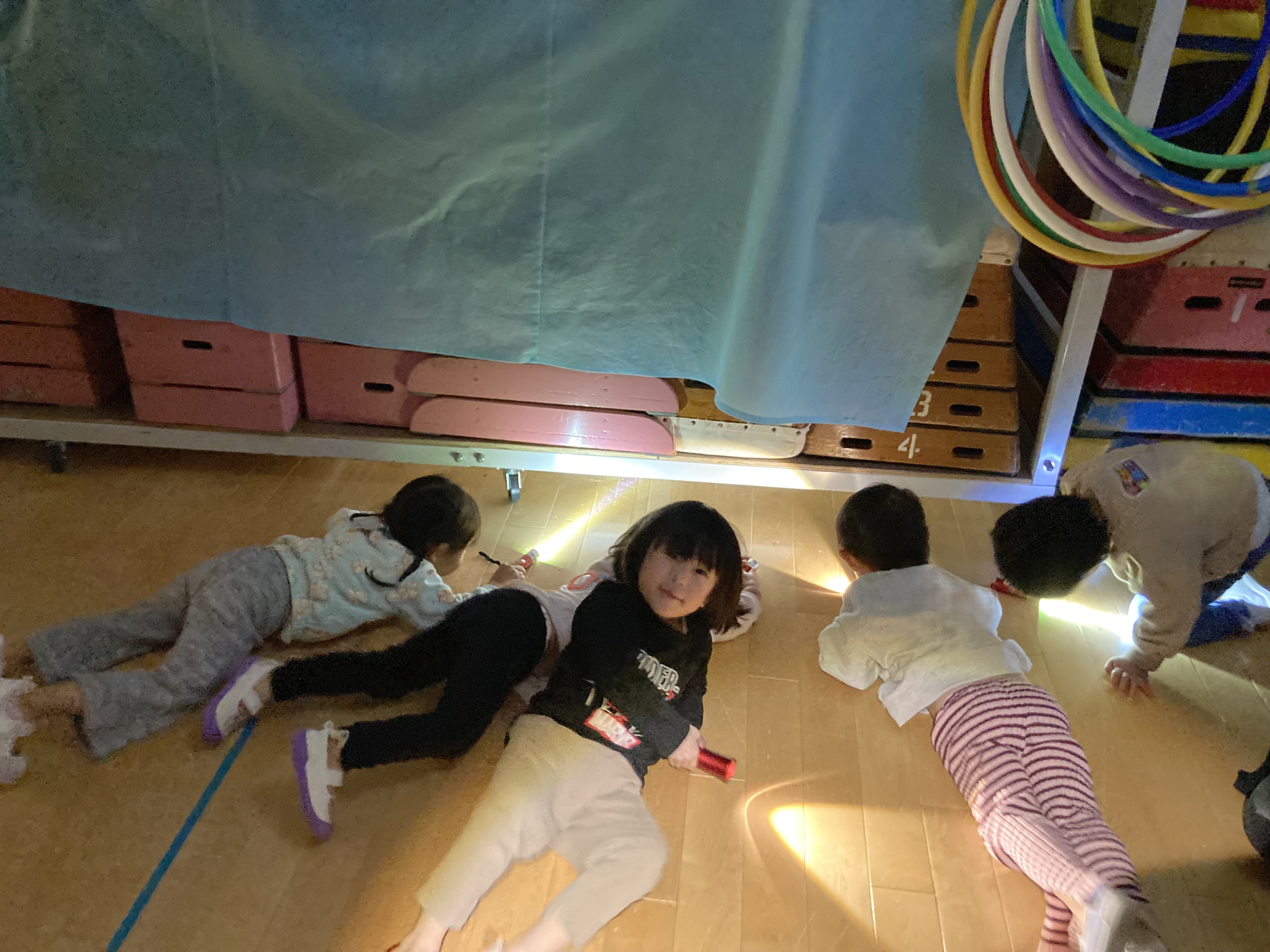 「どこどこ?」 「ライオンさんいたー!」と、みんなで床にごろんと寝転んで、 光をあてながらじっくり見ていました。思いがけない発見に、みんな大喜び♪