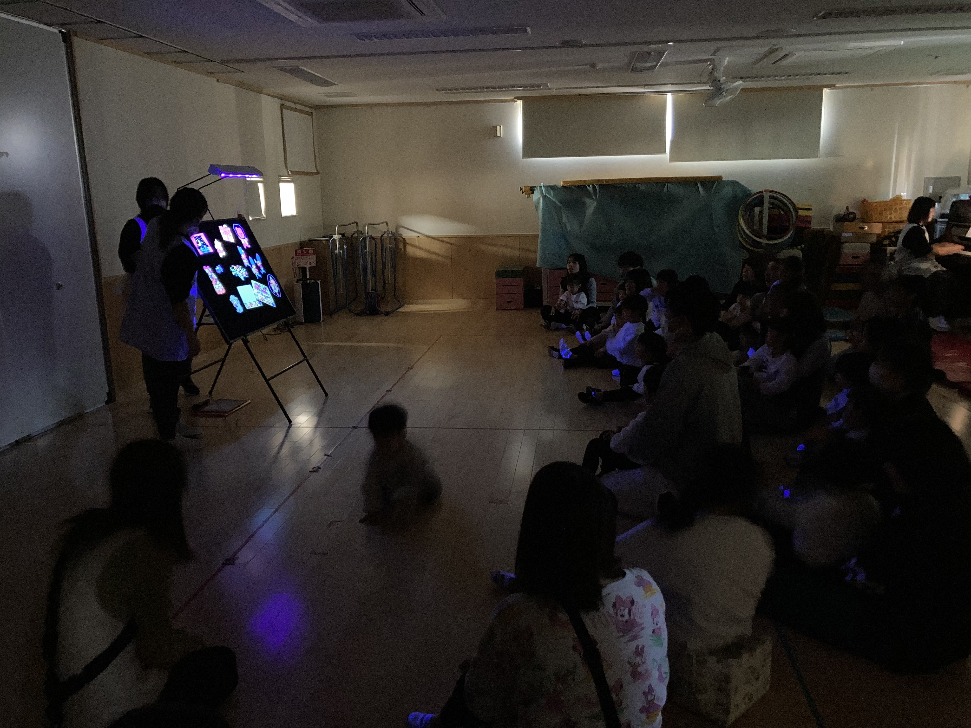 今回は、ブラックパネルシアター! 暗いお部屋にネオンカラーの絵がふわっと浮かび上がると、「わぁ、きれい!」という声があちこちから聞こえてきました。 幻想的な光の世界に、子どもたちも大人も目を輝かせて見入っていましたよ✨