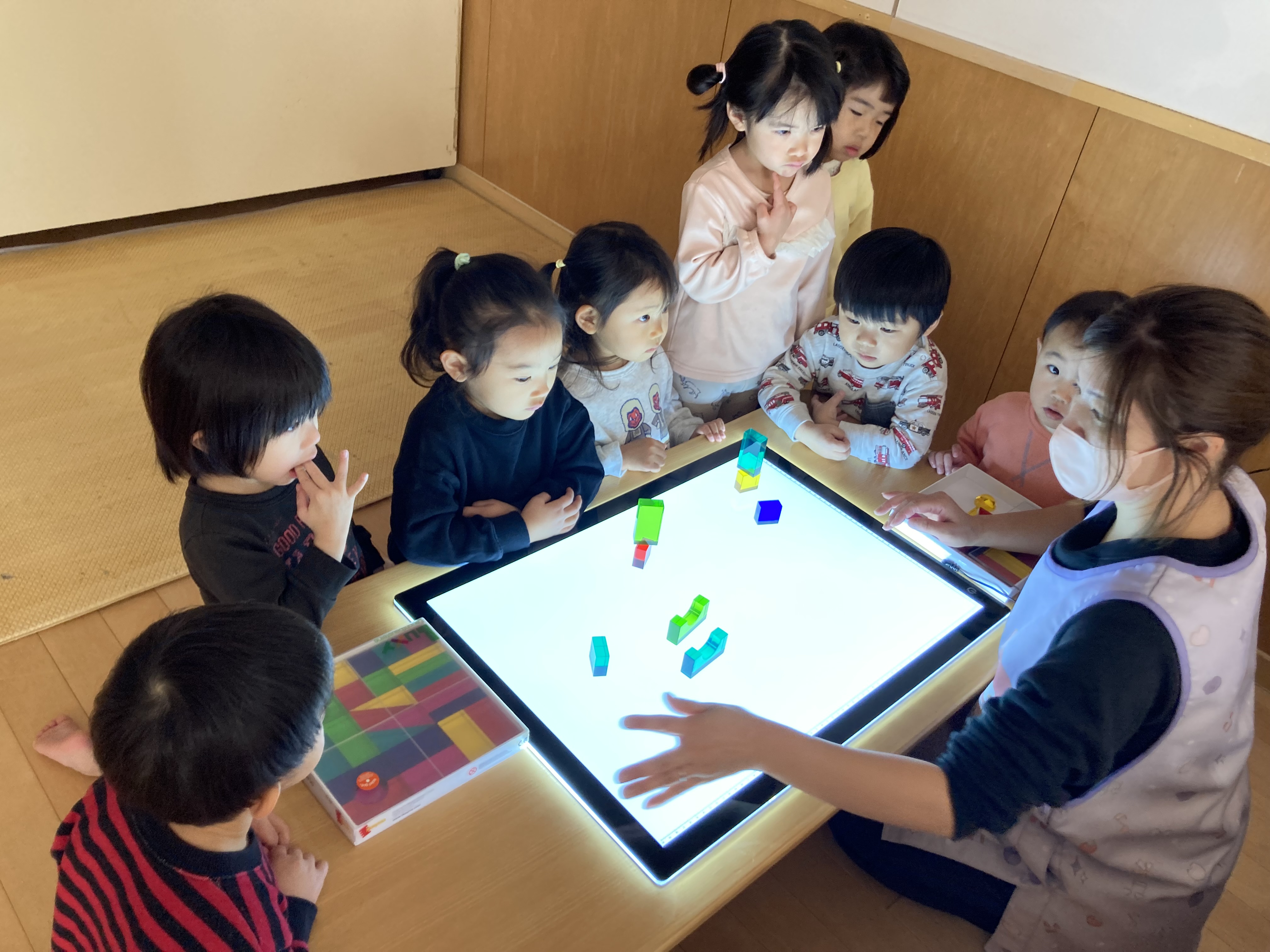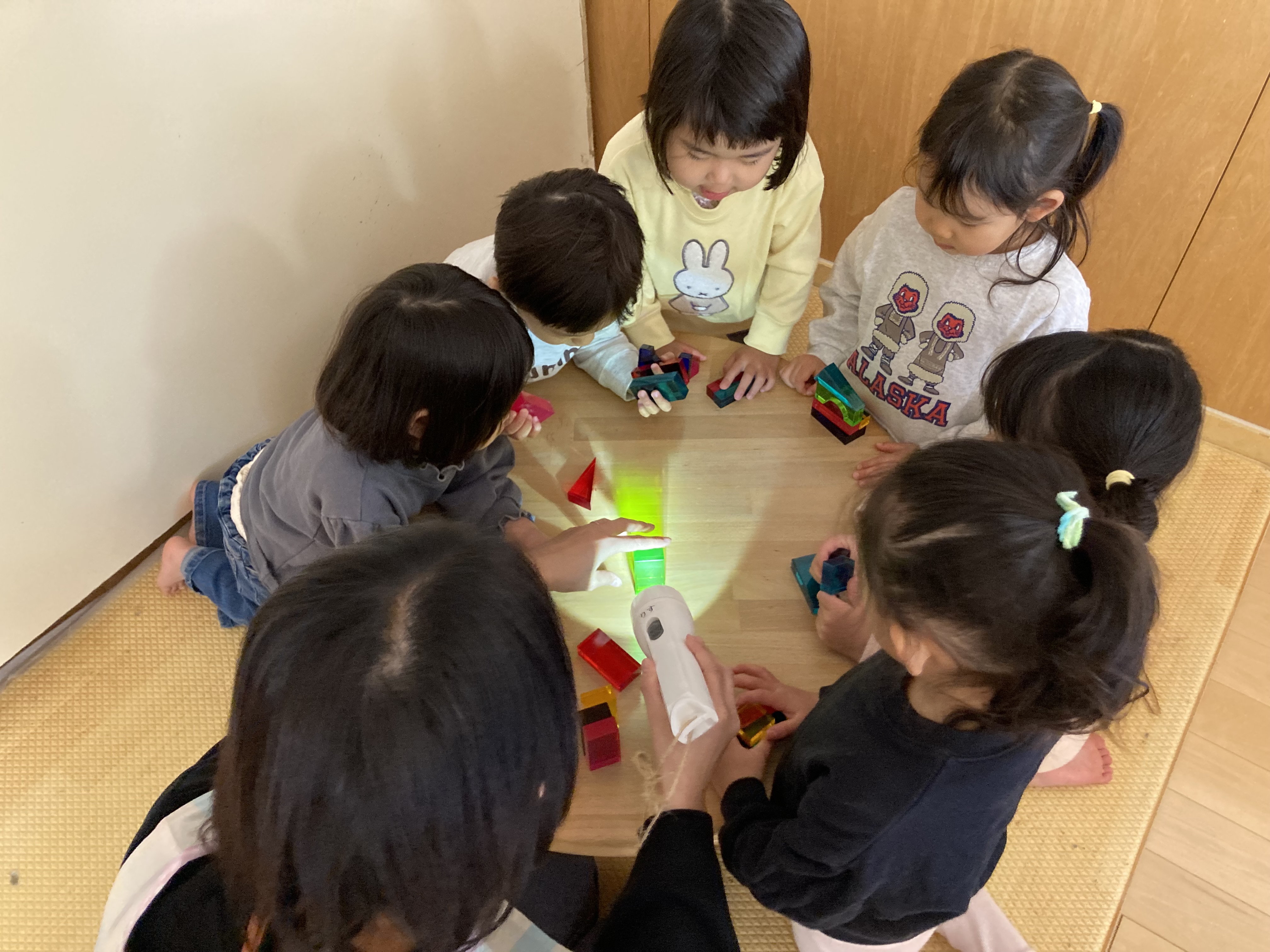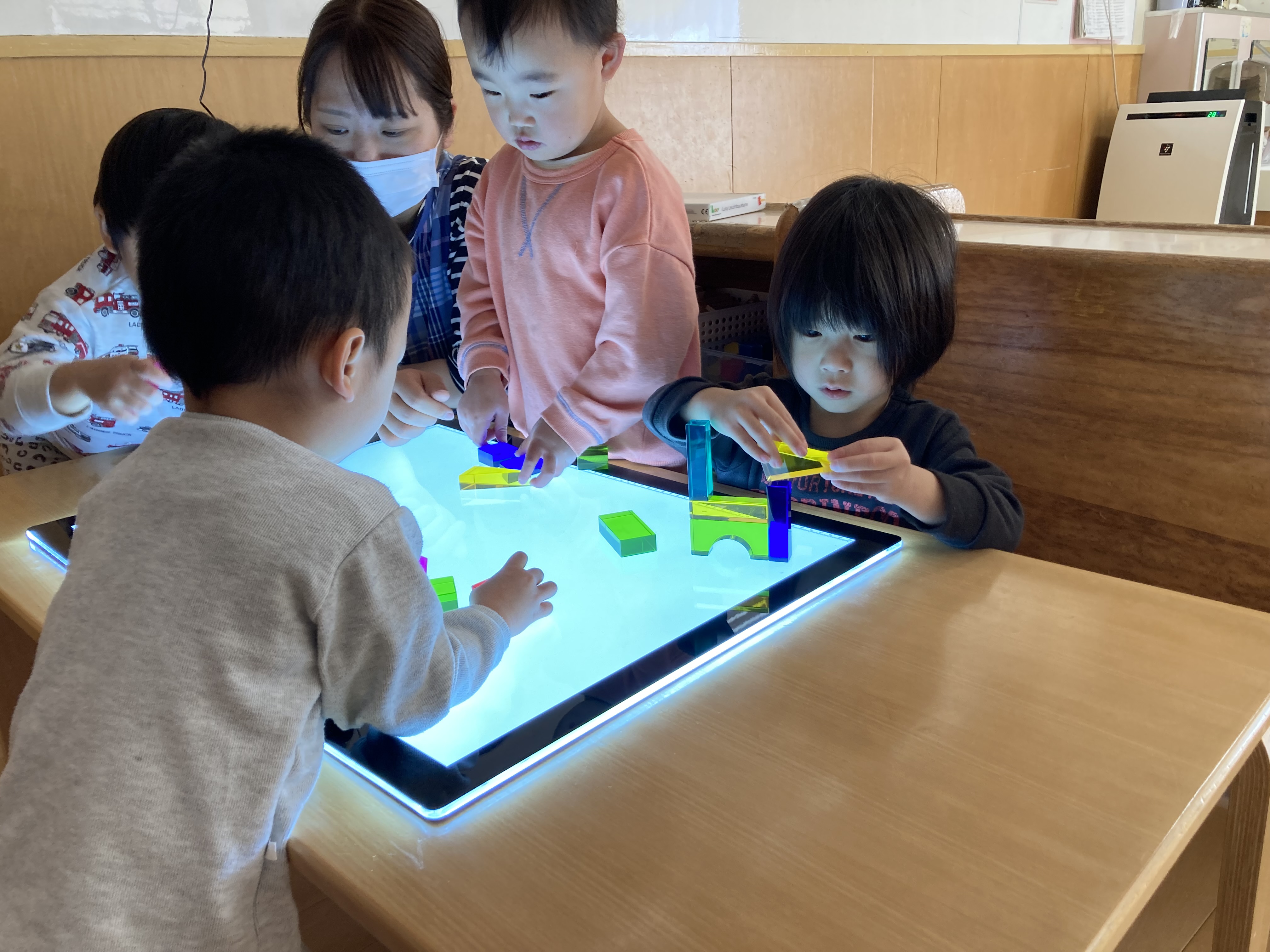 ピカピカ光る台の上に、透明な積み木をそーっと置いてみると…「わあ〜!」「きれい〜!」と、興味津々の子どもたち!光に照らされた積み木は、まるで宝石みたいにキラキラしていました✨
