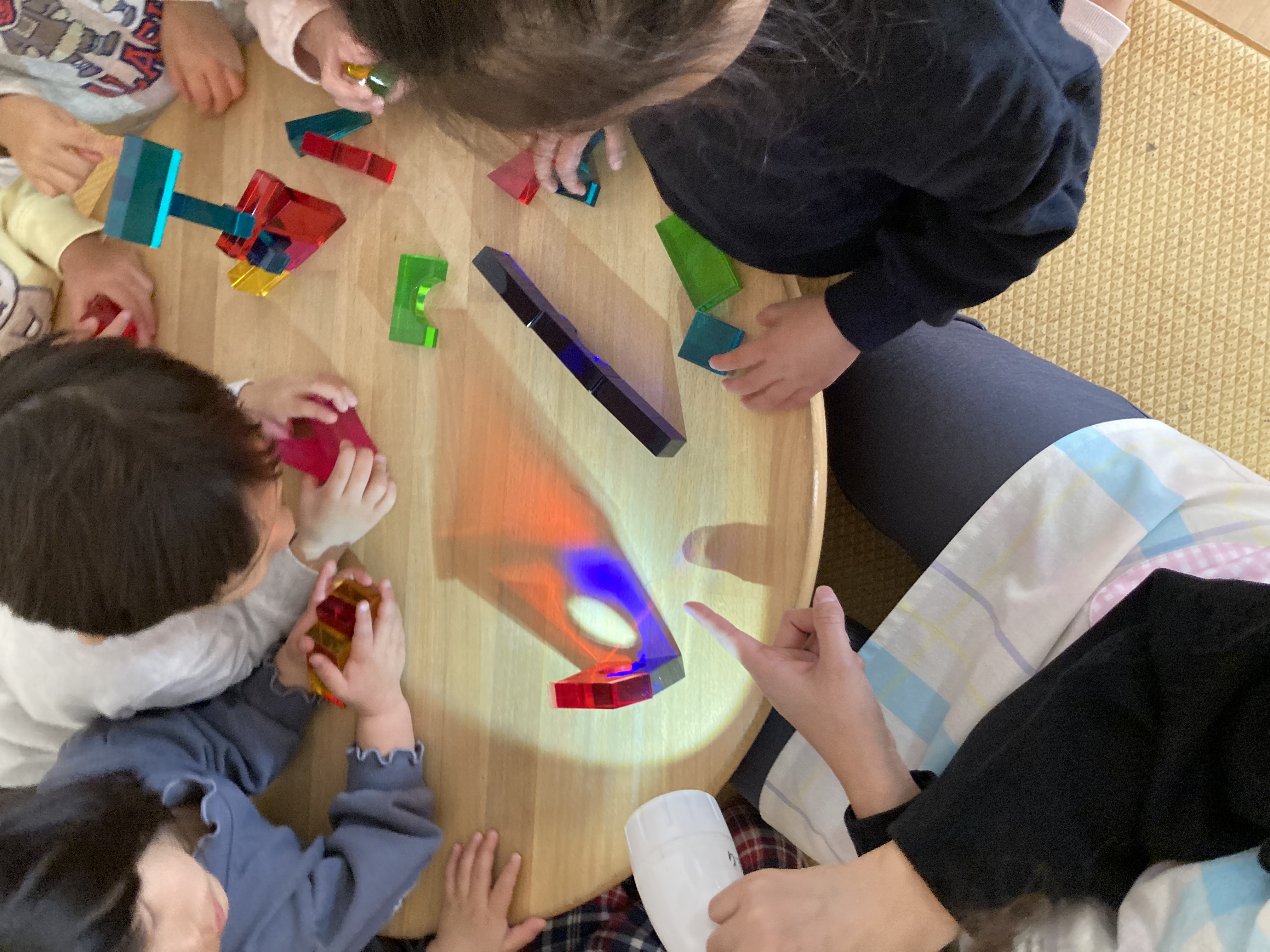 今回はトレース台とクリスタル積み木を使って、光と色のふしぎな世界で遊びました🌈