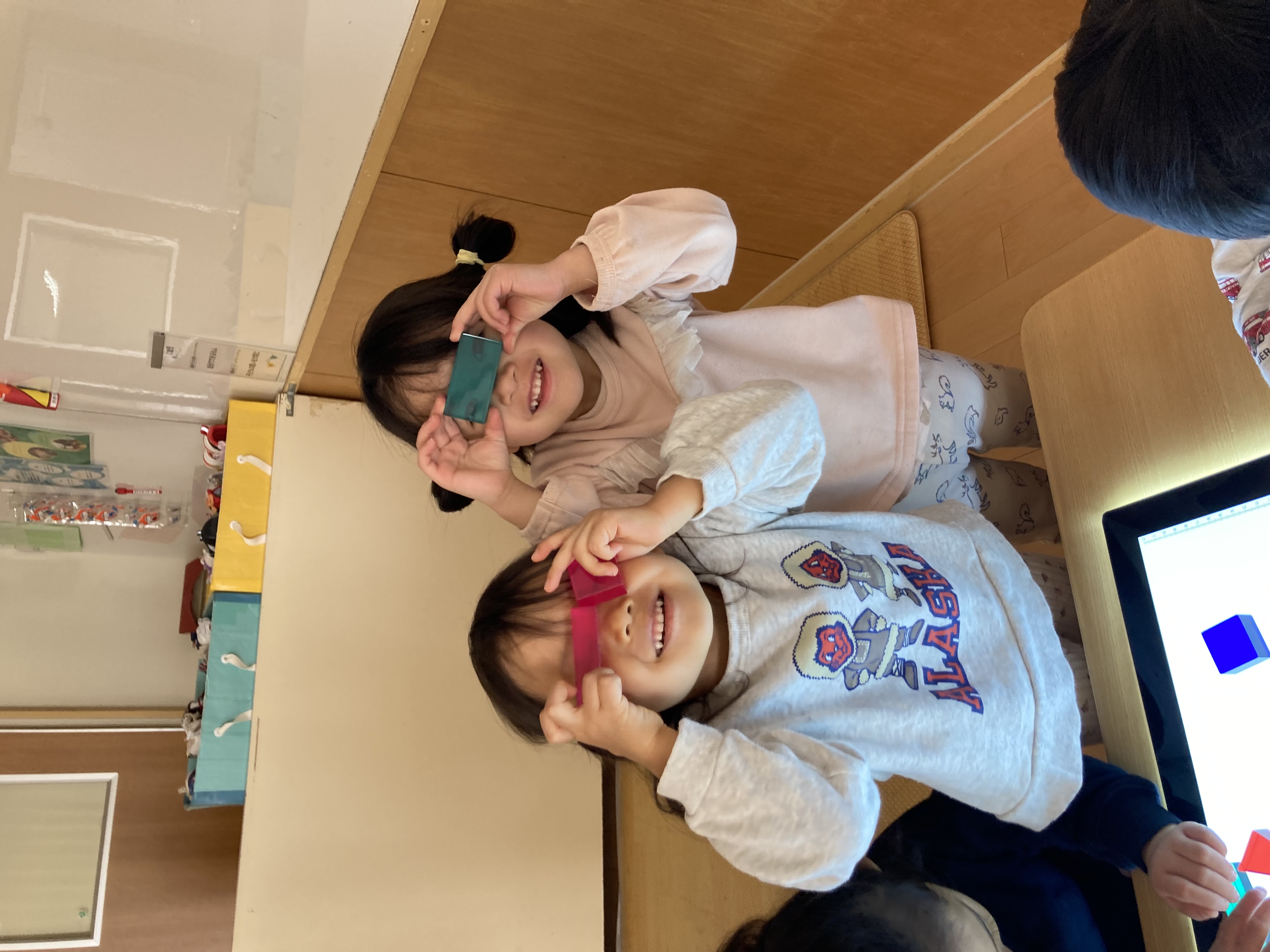 「ぼくも!」「わたしも〜!」と、次々に手をのばして、お気に入りの色を選んで、積んだり、並べたり。積み木を重ねると色が変わったり、床に影ができたりして、「あか!」「あお!」と色の名前を楽しそうにおしゃべりする姿も見られました♡