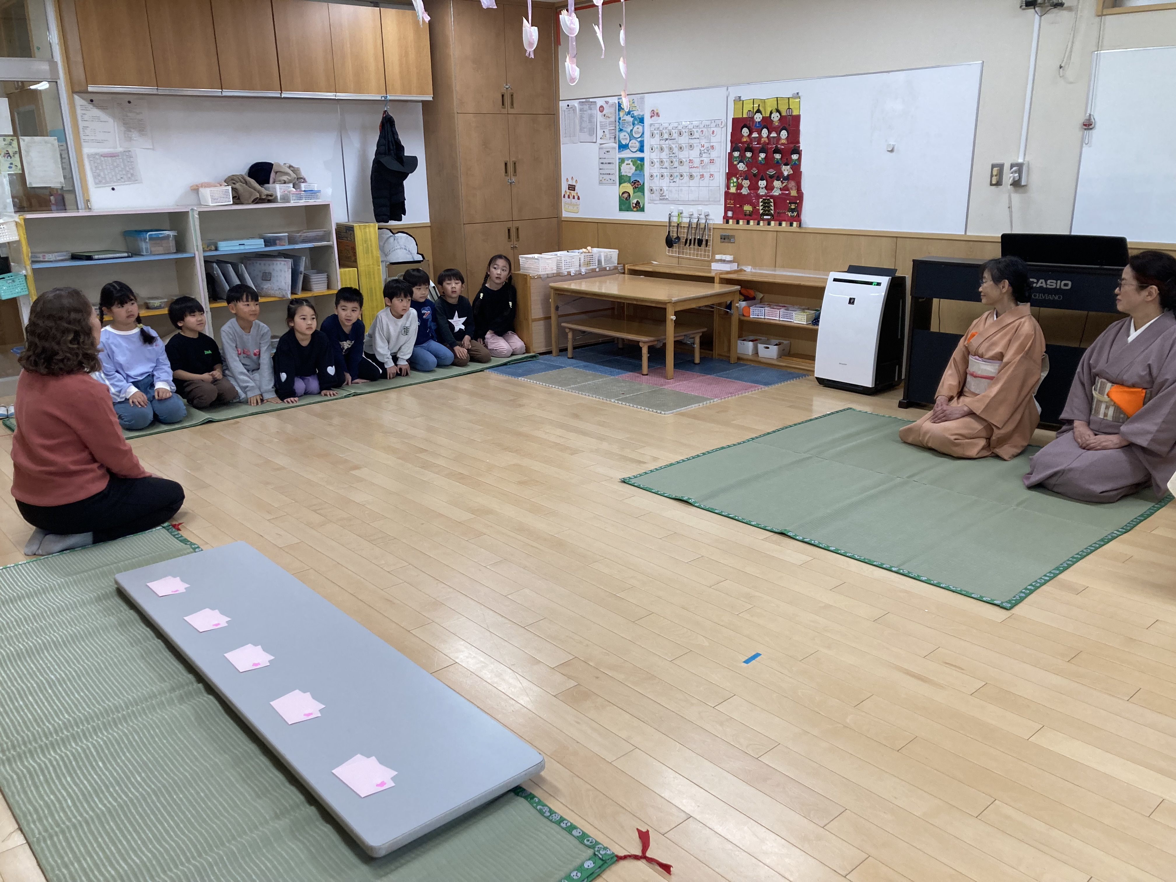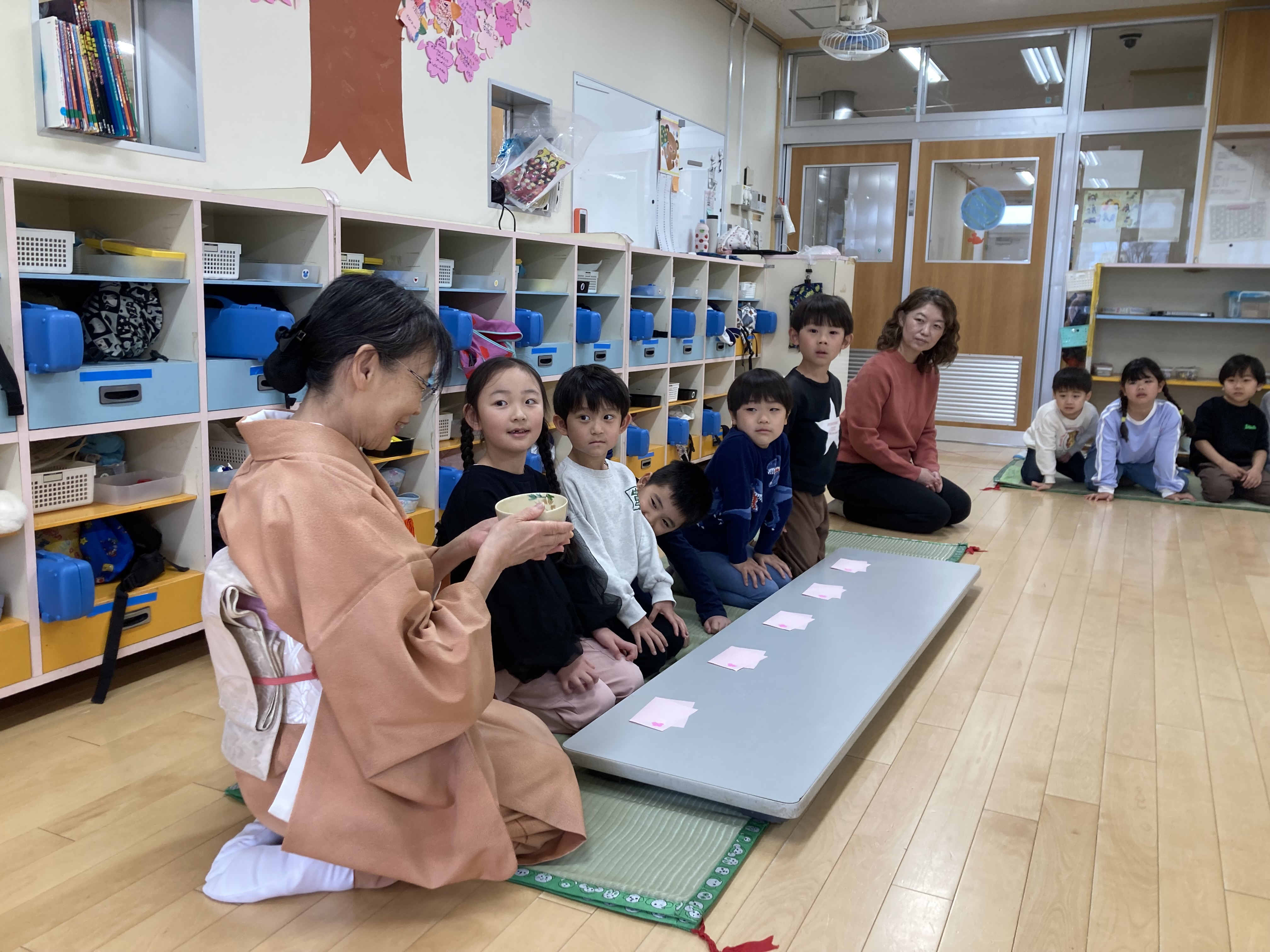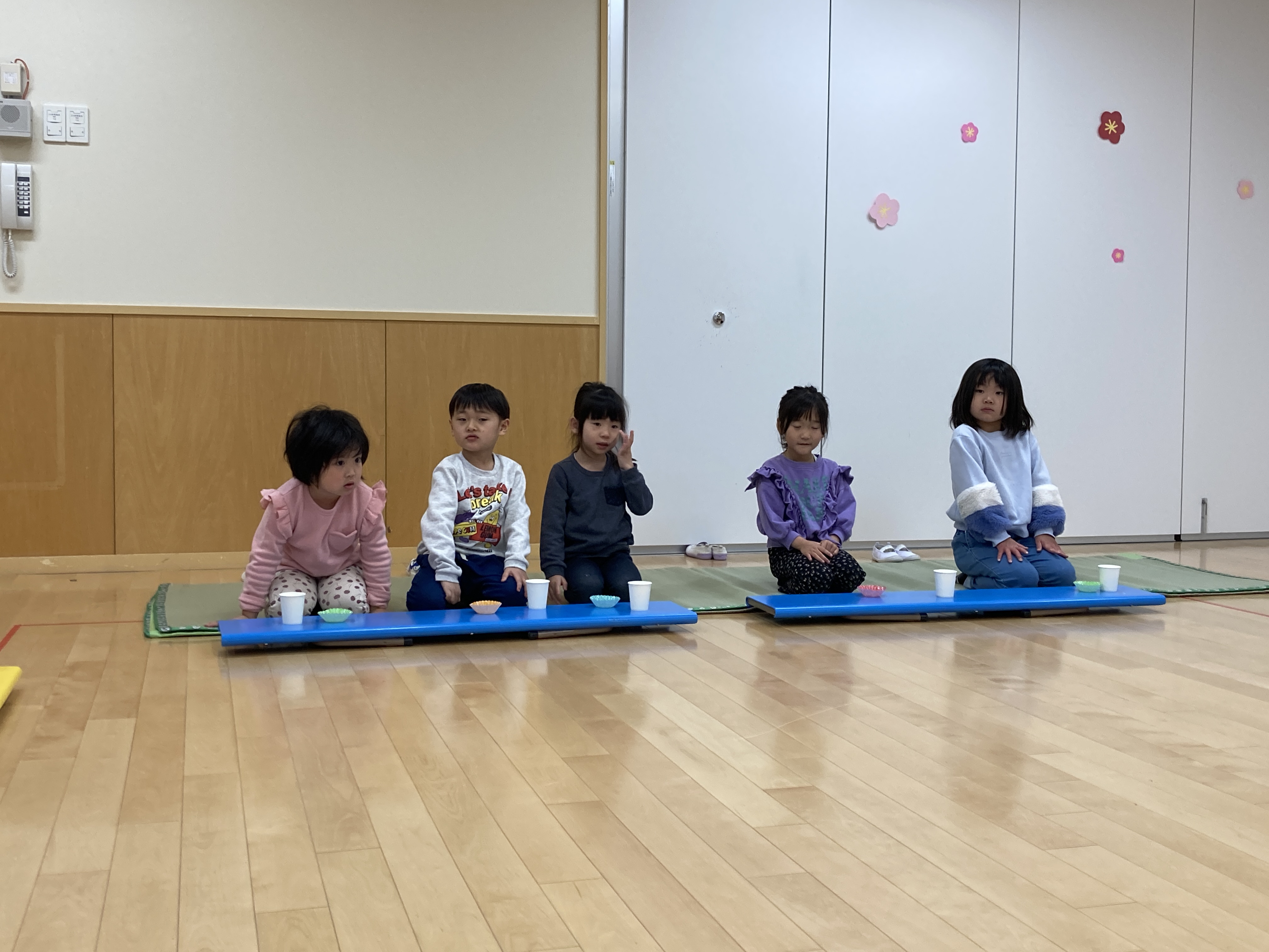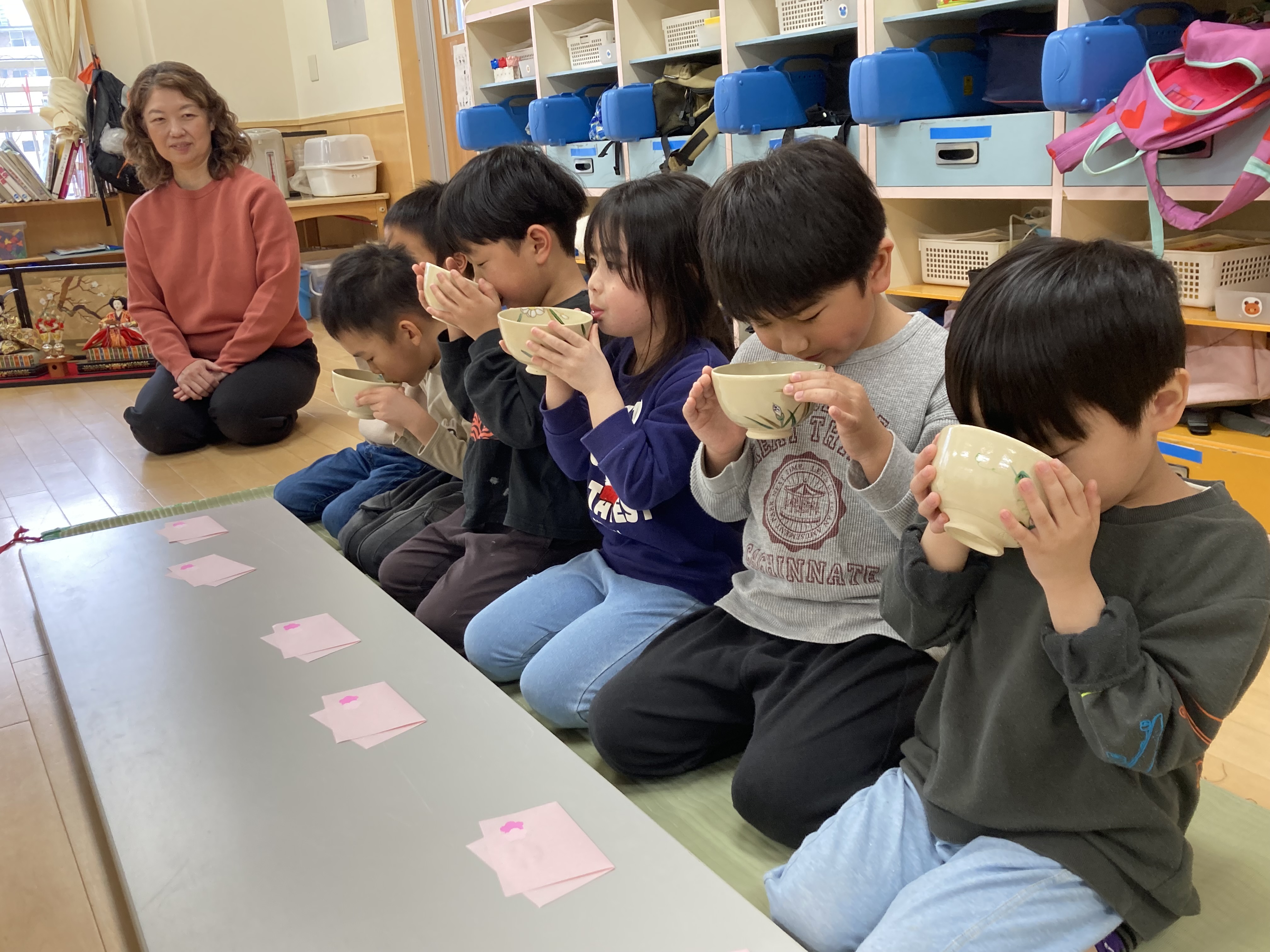 1歳~4歳クラスは、ひな祭りの由来を聞いたり、ひなあられとジュースを頂き、ひな祭りの雰囲気を味わいました。5歳児クラスは茶道の先生をお向かいして、本格的なお茶会が開かれて貴重な体験ができました。