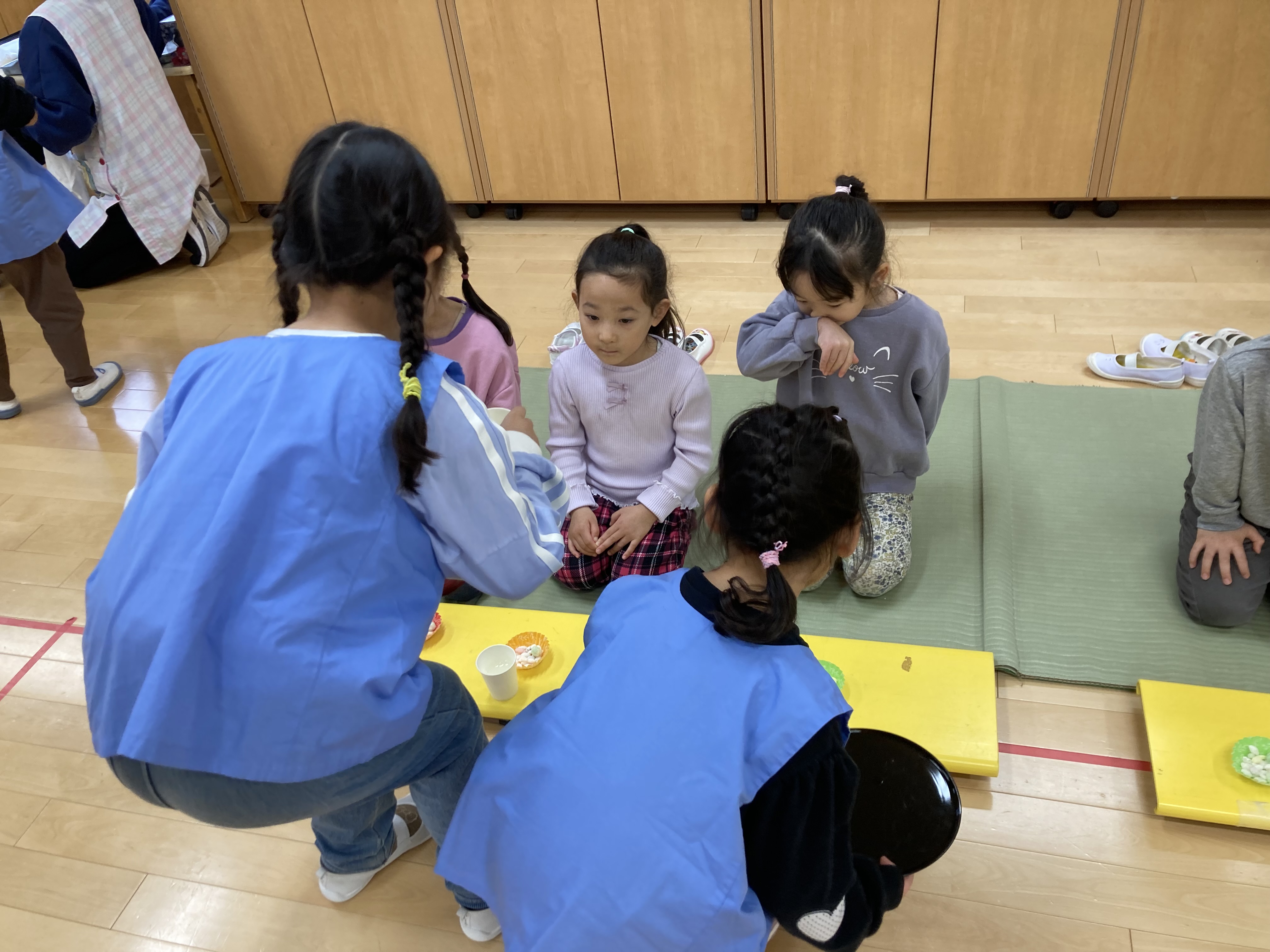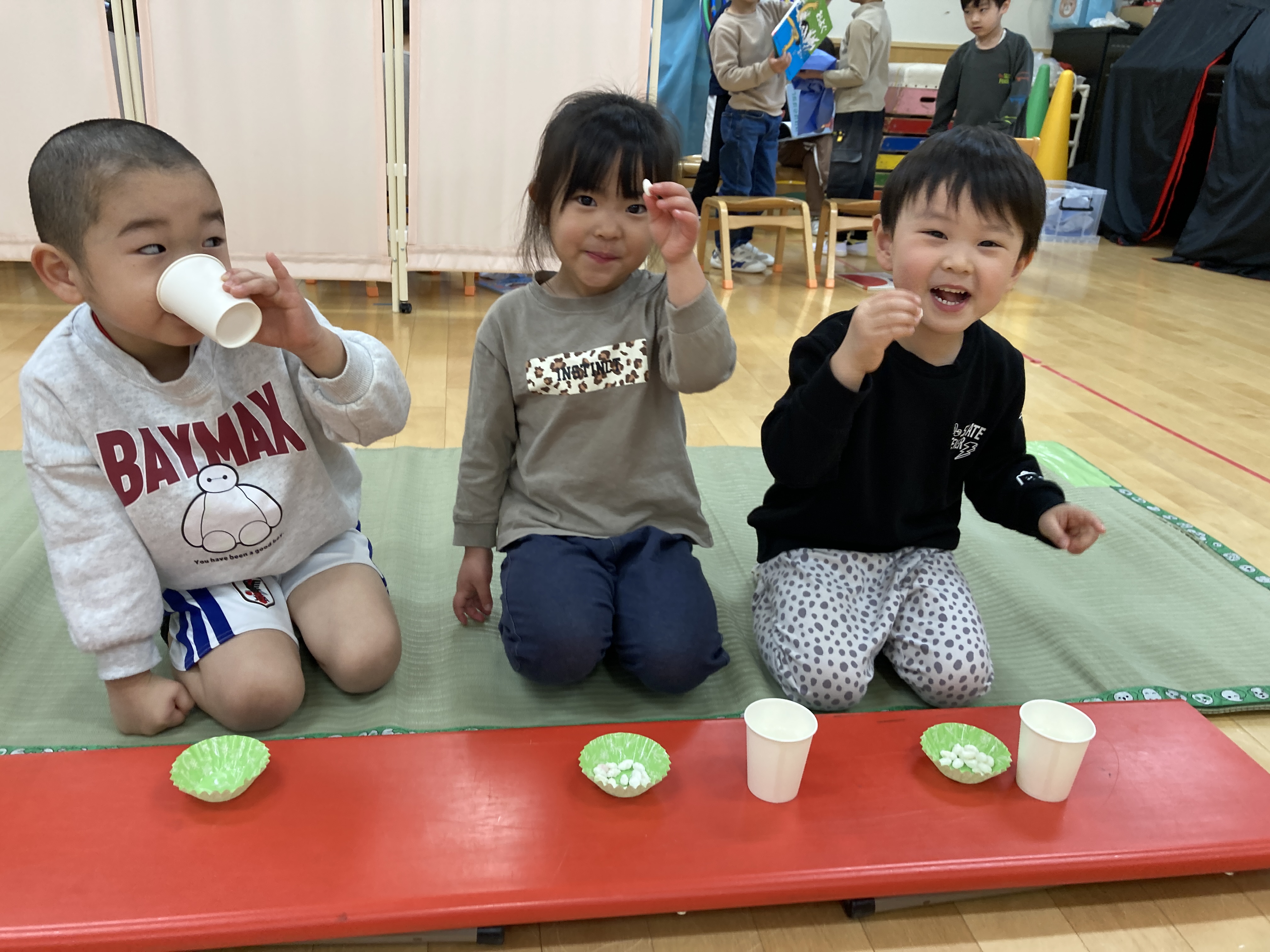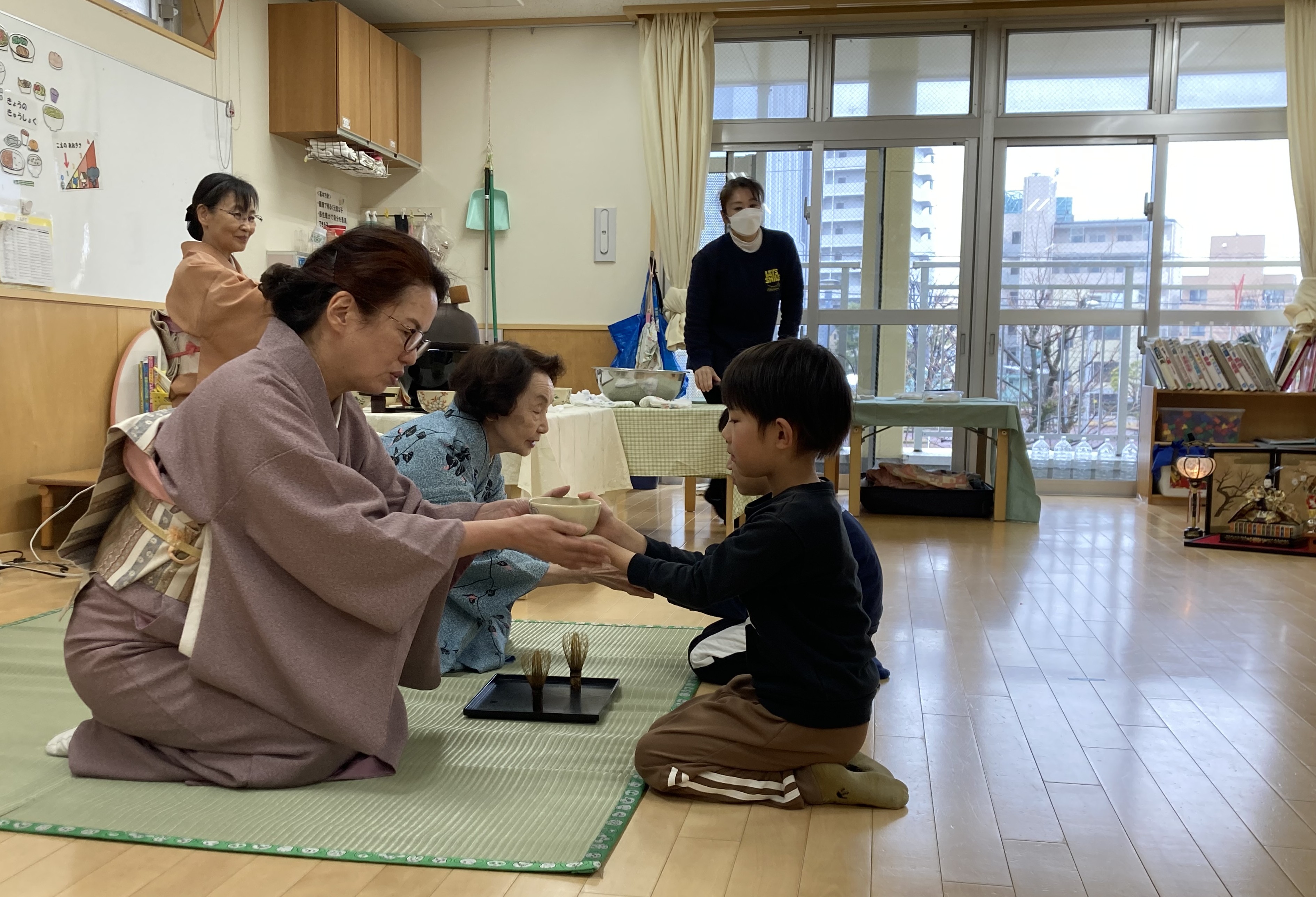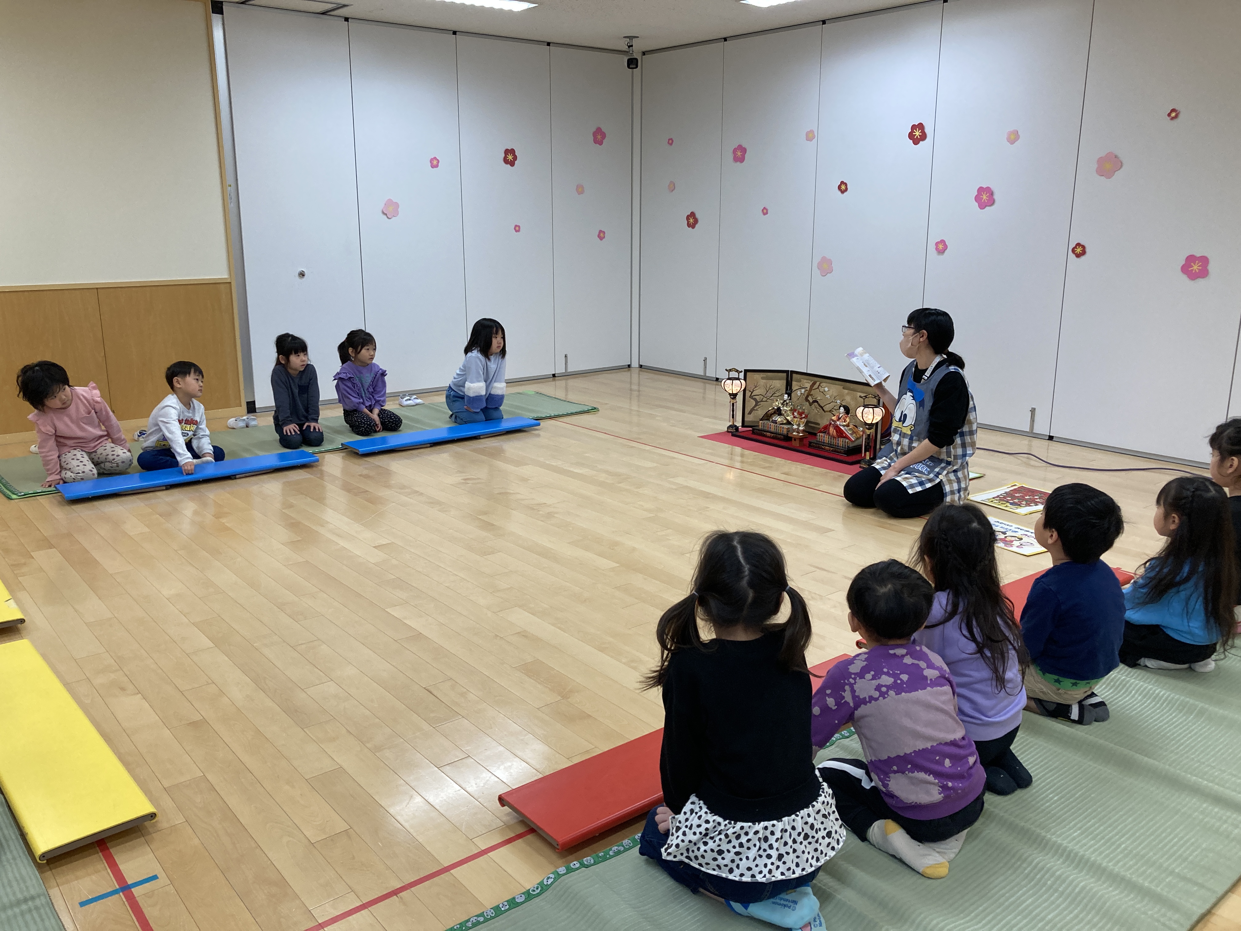 1歳~4歳クラスは、ひな祭りの由来を聞いたり、ひなあられとジュースを頂き、ひな祭りの雰囲気を味わいました。5歳児クラスは茶道の先生をお向かいして、本格的なお茶会が開かれて貴重な体験ができました。