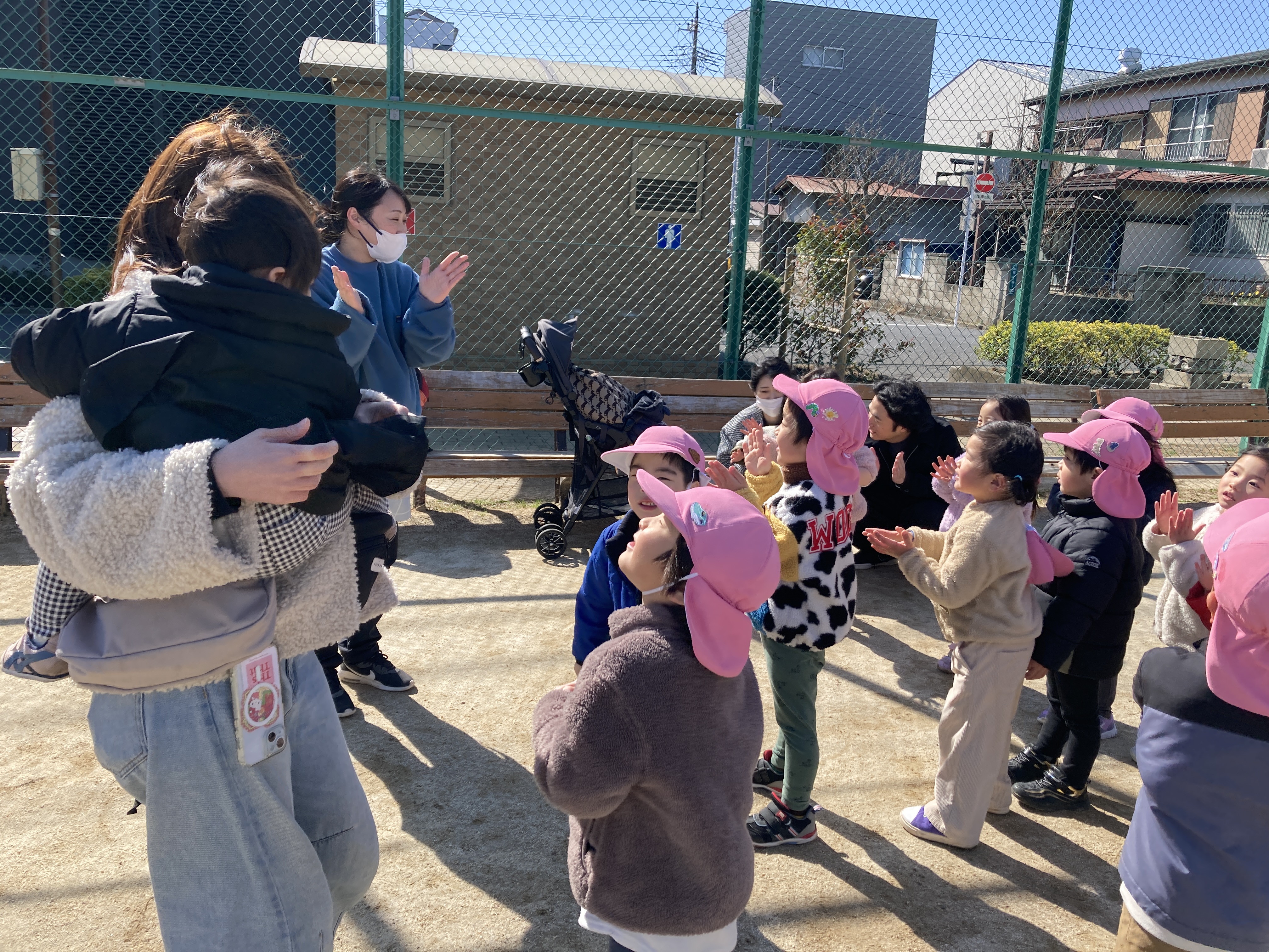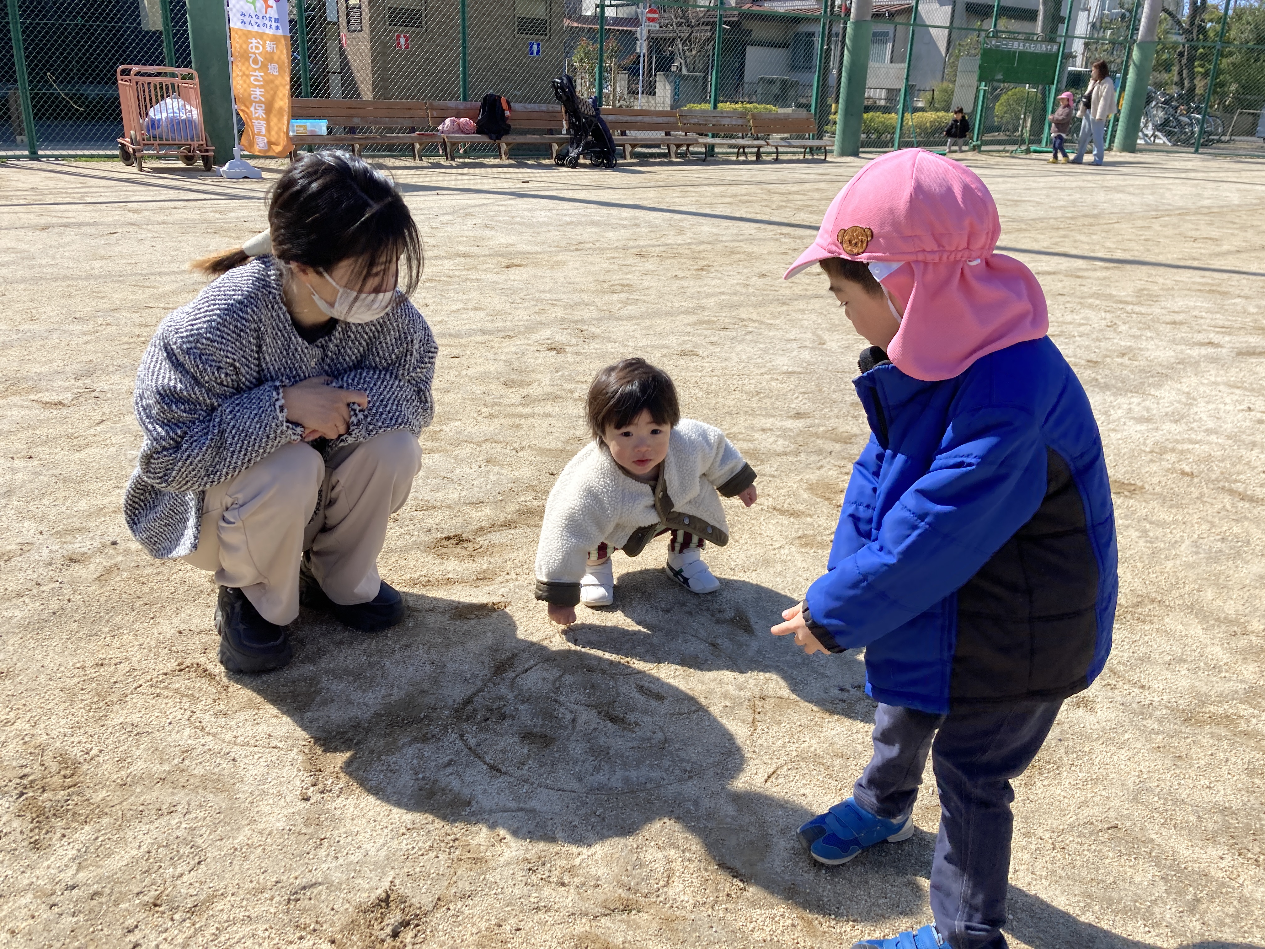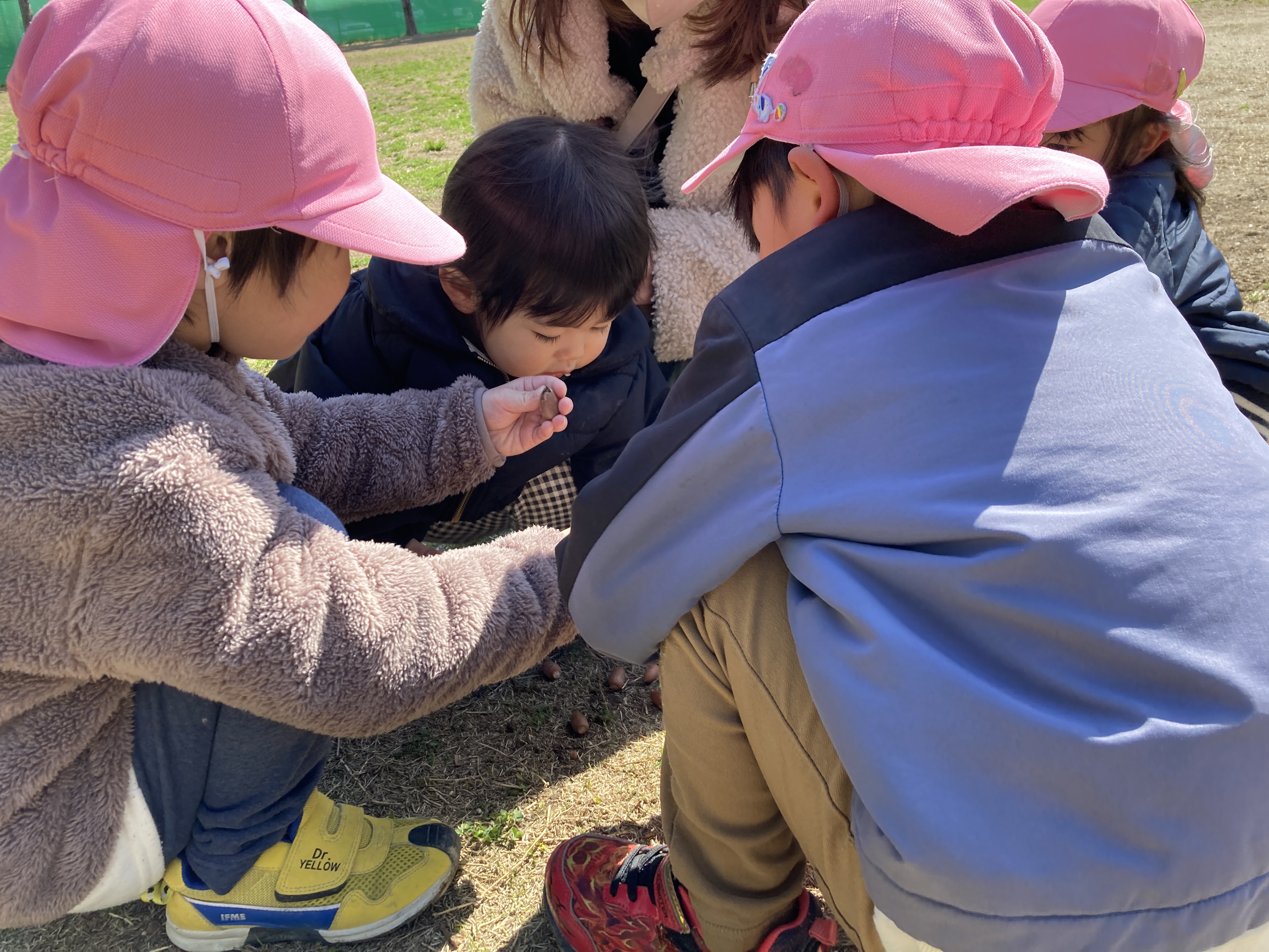 手遊びの後は、気持ちの良いお天気の中、シャボン玉を追いかけたり、どんぐりや葉っぱを探したり、地面に絵を描いたり、いないいないばあっ!をしたりと、様々な遊びを楽しんでいました。