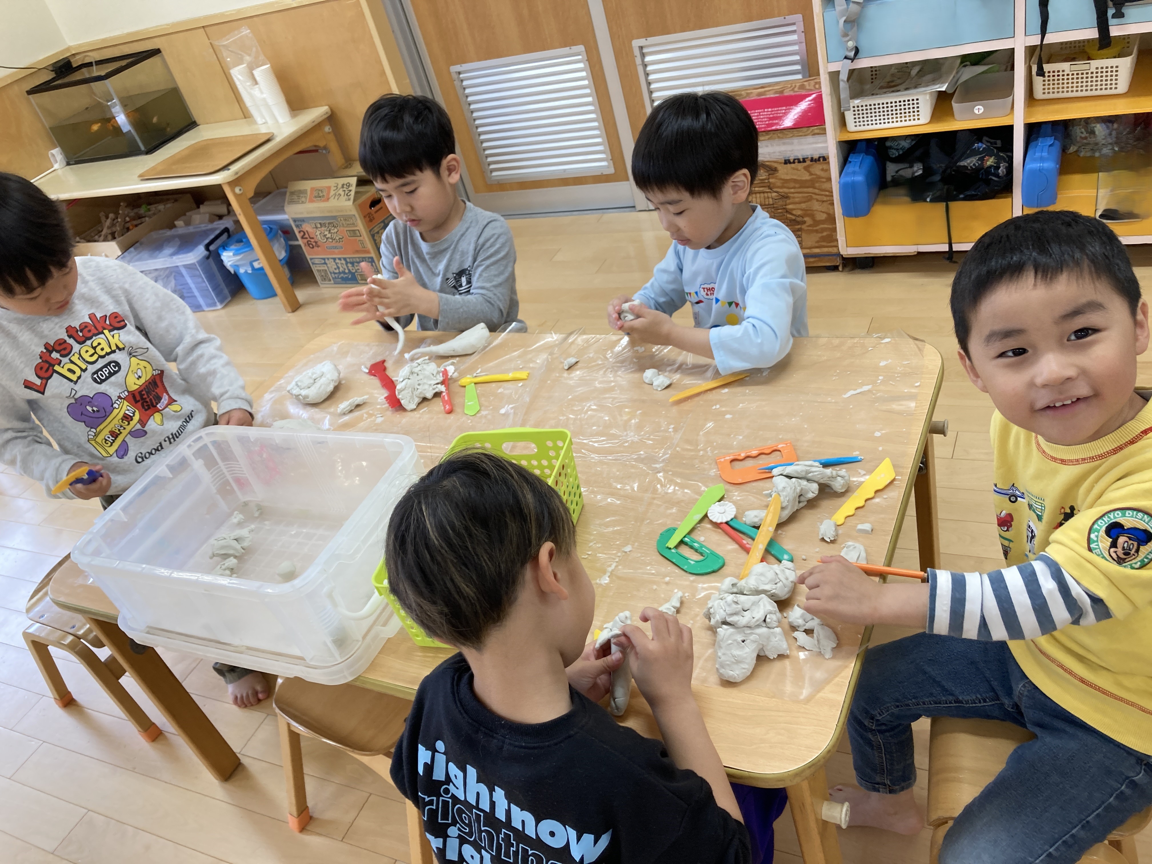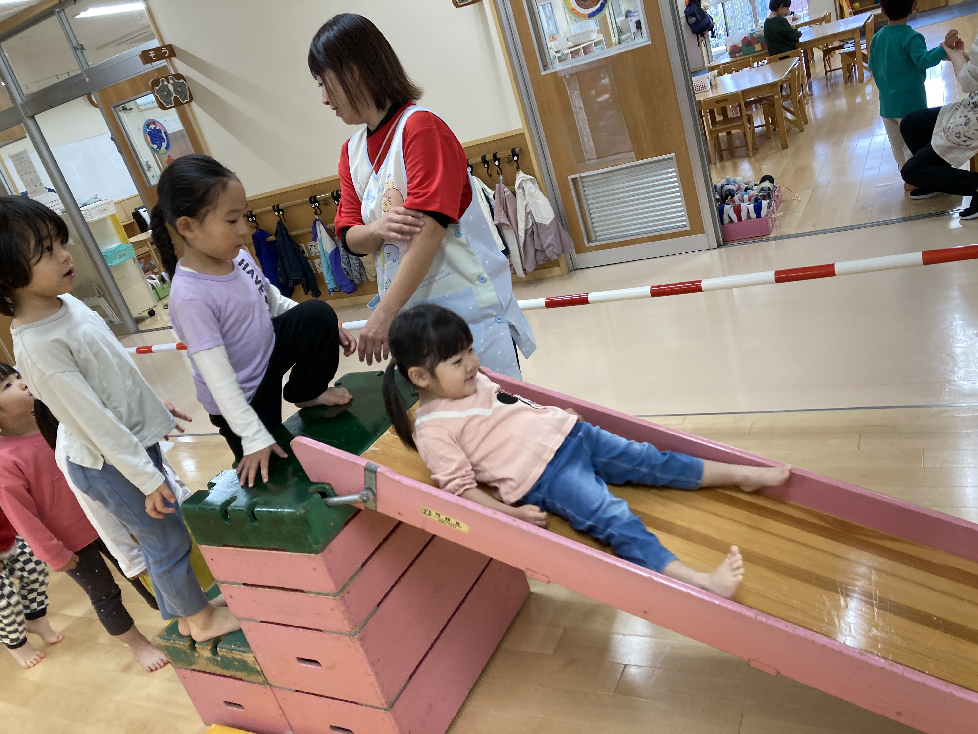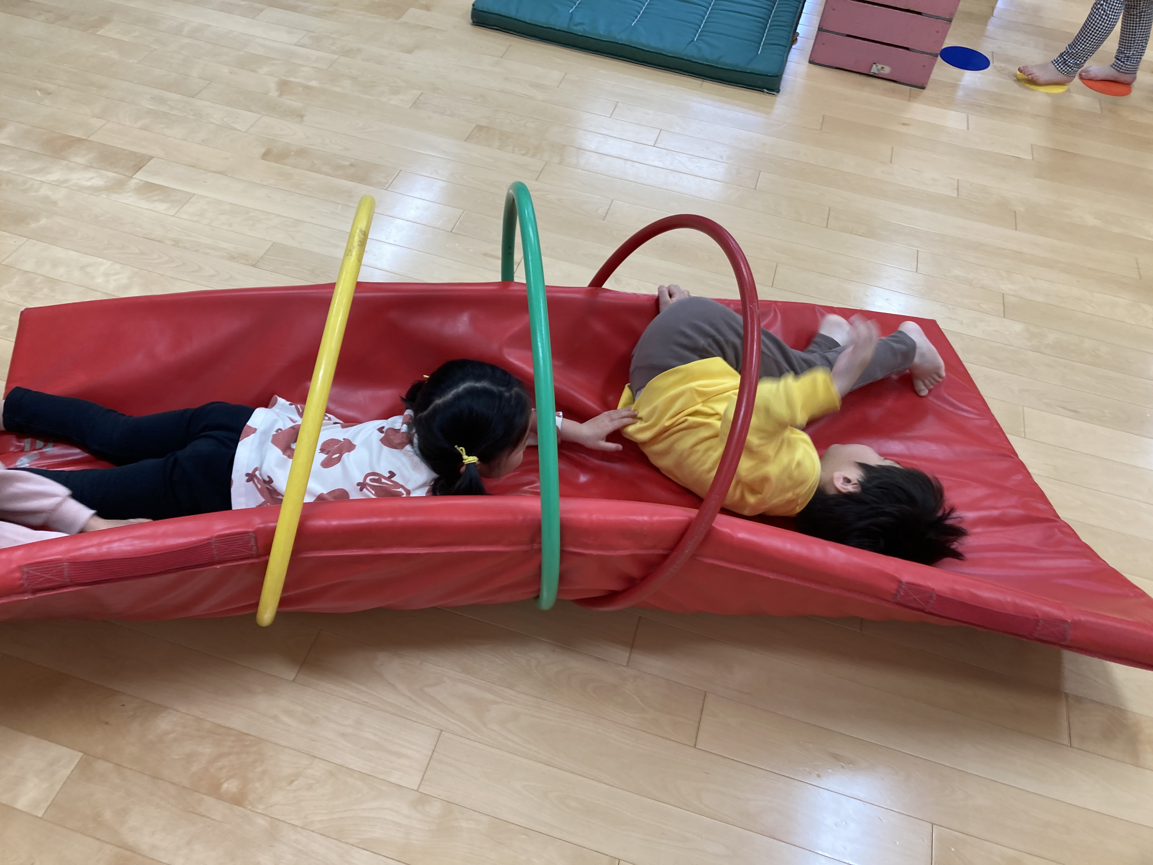 今日は運動遊びやラキュー,粘土等さまざまな遊びのコーナーを用意して好きな場所へ自由に行って遊びました。じっくり遊び込む子、色々なコーナーを引っ越しながら楽しむ子…とそれぞれがわくわくしながら楽しむ姿に嬉しく思いました!