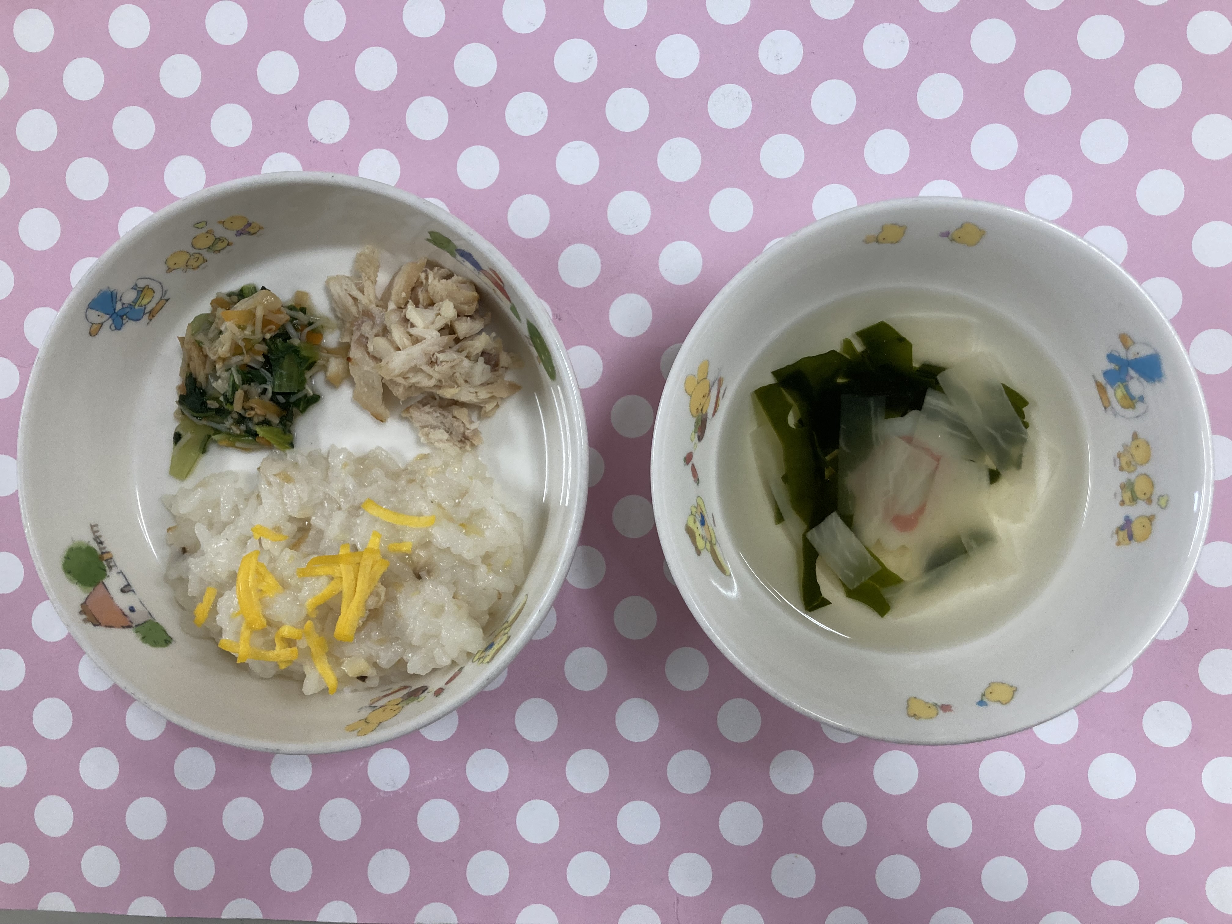 春らしい彩りの素敵なご飯でした。すまし汁にはパンダの絵の付いたかまぼこがかくれんぼ♪