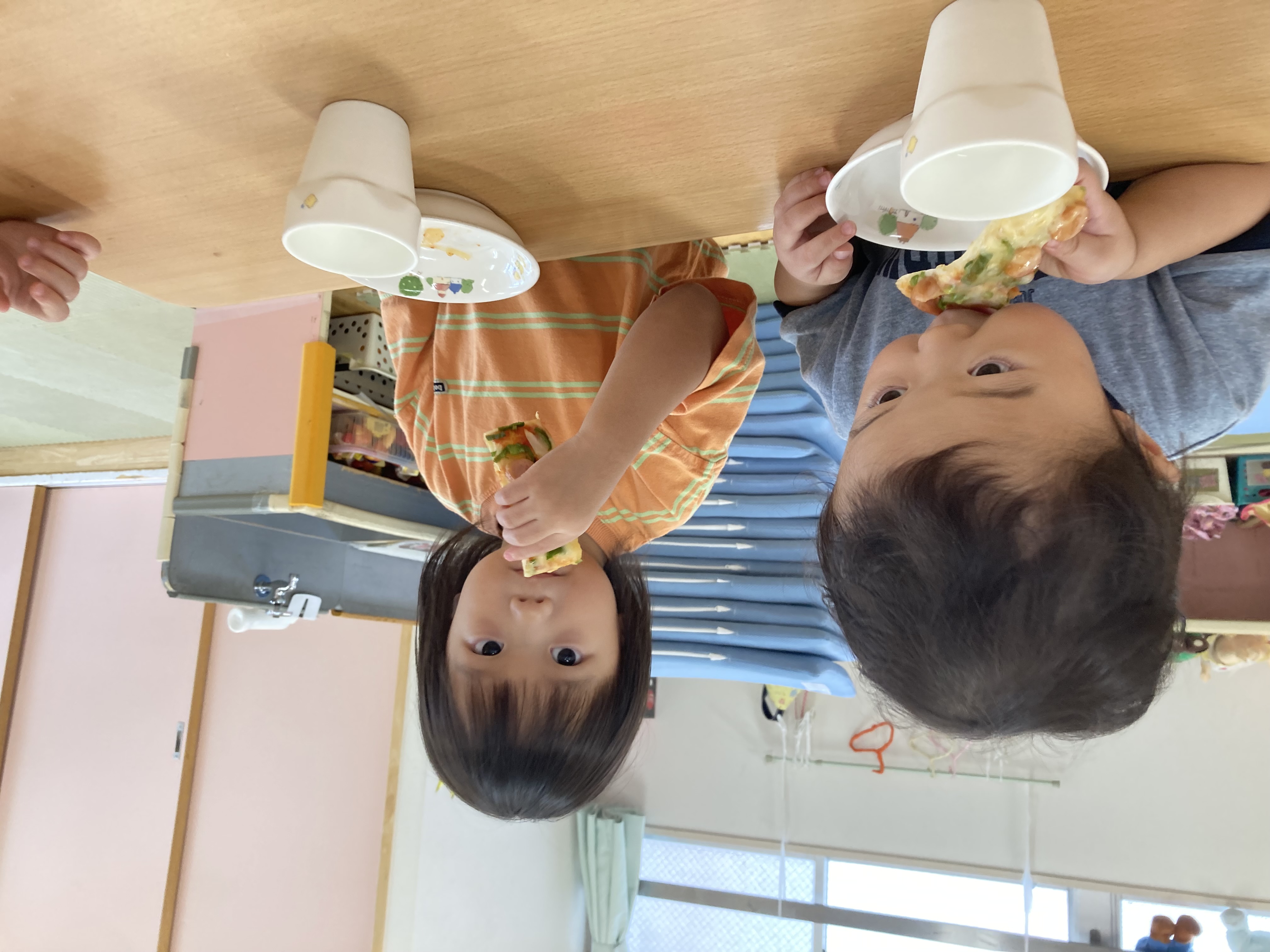 みんなで育てたピーマンは給食さんにお願いして、おやつのピザの具にして食べました!