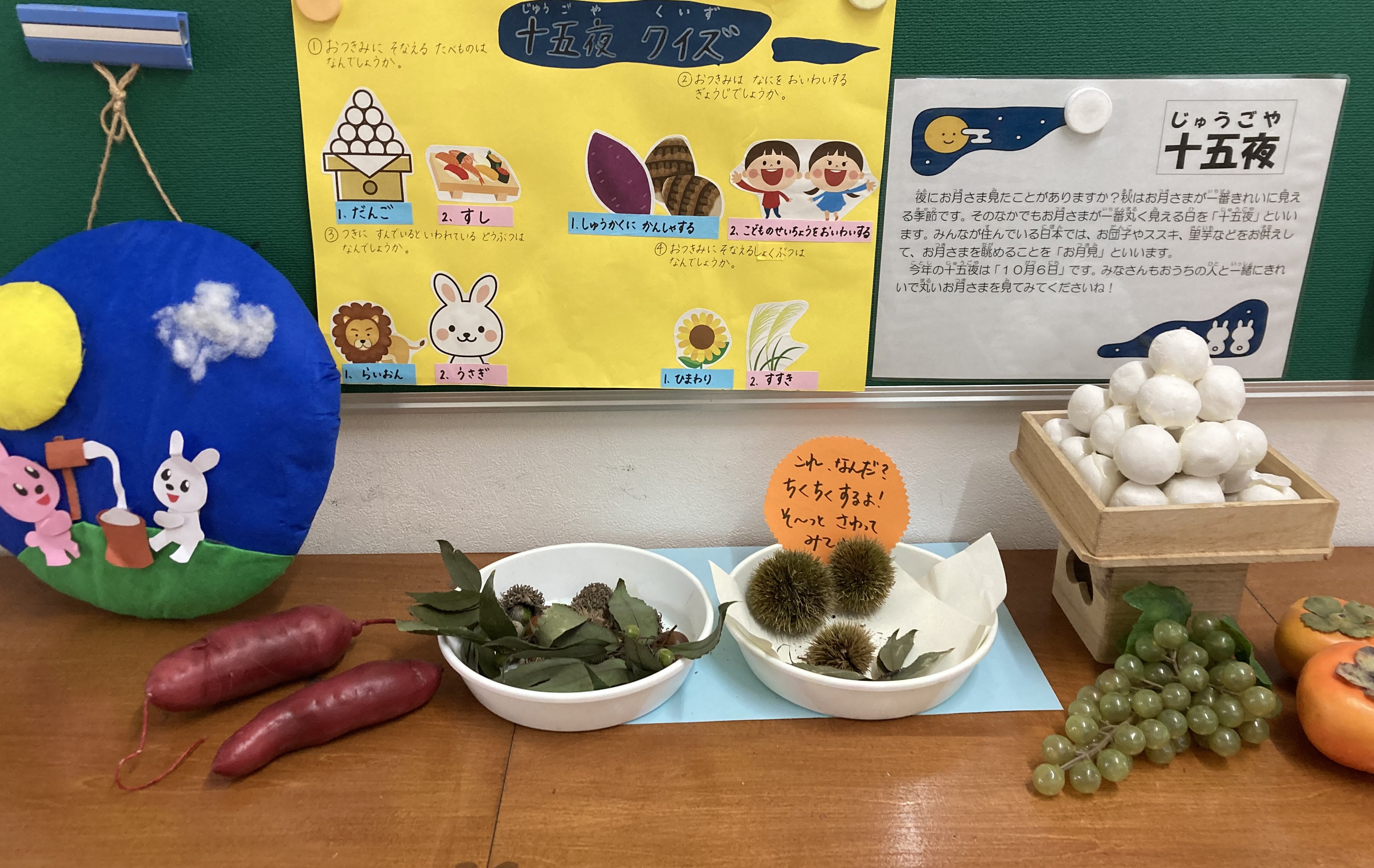 西葛西おひさま保育園では、十五夜やお月見に関する紙芝居の読み聞かせや、各クラスで十五夜の製作を通して、どのような意味なのかを子どもたちに伝えてきました。