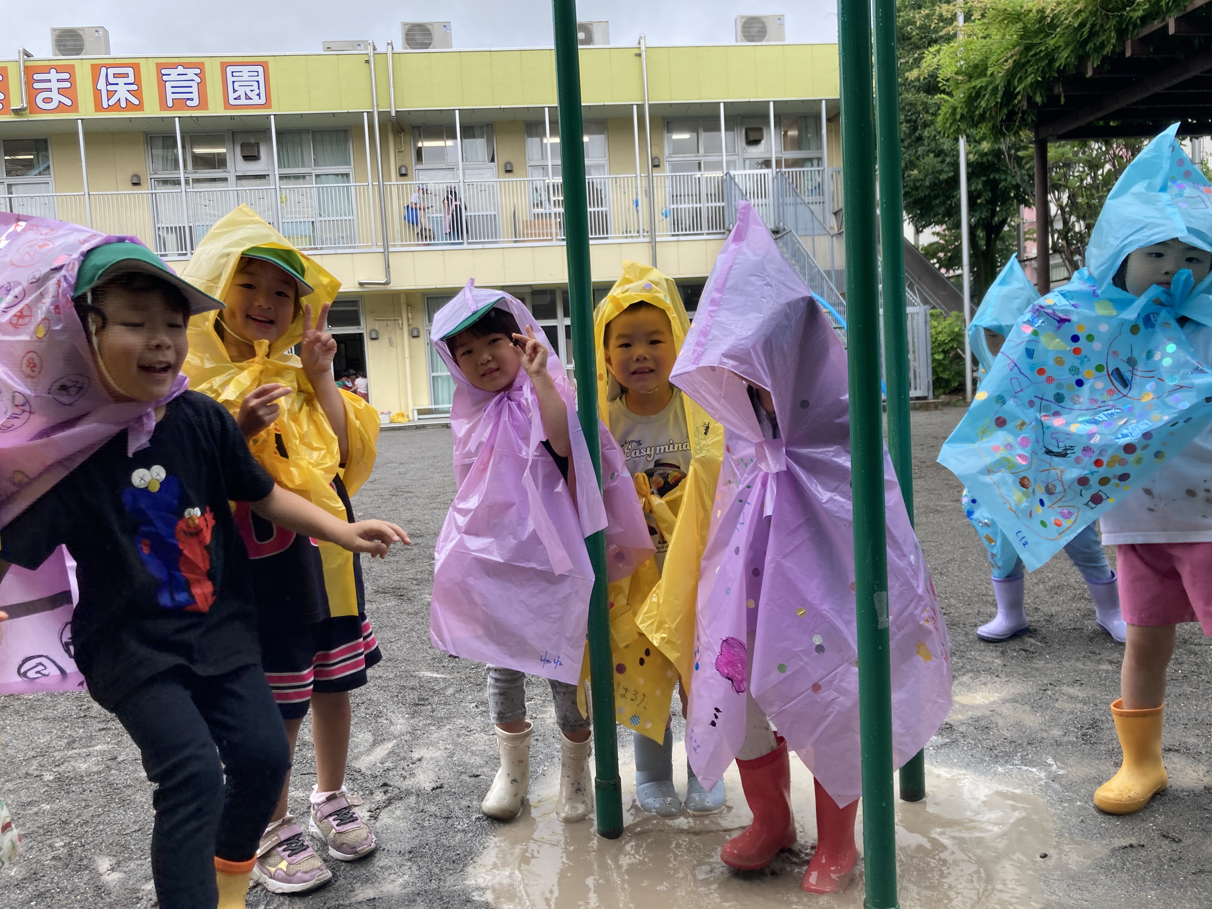 雨の日が続いた時はレインコートを自分達で作り、着用して園庭へ。