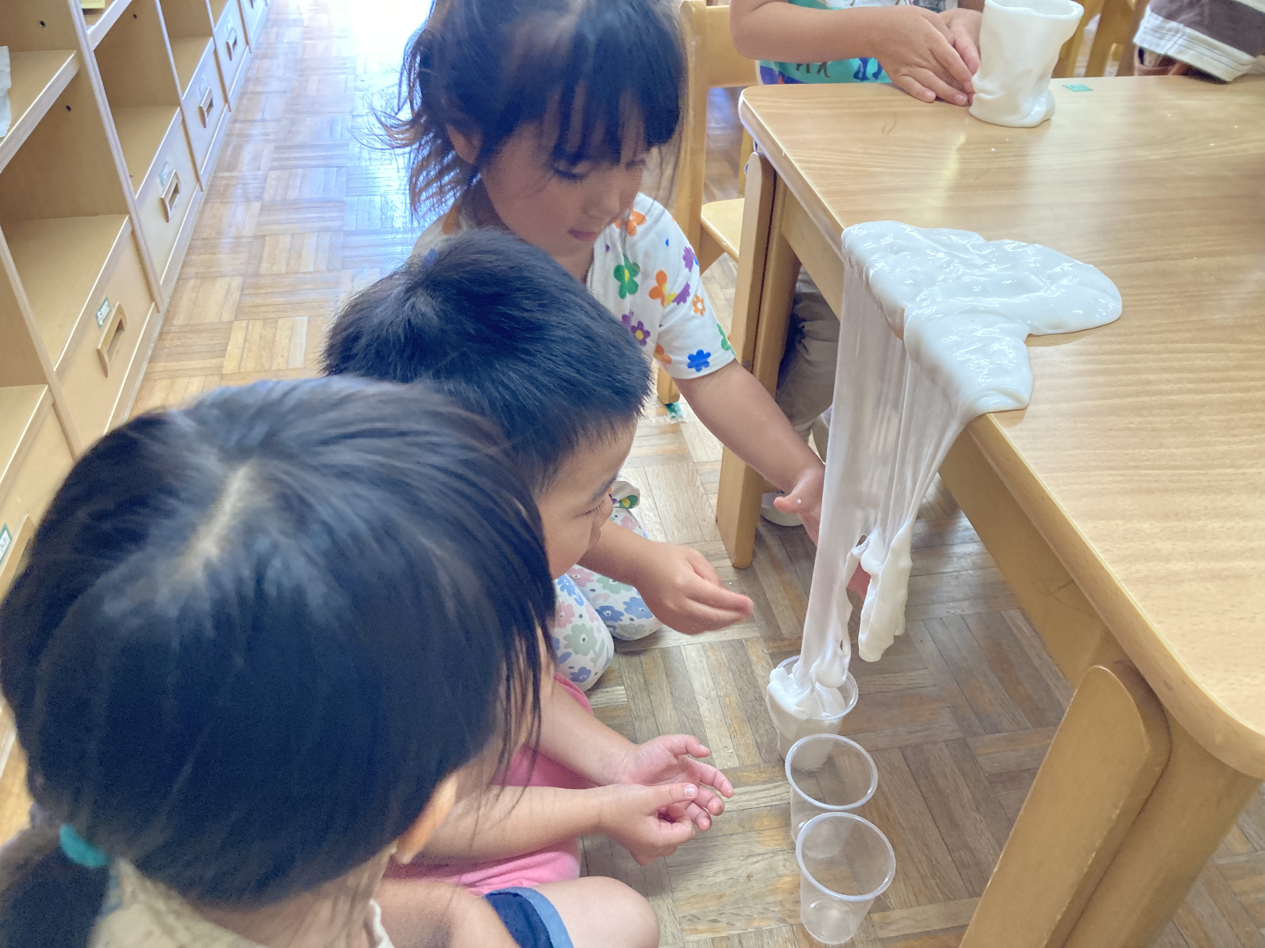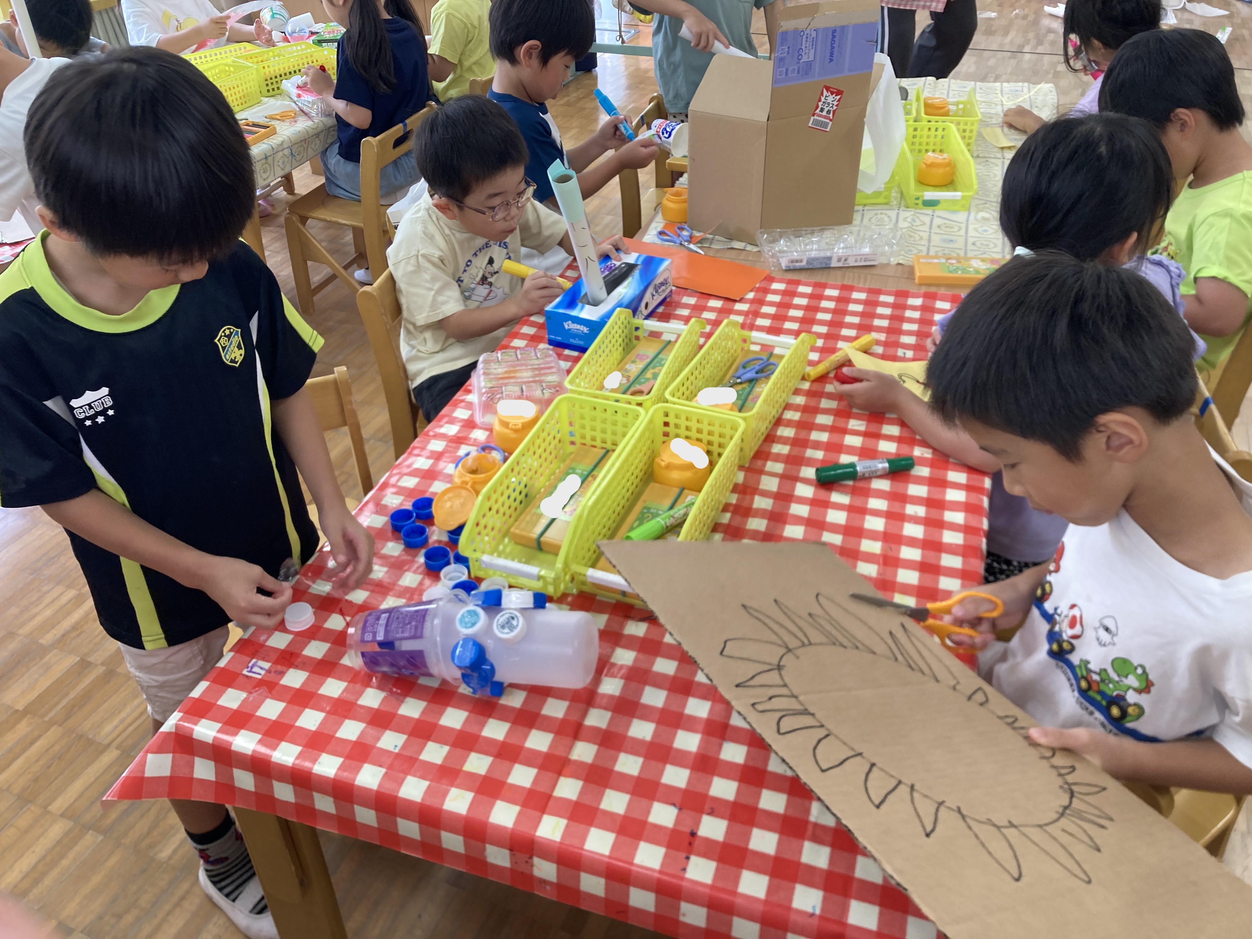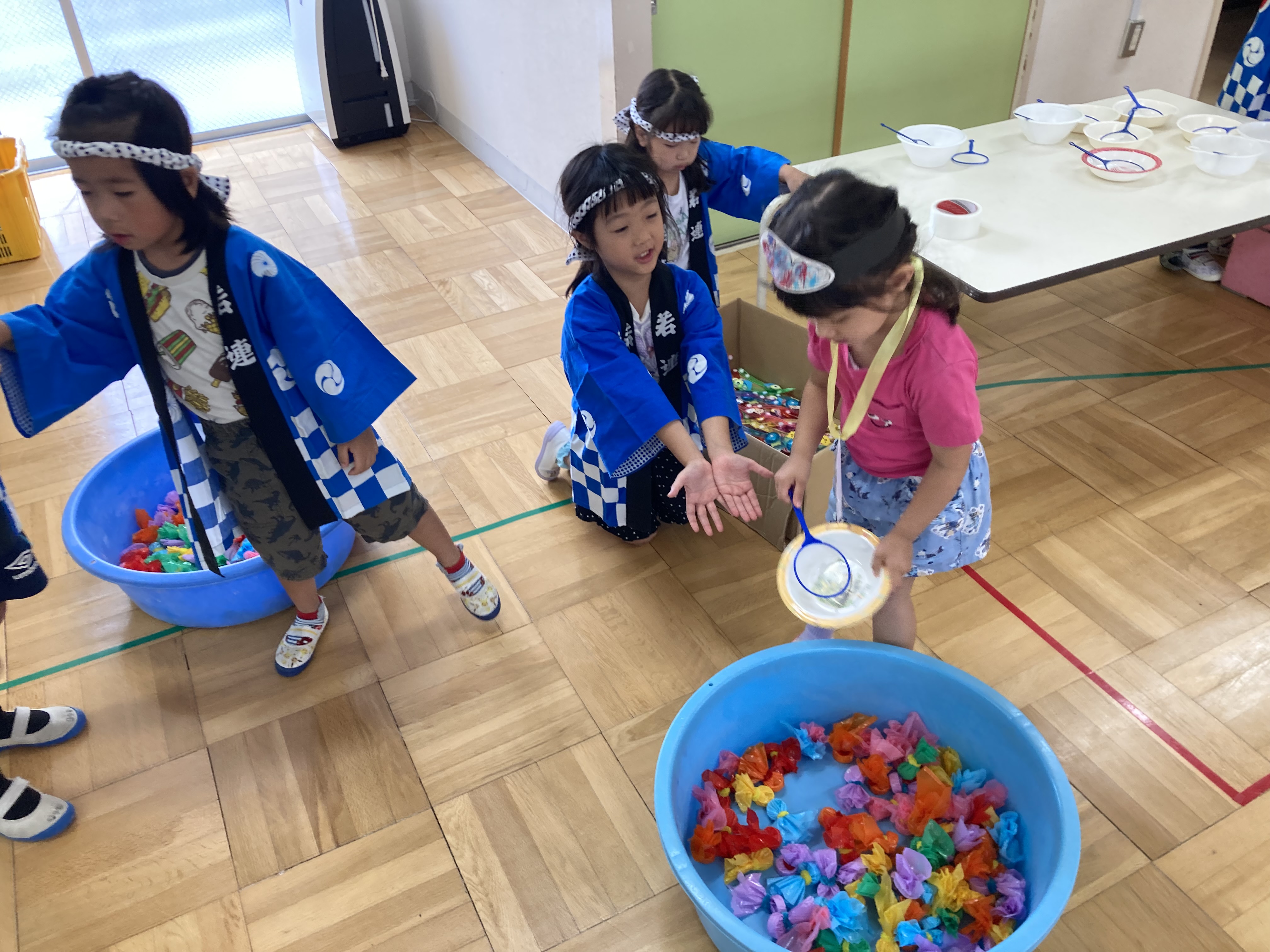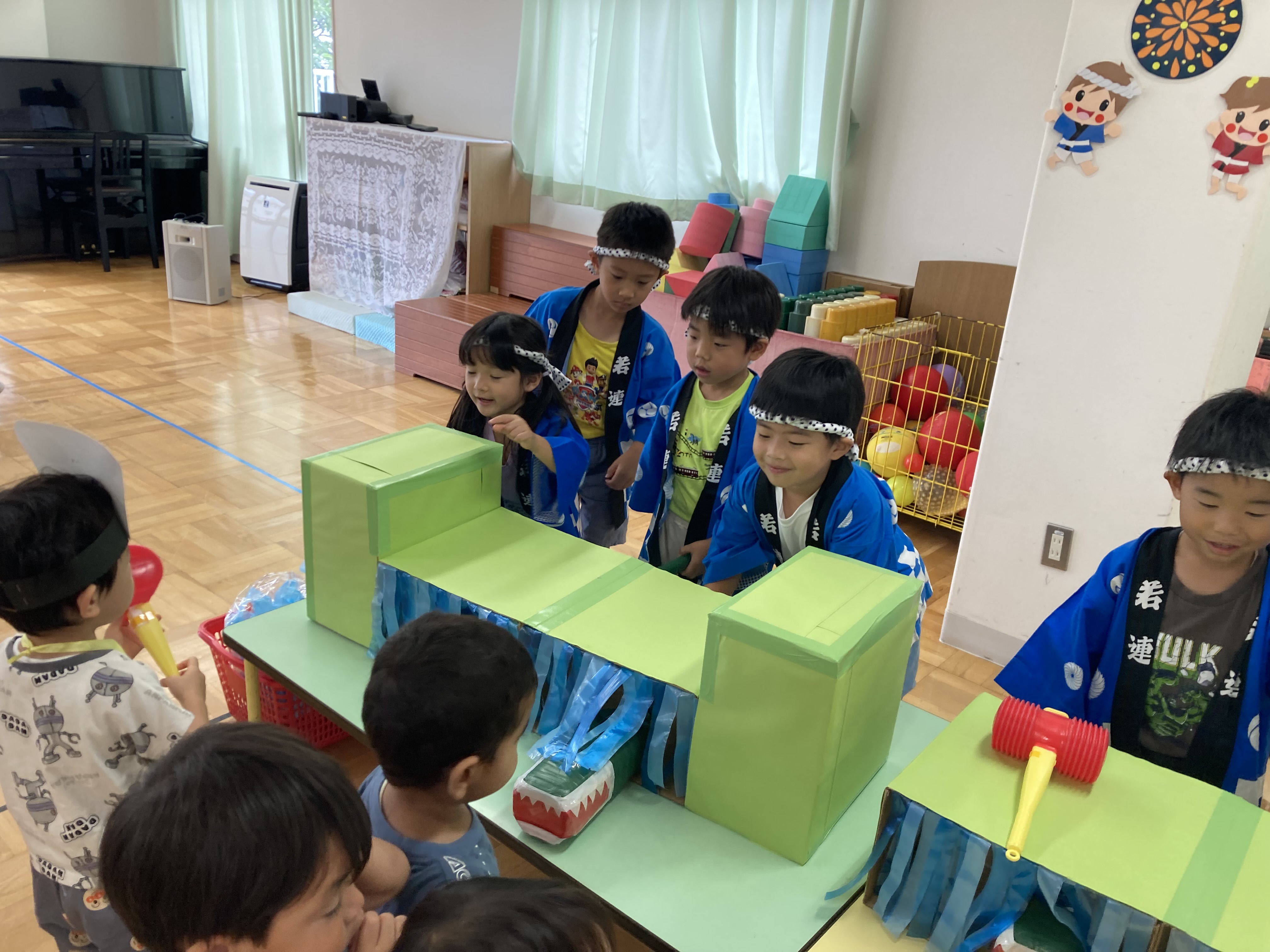 夏のお楽しみ会では他クラスを「いらっしゃいませー!」と元気に呼び込んで、かき氷やジュース屋さん、魚釣りやワニワニパニックなどを楽しませてくれました。