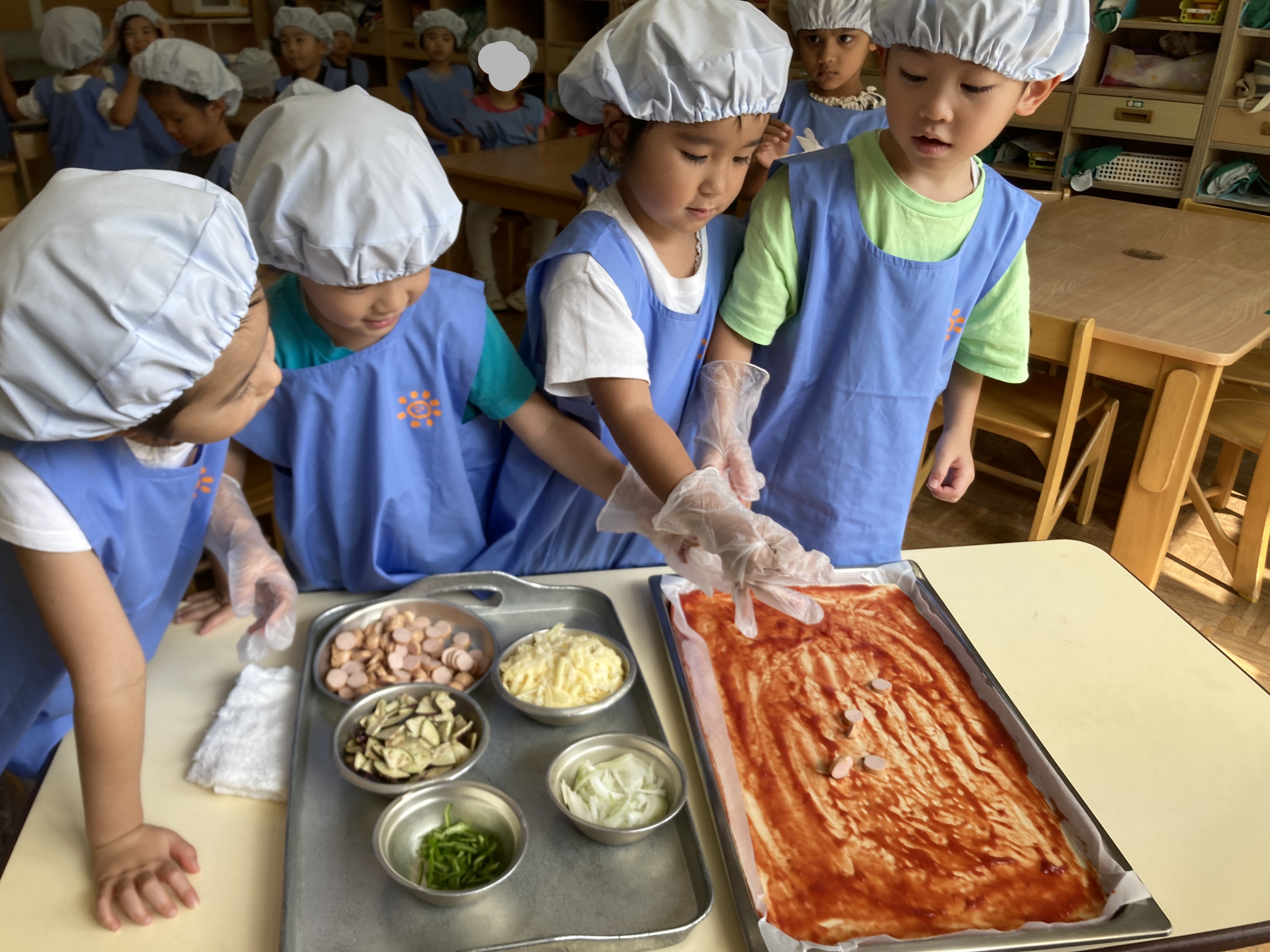 給食さんにお願いして、おやつのピザにトッピングしてもらいました。