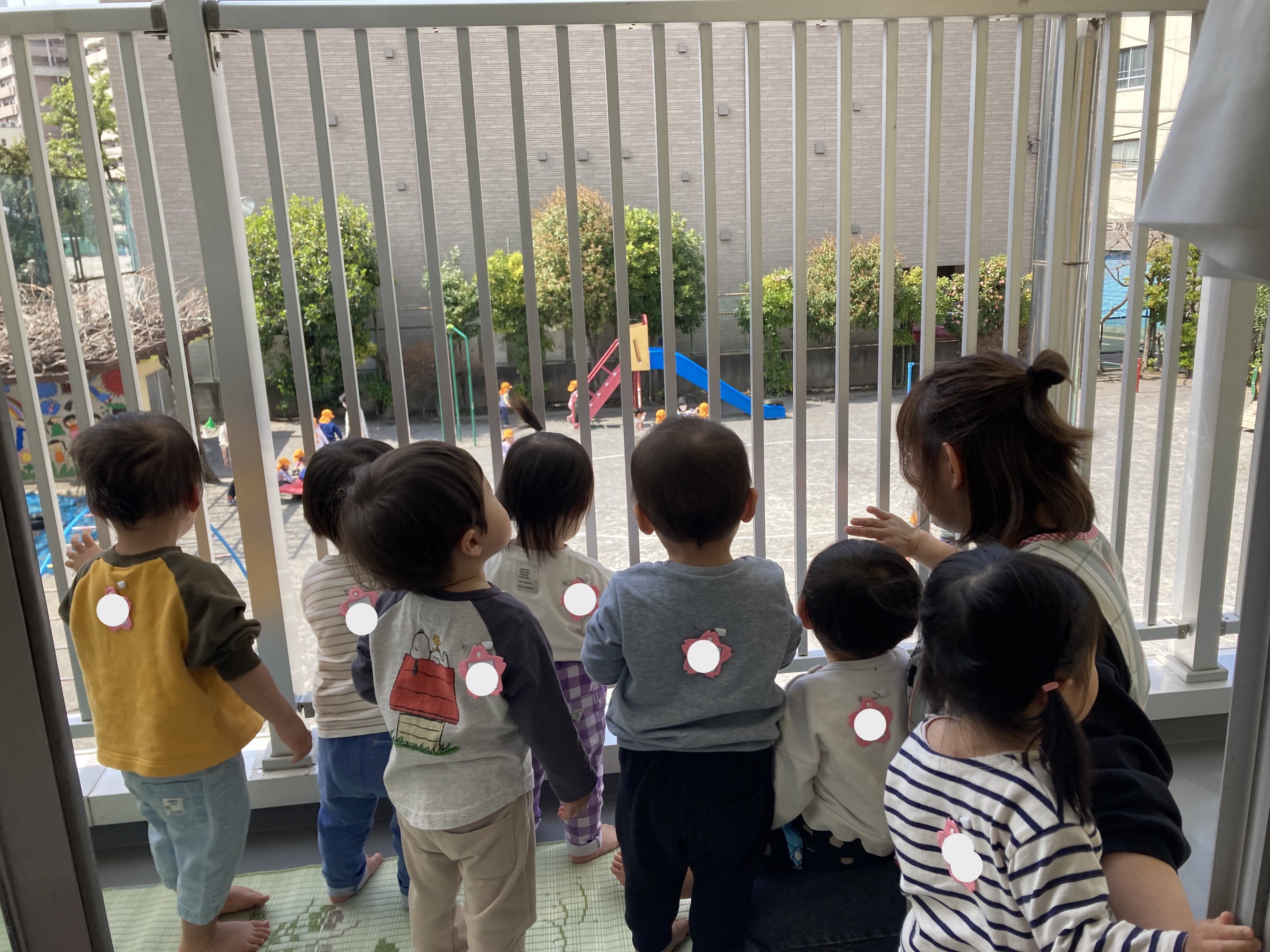 風を肌で感じたり園庭にいる他クラスの様子を見たりしていると、あら不思議。自然と涙も止まり、飛んでいる飛行機に気づいて指さしをしたり笑顔が見られるようになりました。
