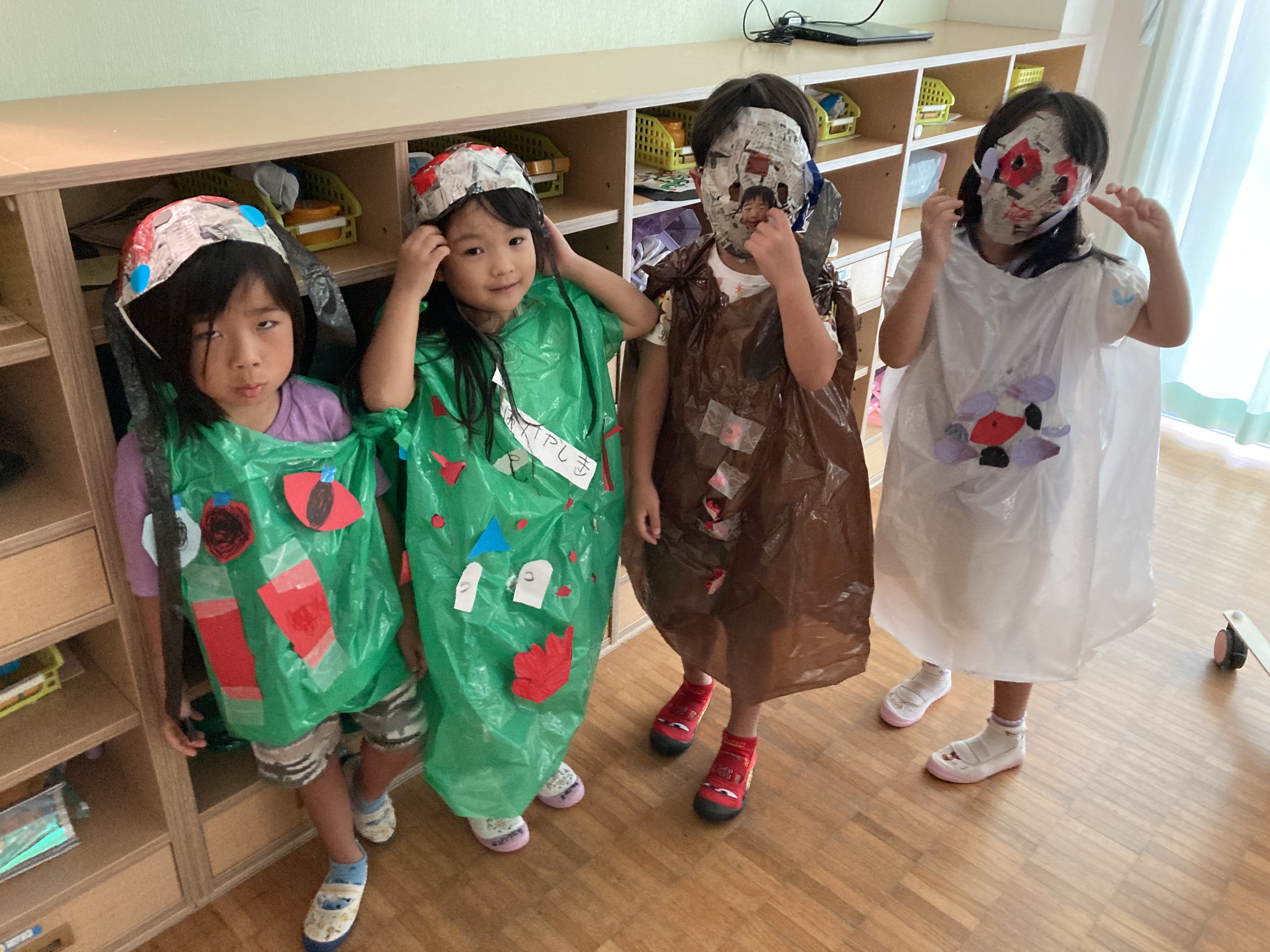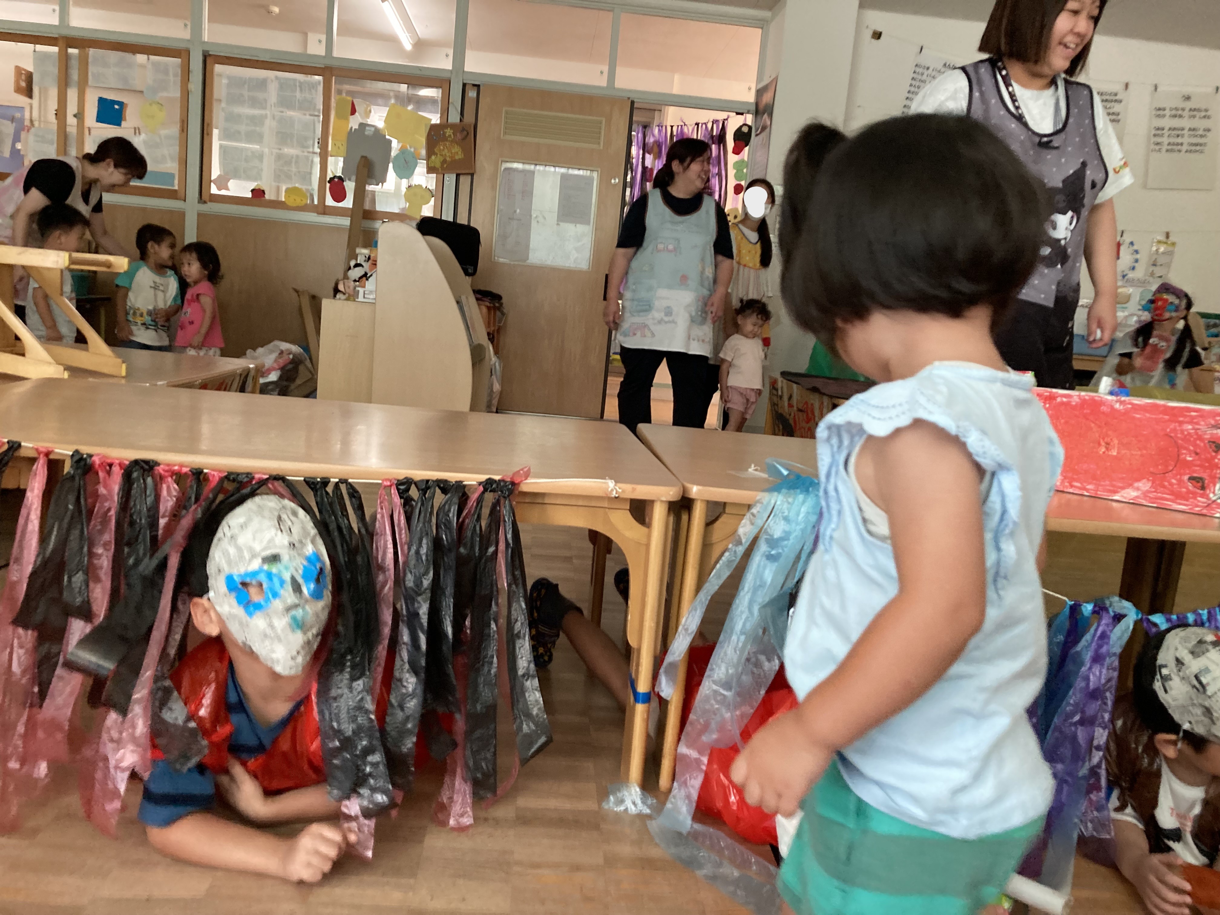 また、おばけ屋敷ではどんなおばけにしようか、どんなお部屋にしようかと皆で話し合い、廃材を使って製作。