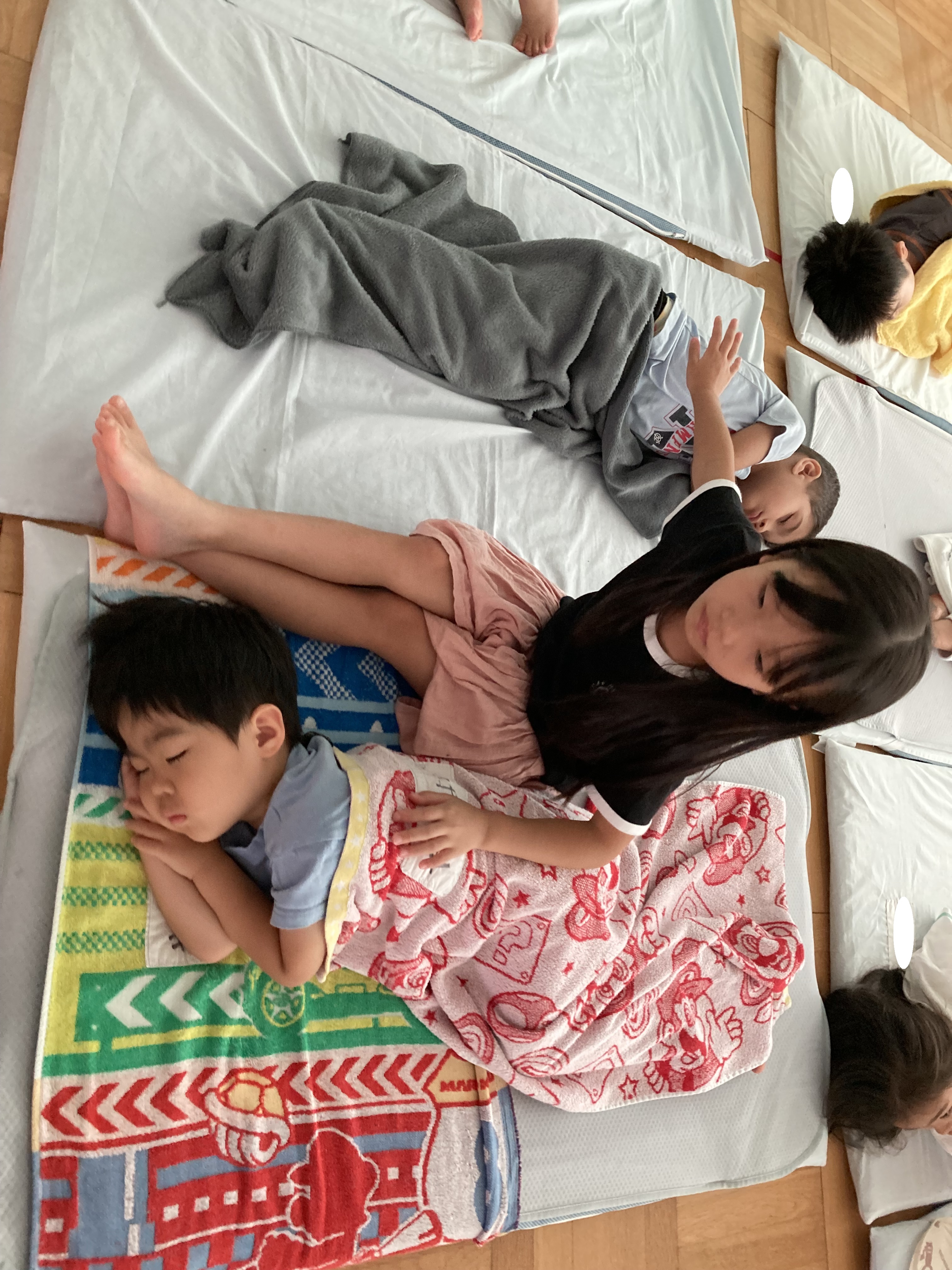 一緒にホールで寝ている3、4歳児クラスの子を眠りに誘ったりしています。
