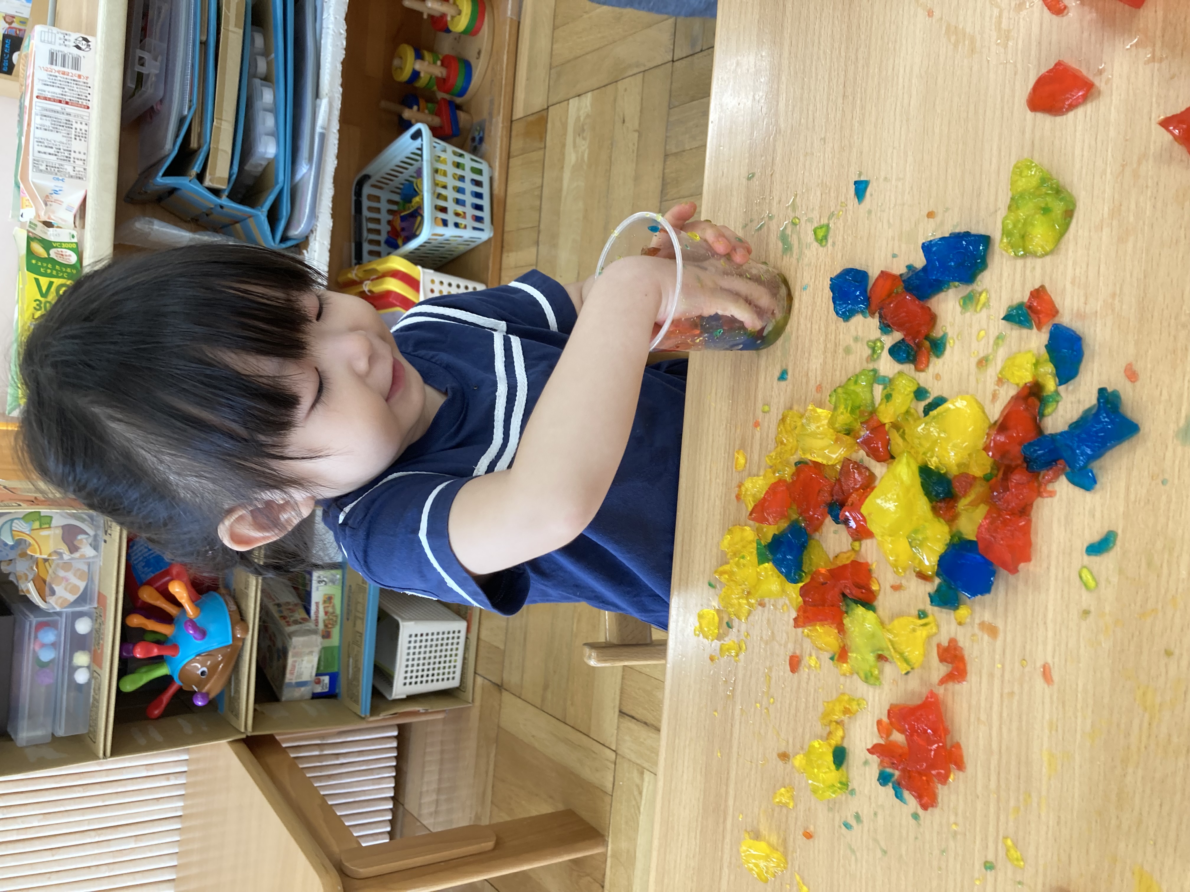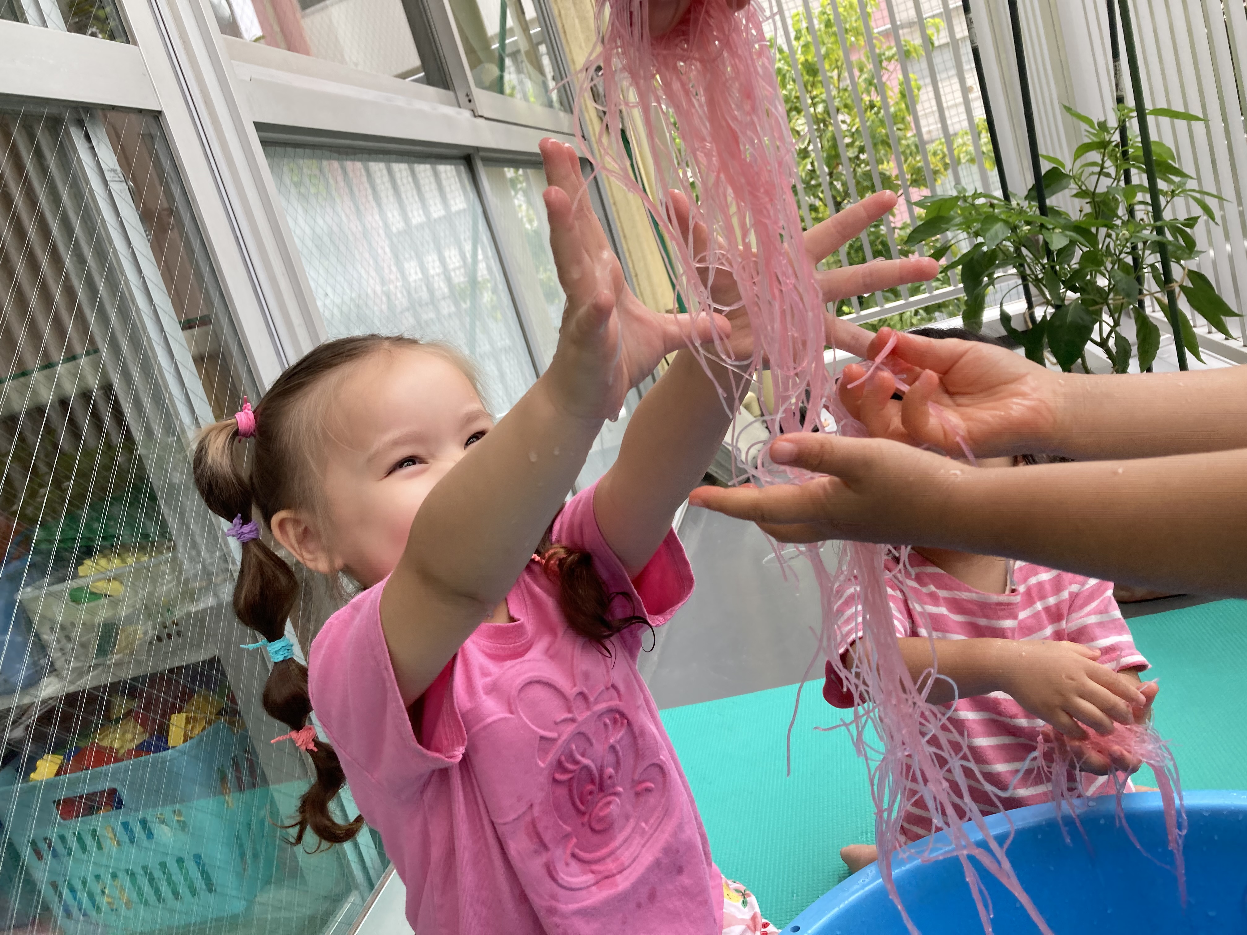 他にも感触遊びとして寒天や春雨などにも触れてきました。