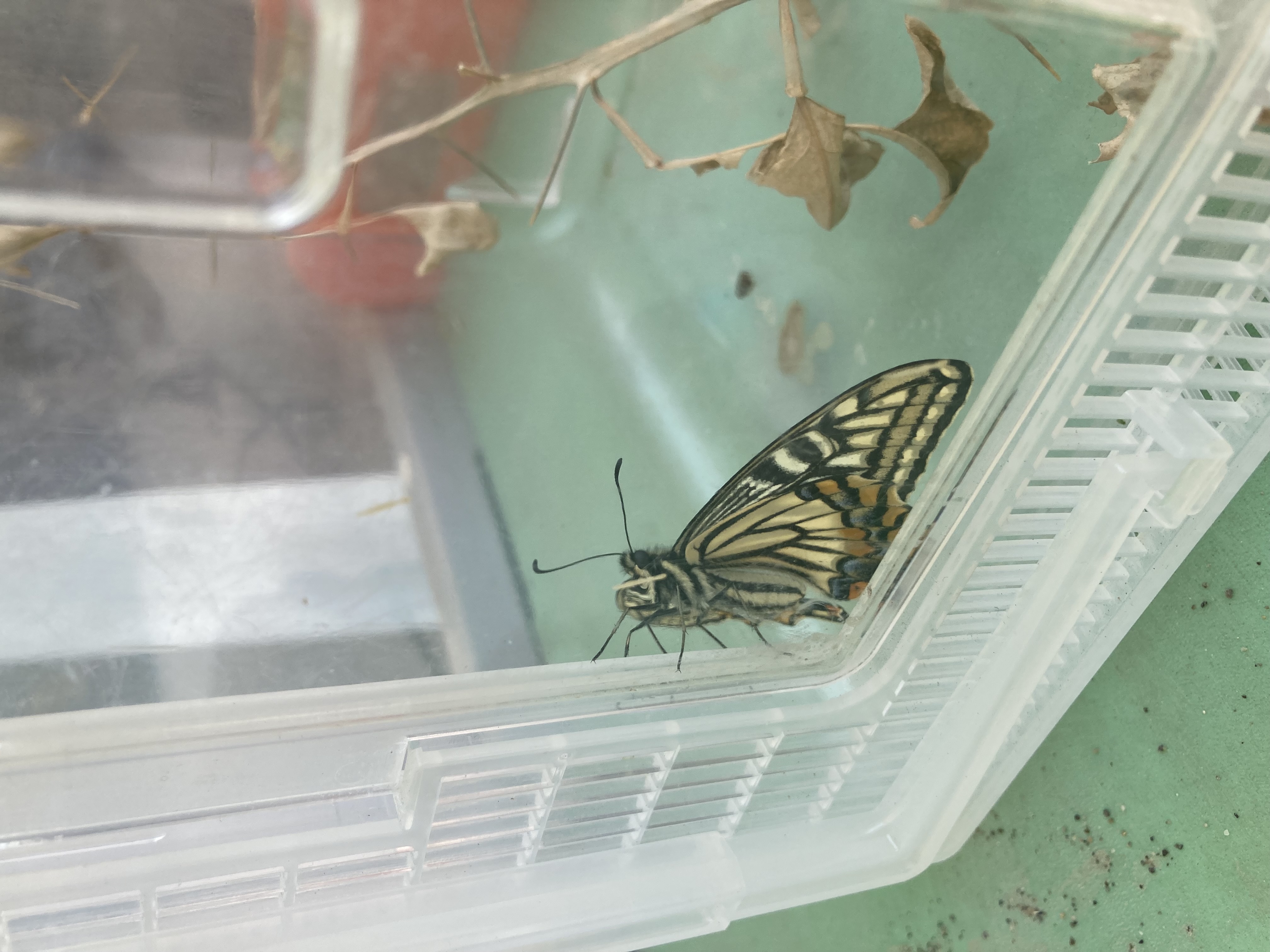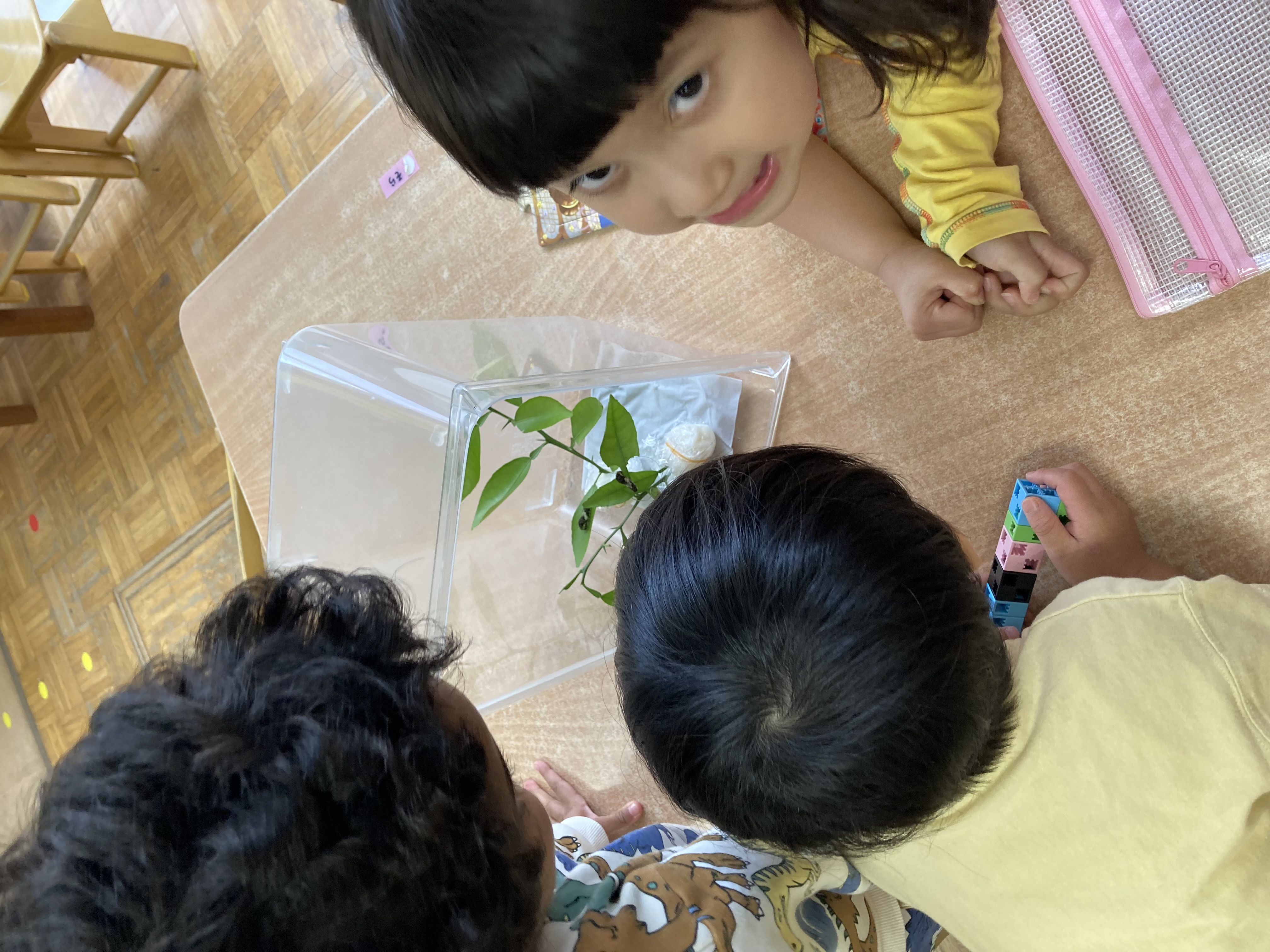 2歳児クラスの時に見守ってきた蝶々を進級当初も観察。無事に蝶々に羽化し、空に見送りました。