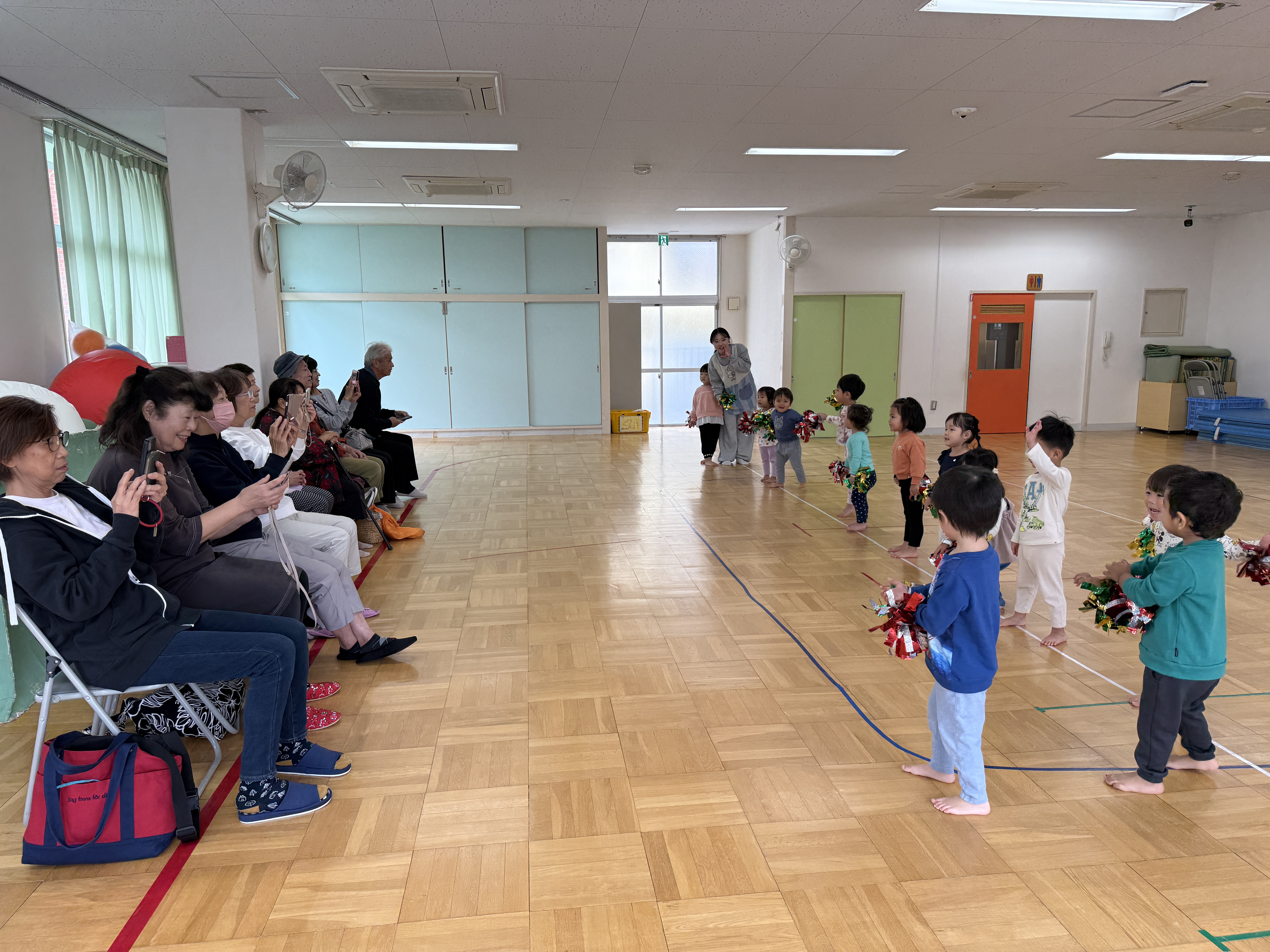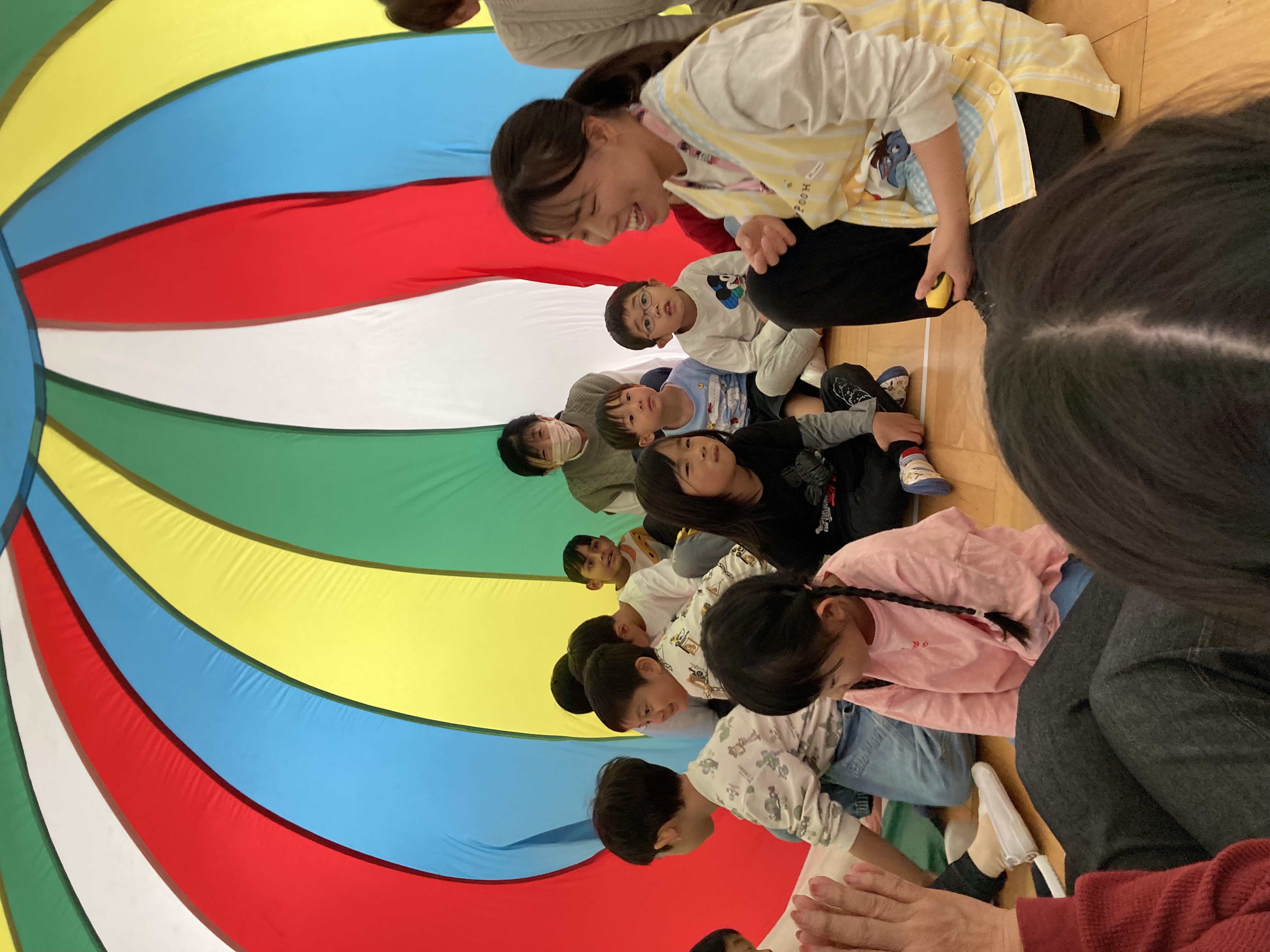 いちょう組はお部屋で自己紹介をして、ホールではソーラン節を見てもらい、パラバルーンも一緒に楽しみました。