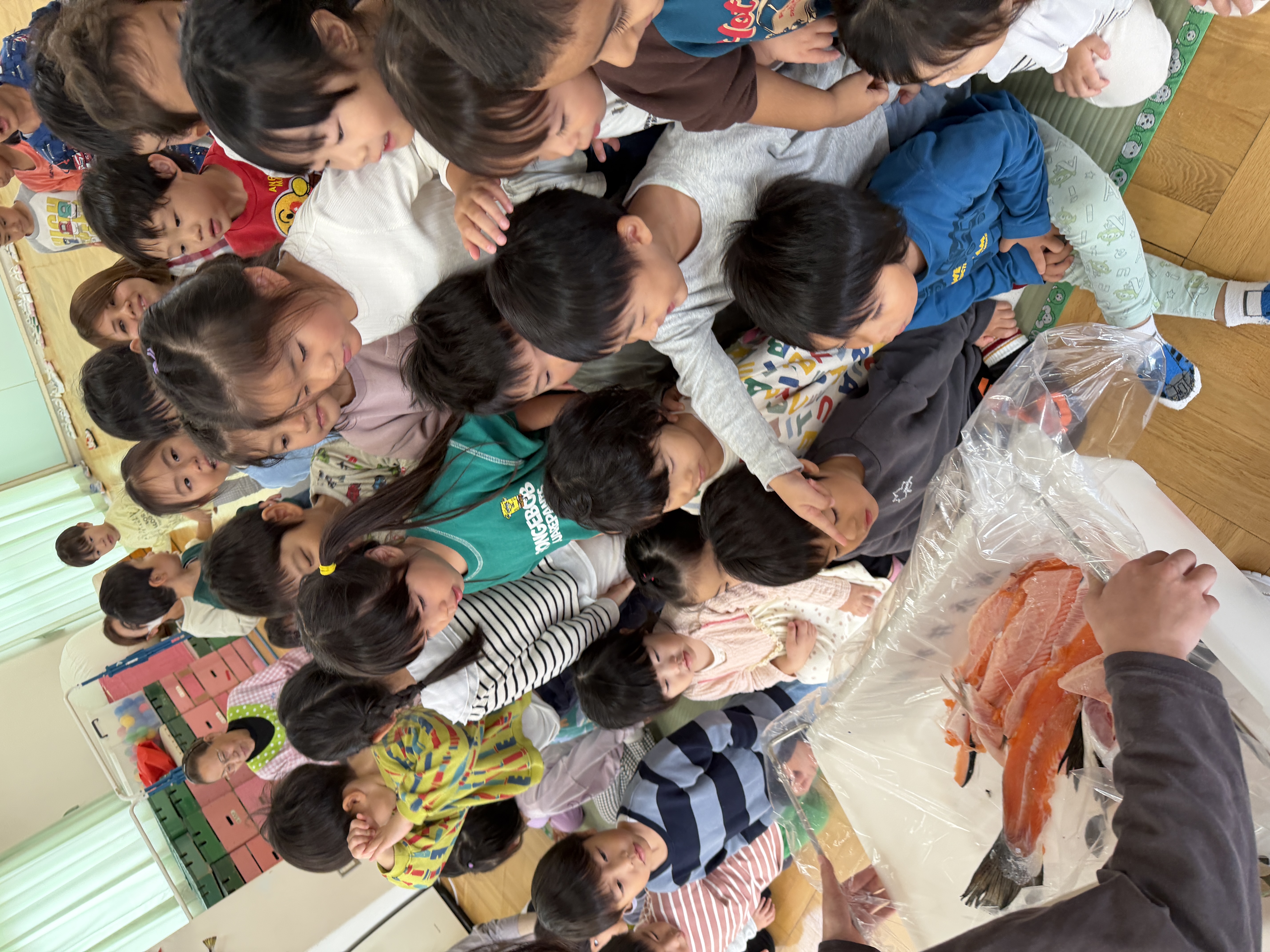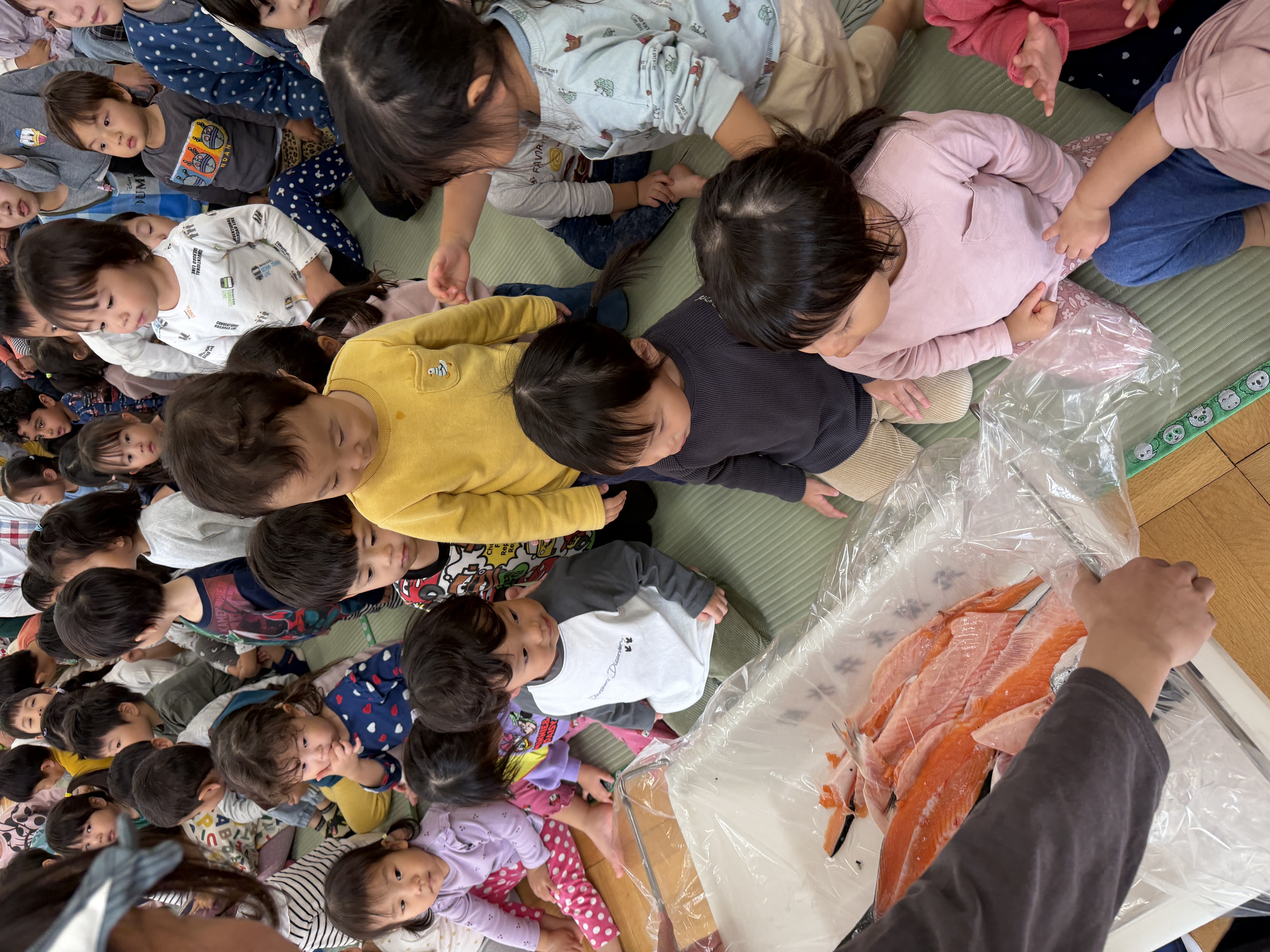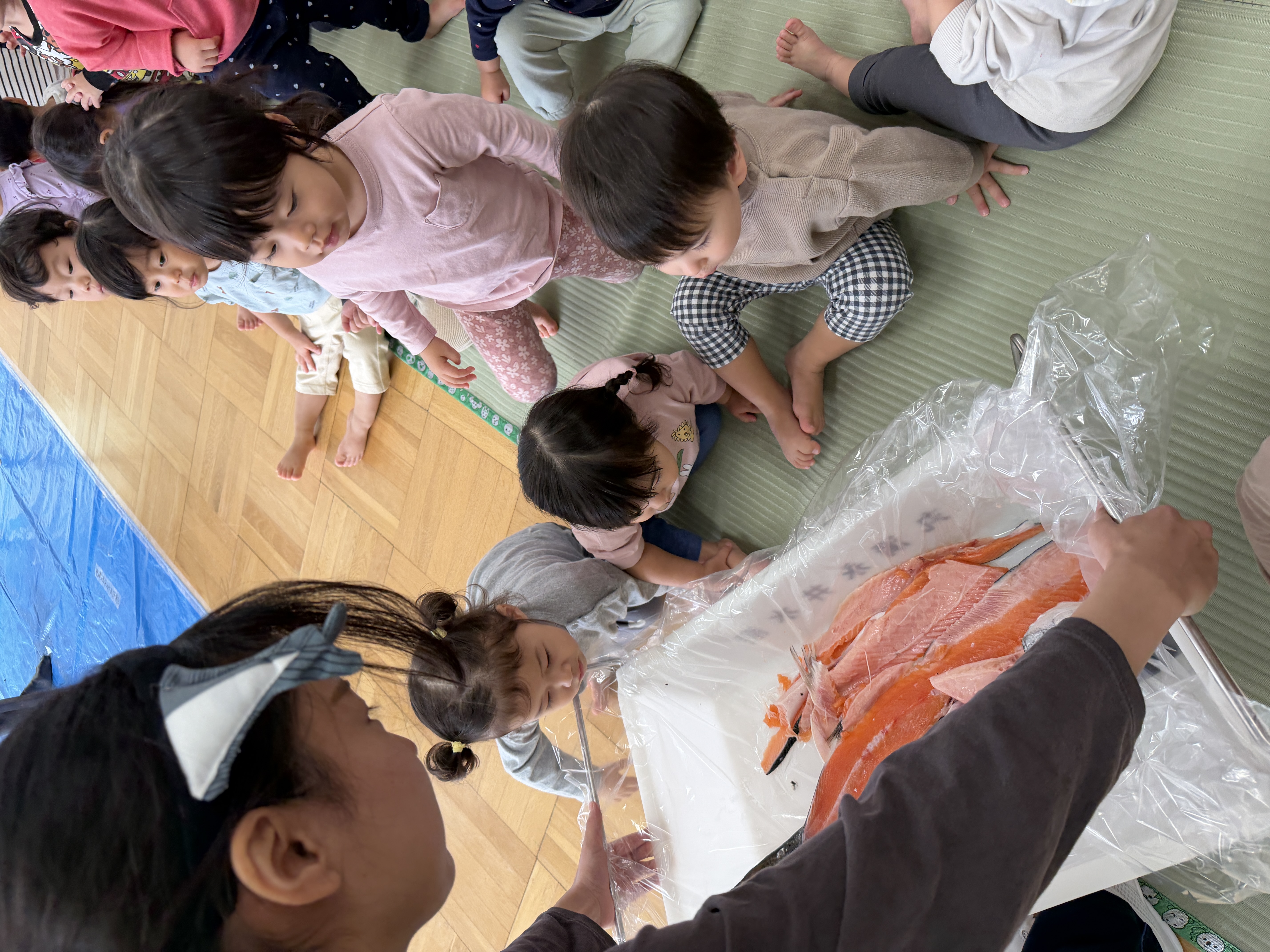 魚屋さんが準備している間に“いわしのひらき”の手遊び・魚クイズ・魚探しゲーム(ホールの色々な場所に貼ってある魚の中から鮭を見つけるゲーム)を楽しみましたよ☆