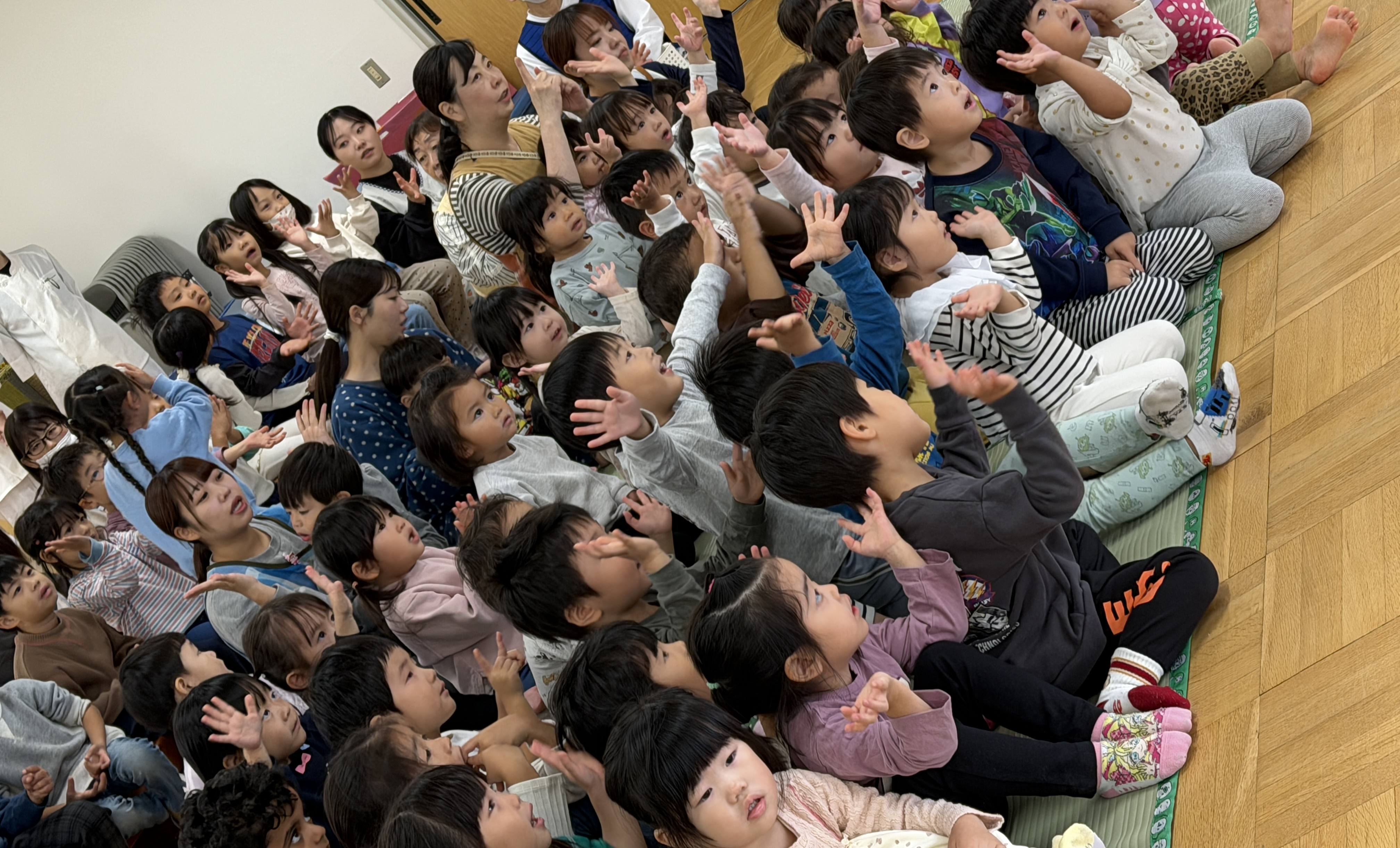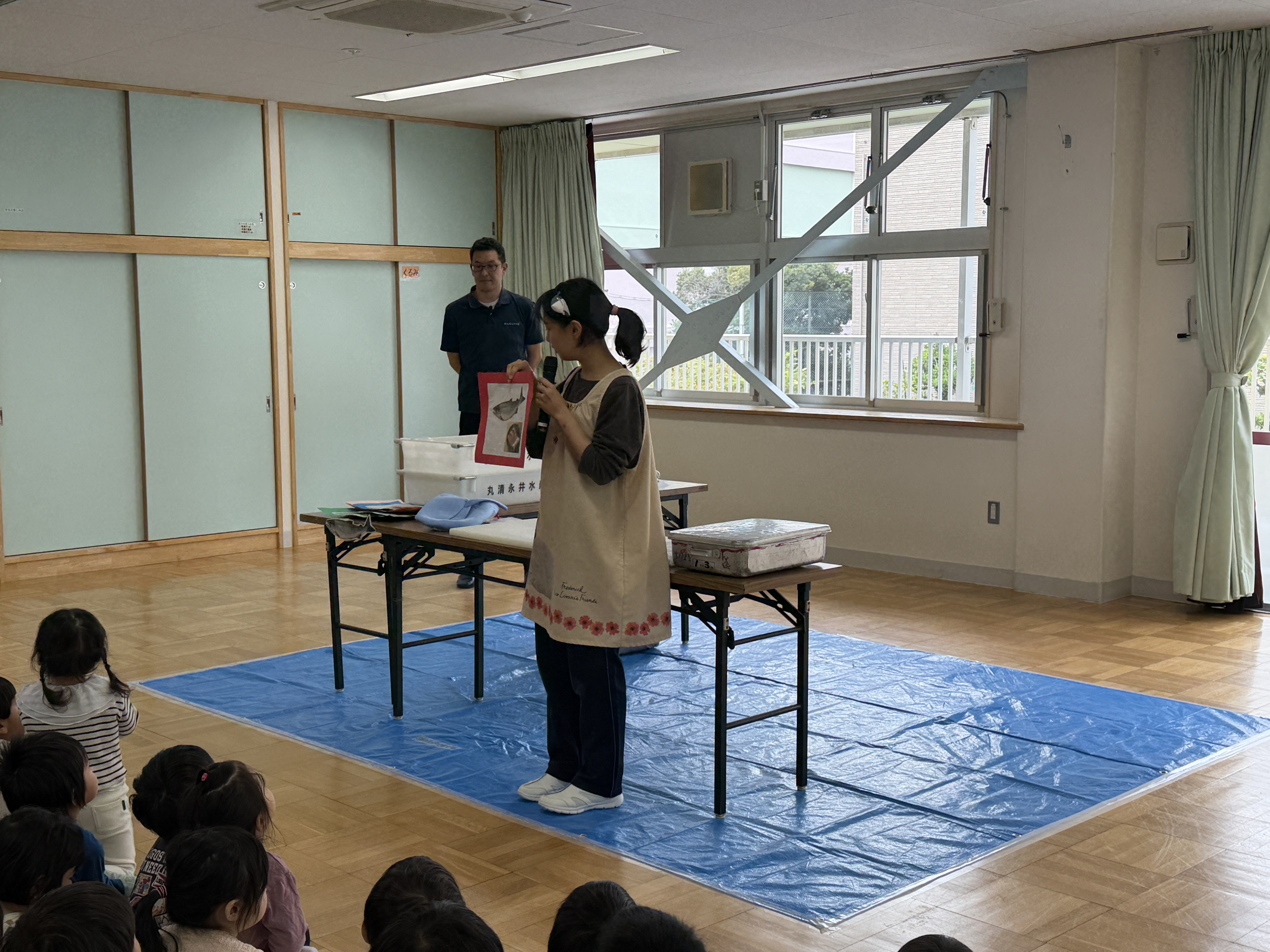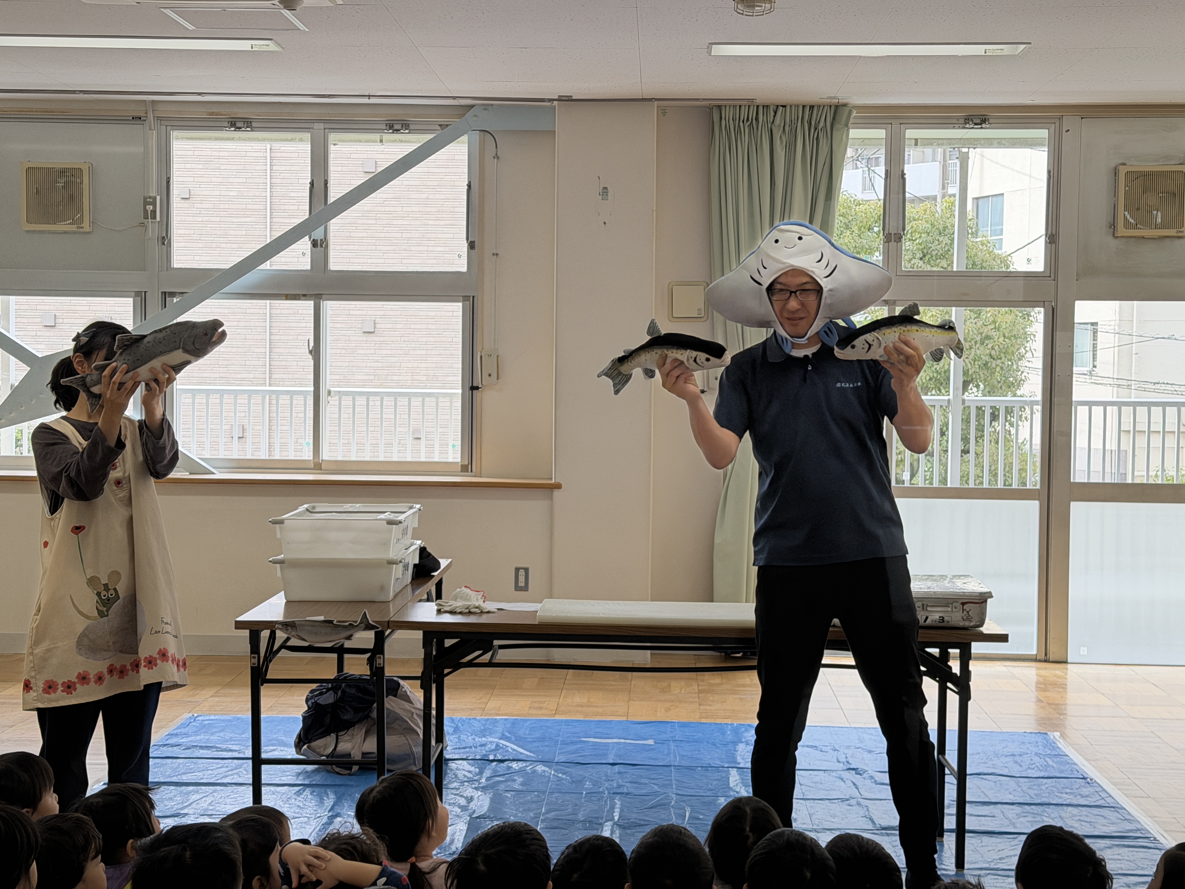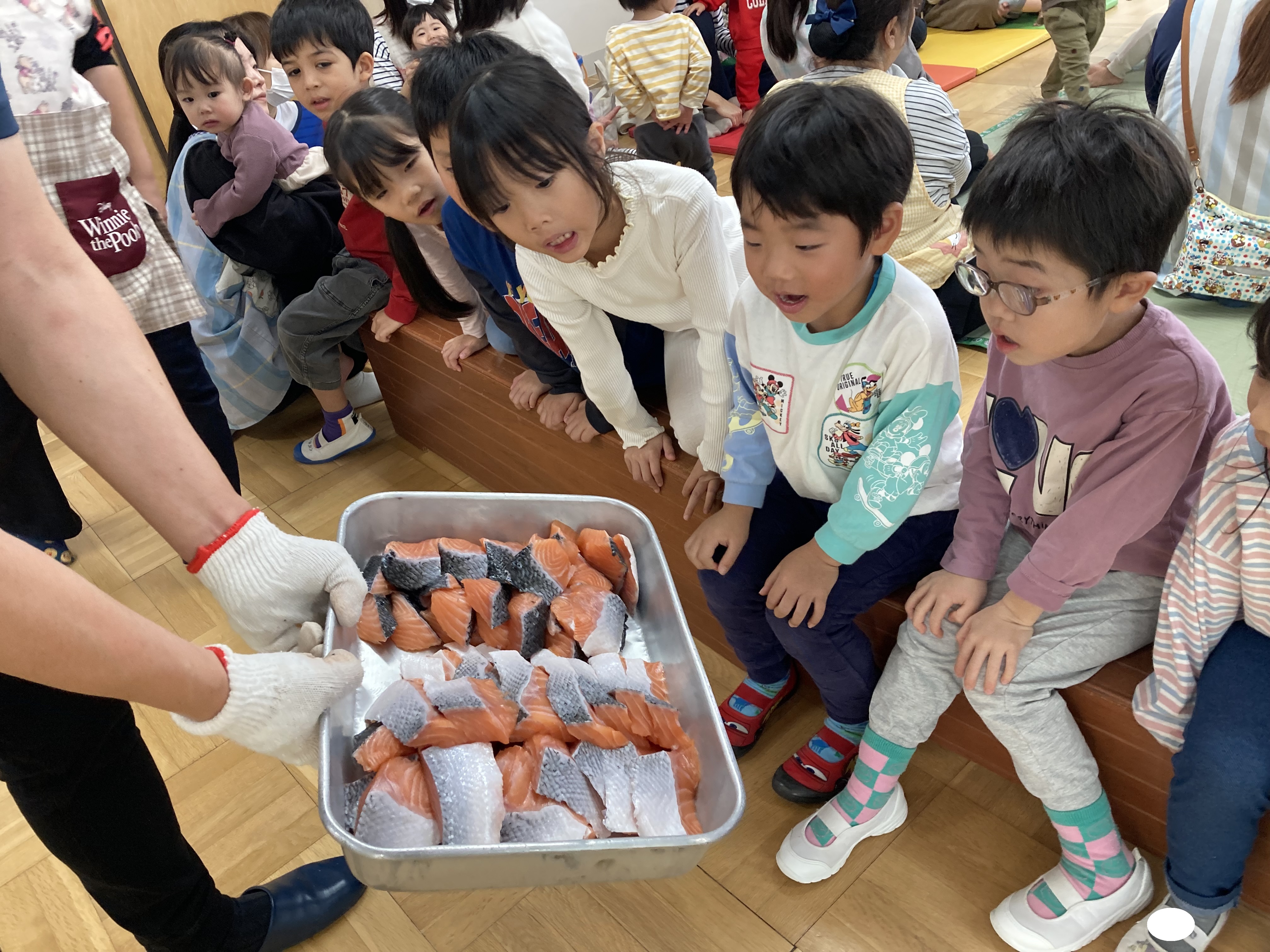 魚屋さんが準備している間に“いわしのひらき”の手遊び・魚クイズ・魚探しゲーム(ホールの色々な場所に貼ってある魚の中から鮭を見つけるゲーム)を楽しみましたよ☆