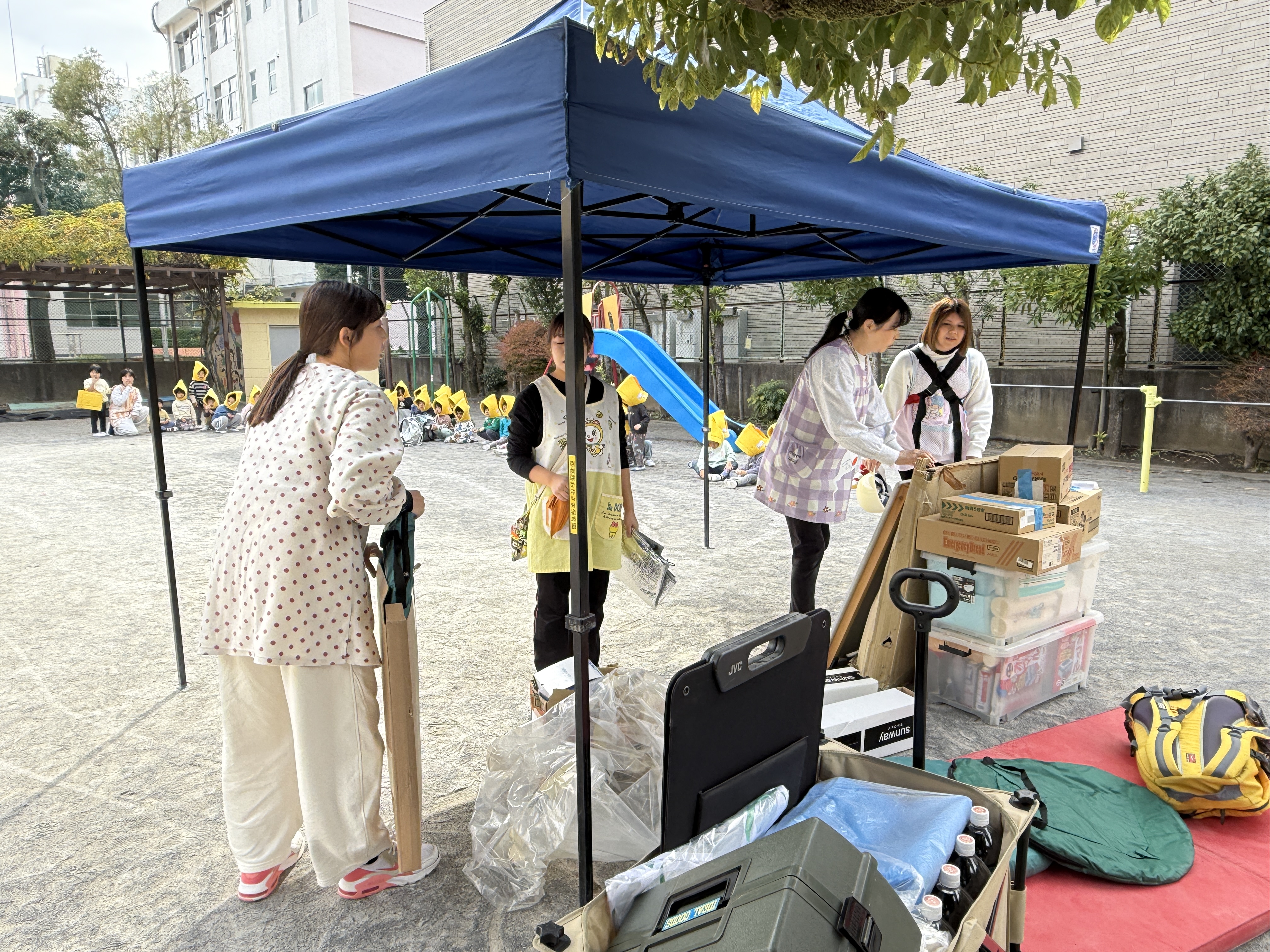 備蓄品や非常食について保育士が実践している様子を見たり話を聞いたり…