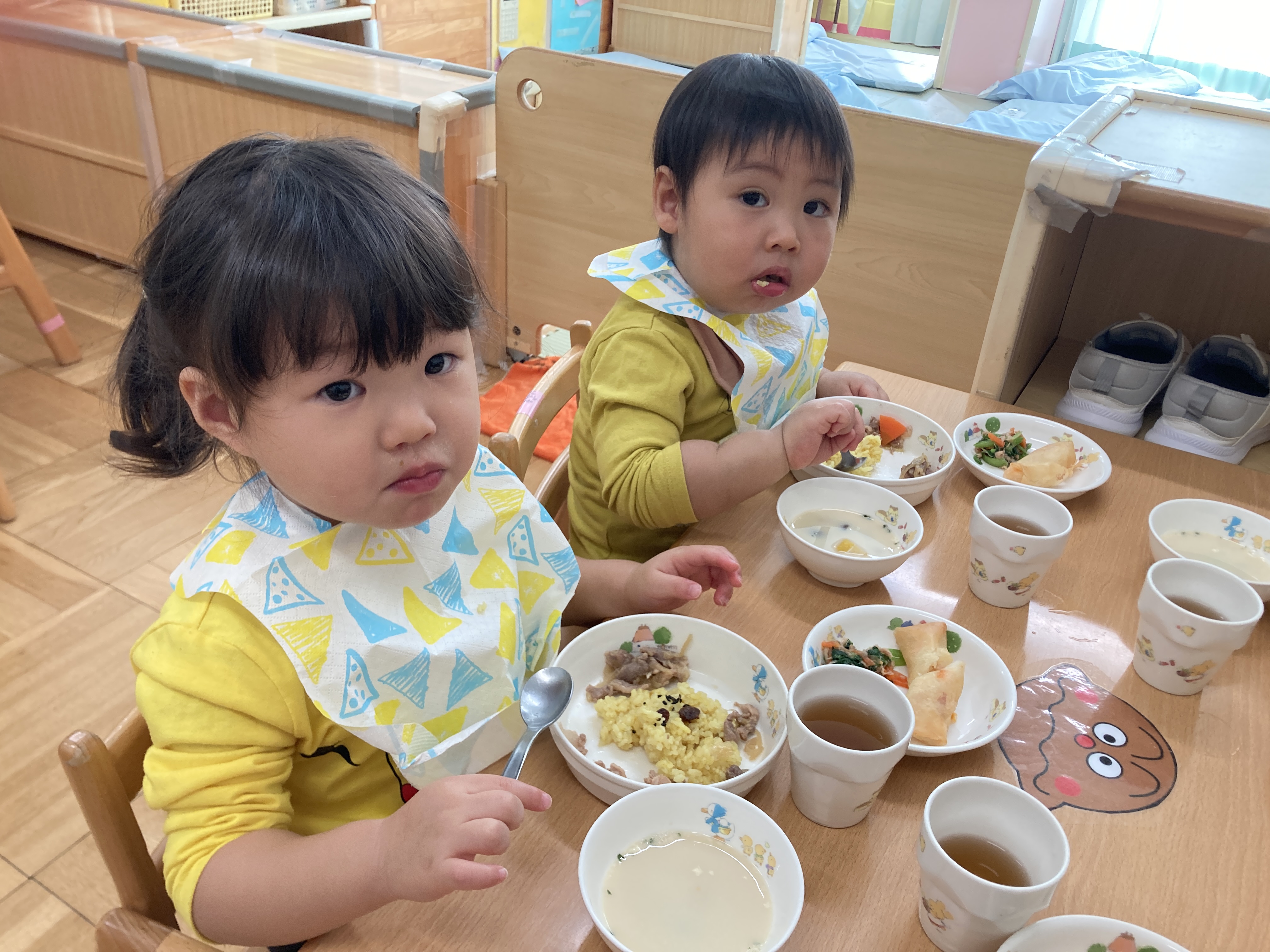 ライオンの形になっているごはんで、乳児クラスの子ども達は「がおー!!!」と気づいていました。
