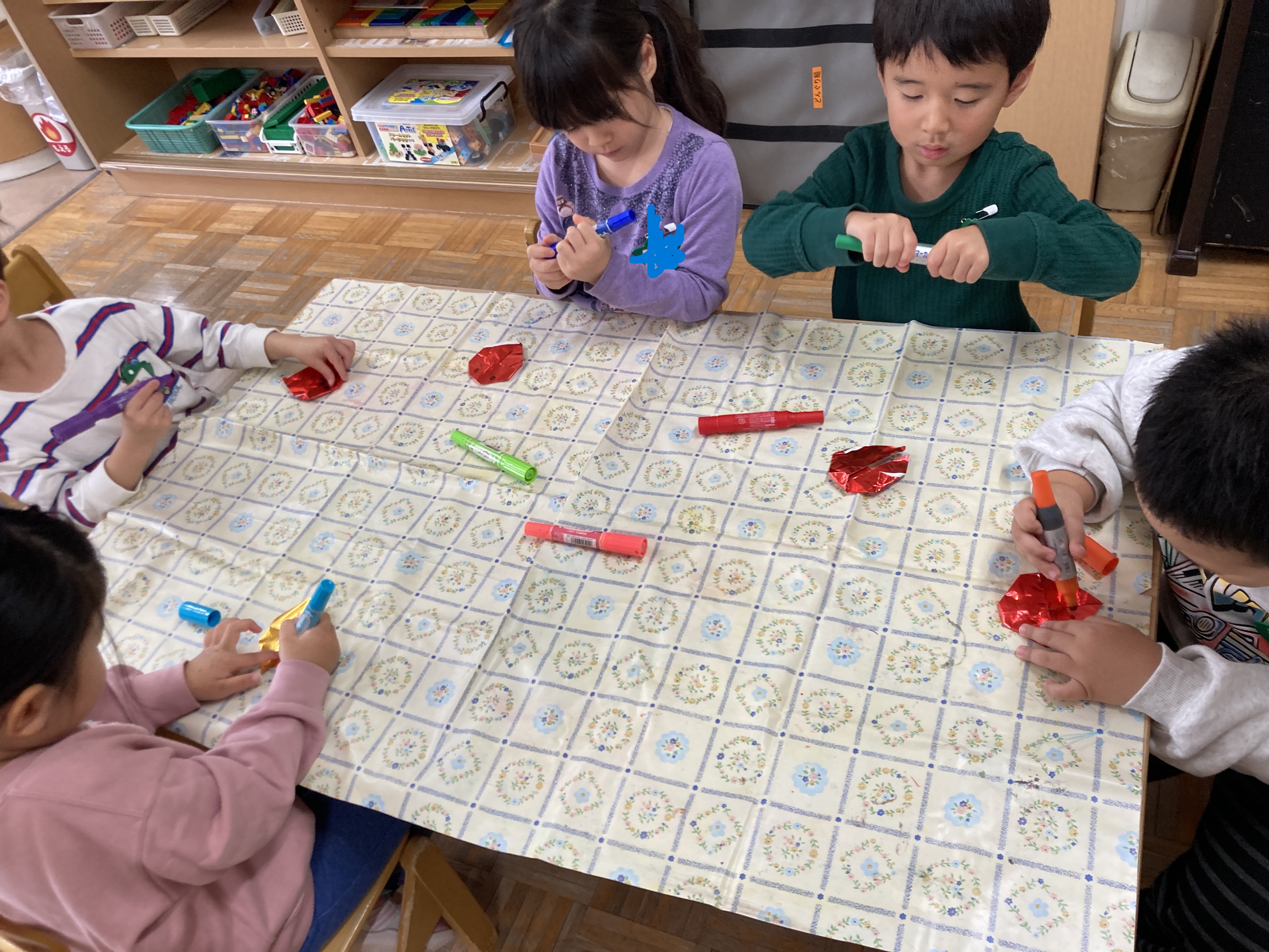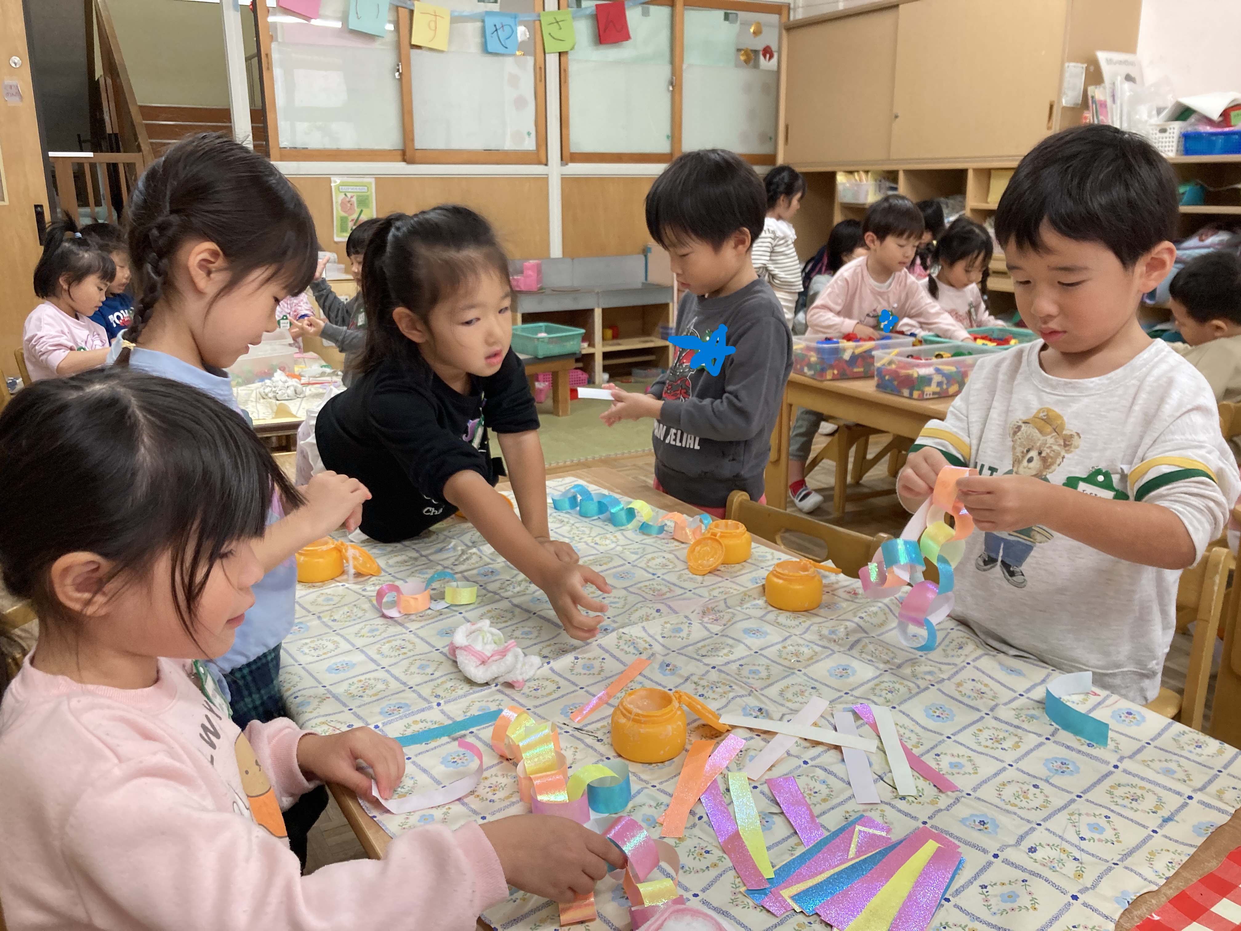 出来上がりを友達と眺めながら「ちんあなごはカラフルにしたの」「笑っている顔にしたよ」「これ難しかった」など様々な会話が聞こえ、楽しかったという思いがあふれ出ていました。