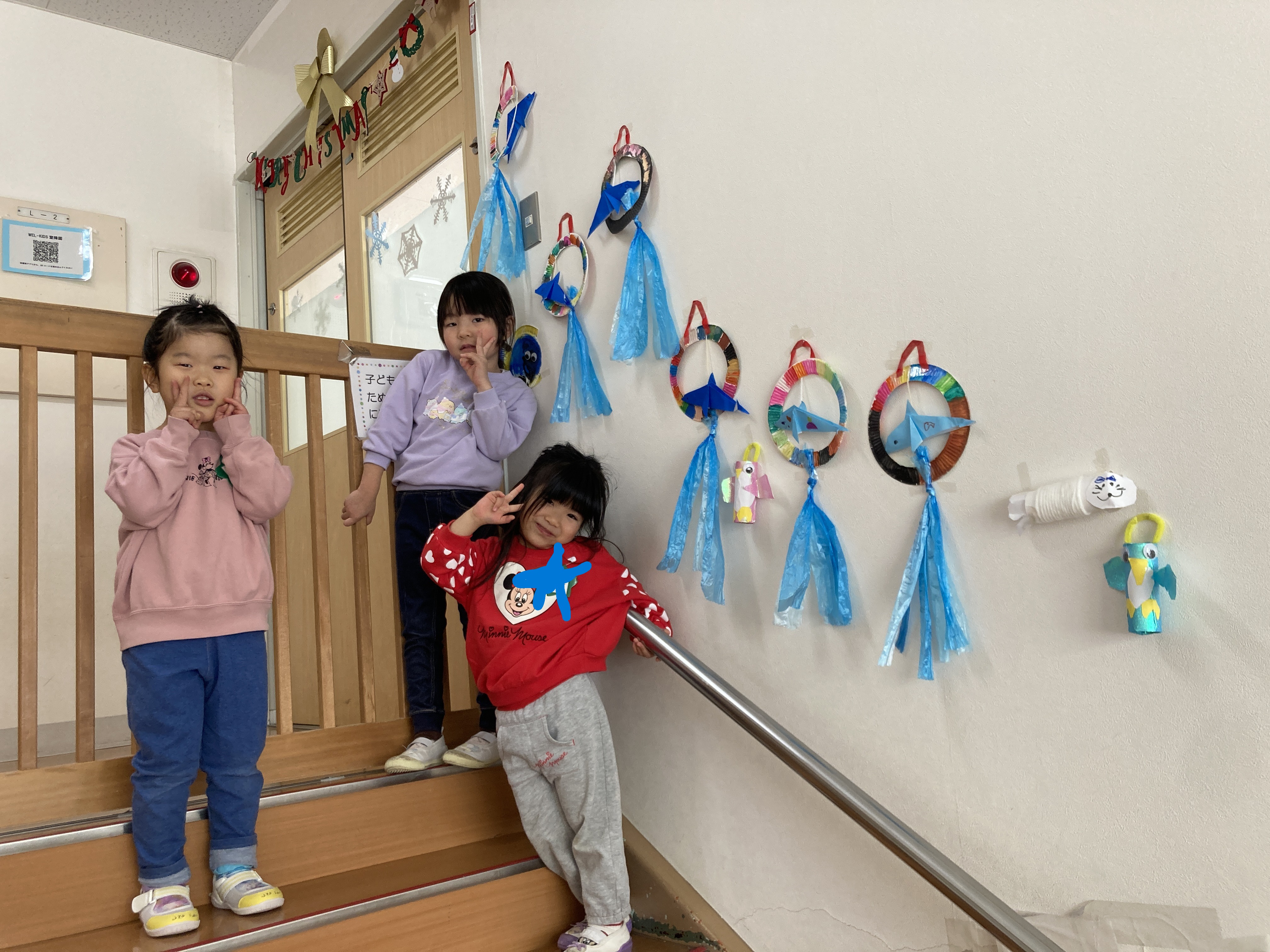 階段に今まで作った作品をみんなで飾り付け、どんぐり組水族館が完成!!!