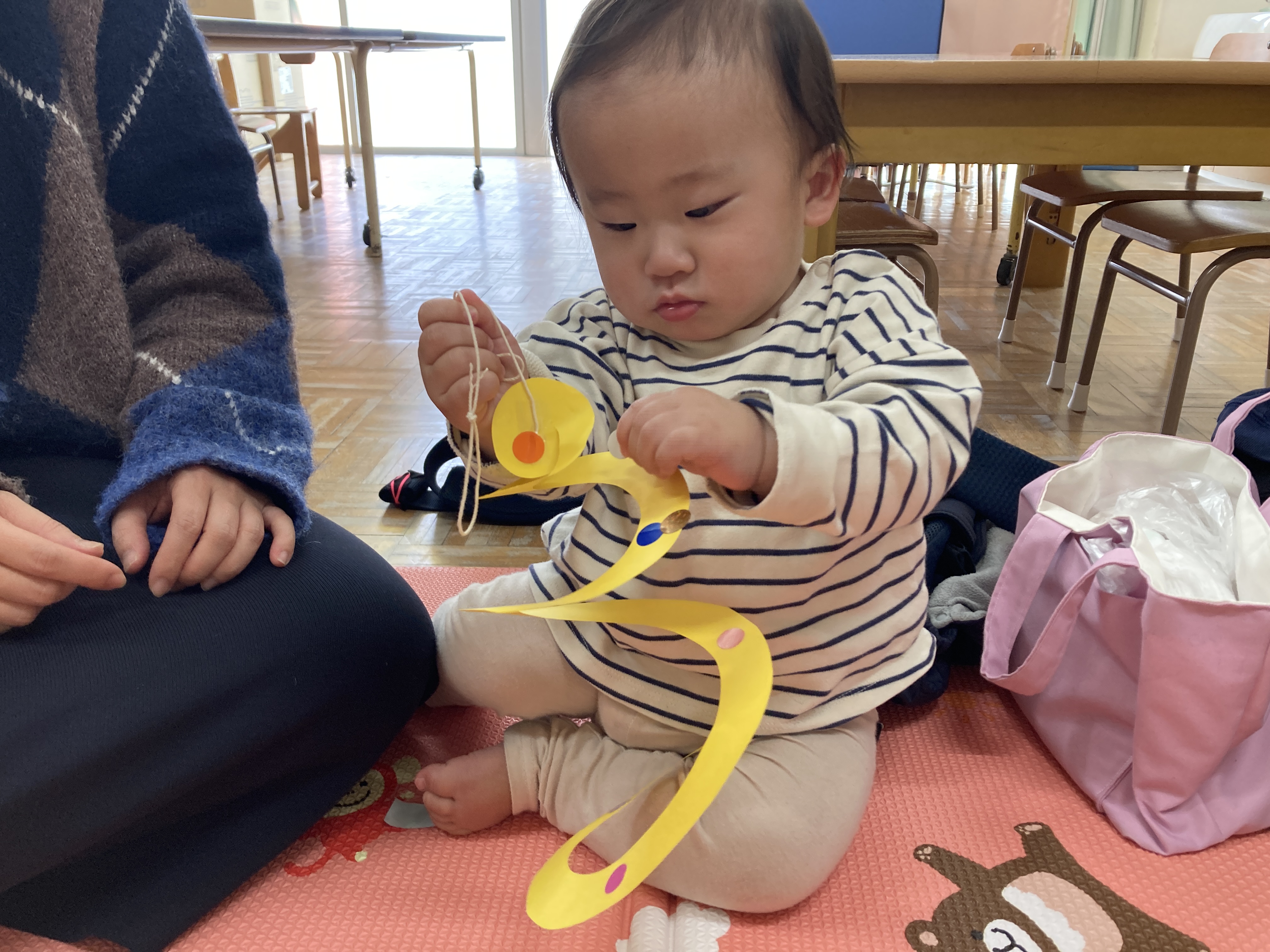 お母さんにこちょこちょされると、にこにこ~と笑顔を見せてくれたお友だちの姿が見られました。