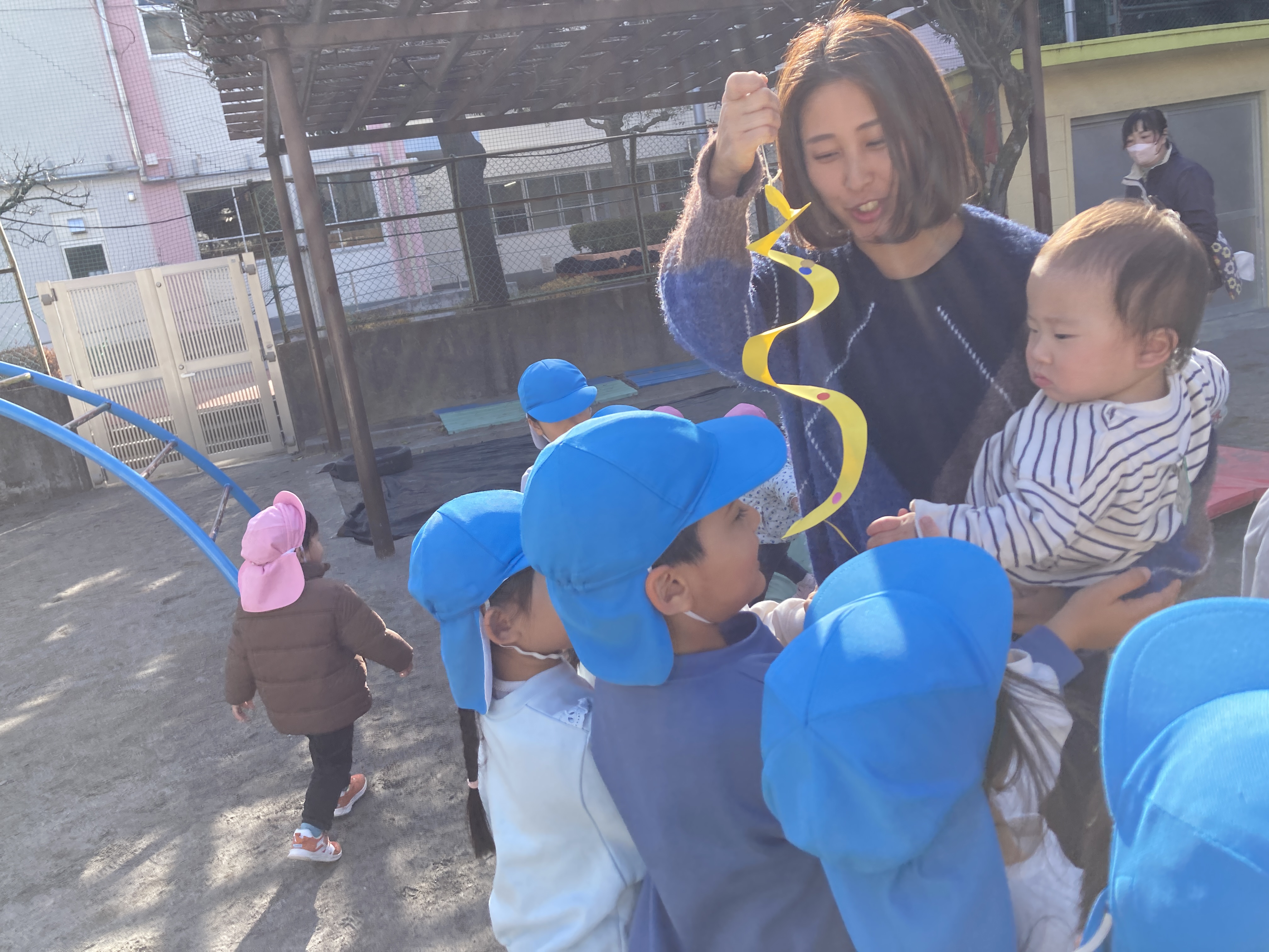 お母さんに抱っこされながら、凧がくるくる~と回って面白そう♪