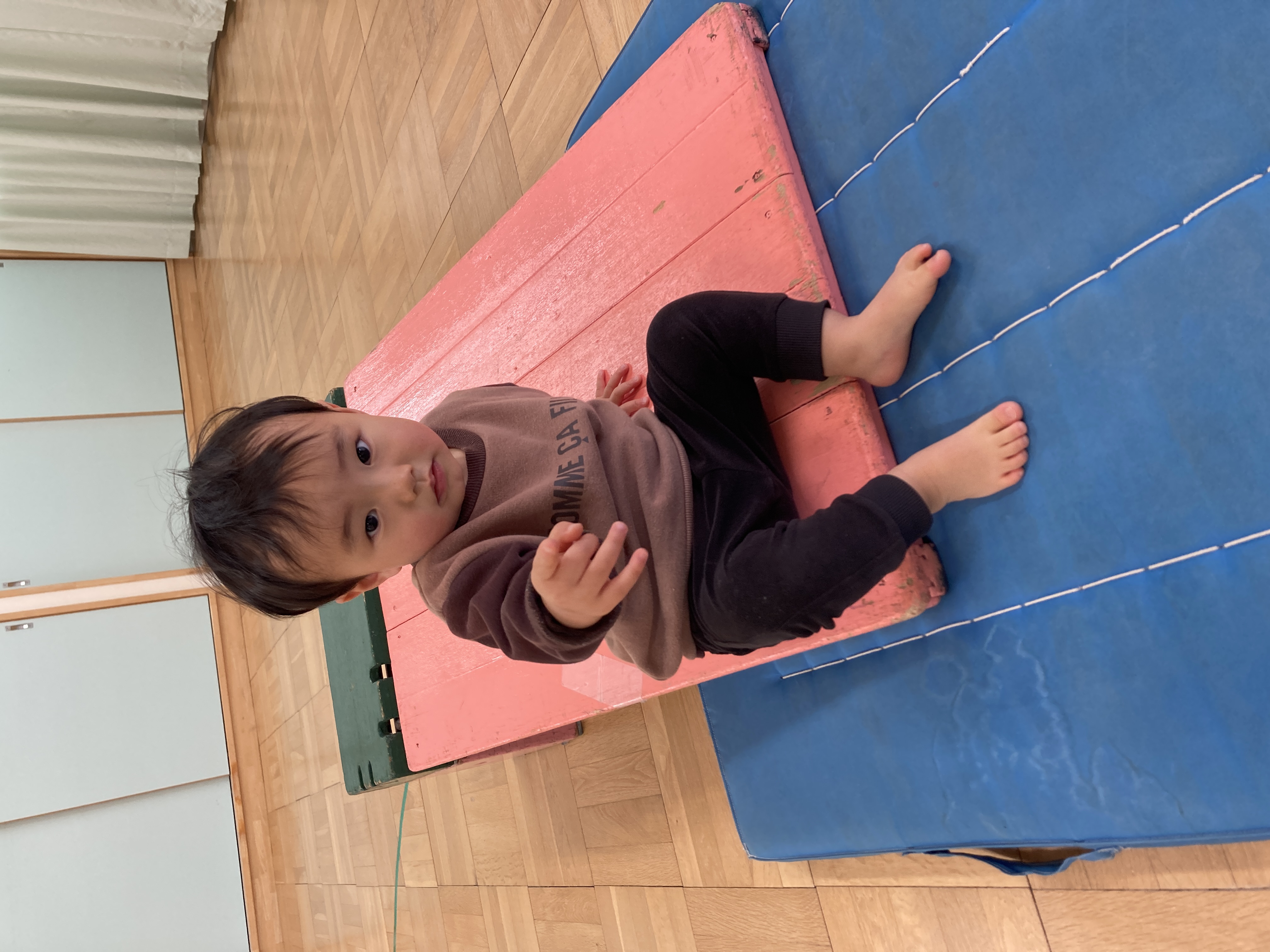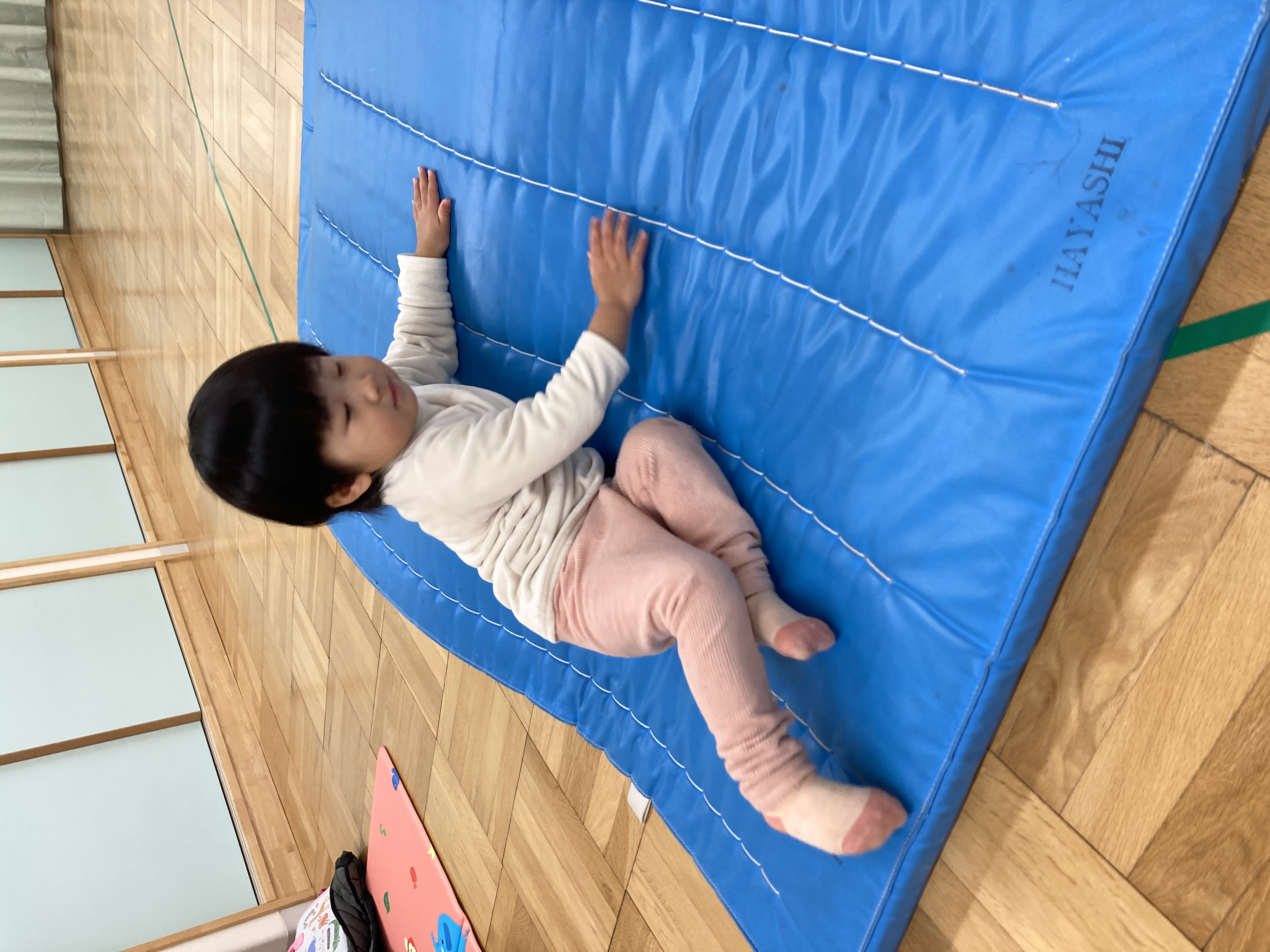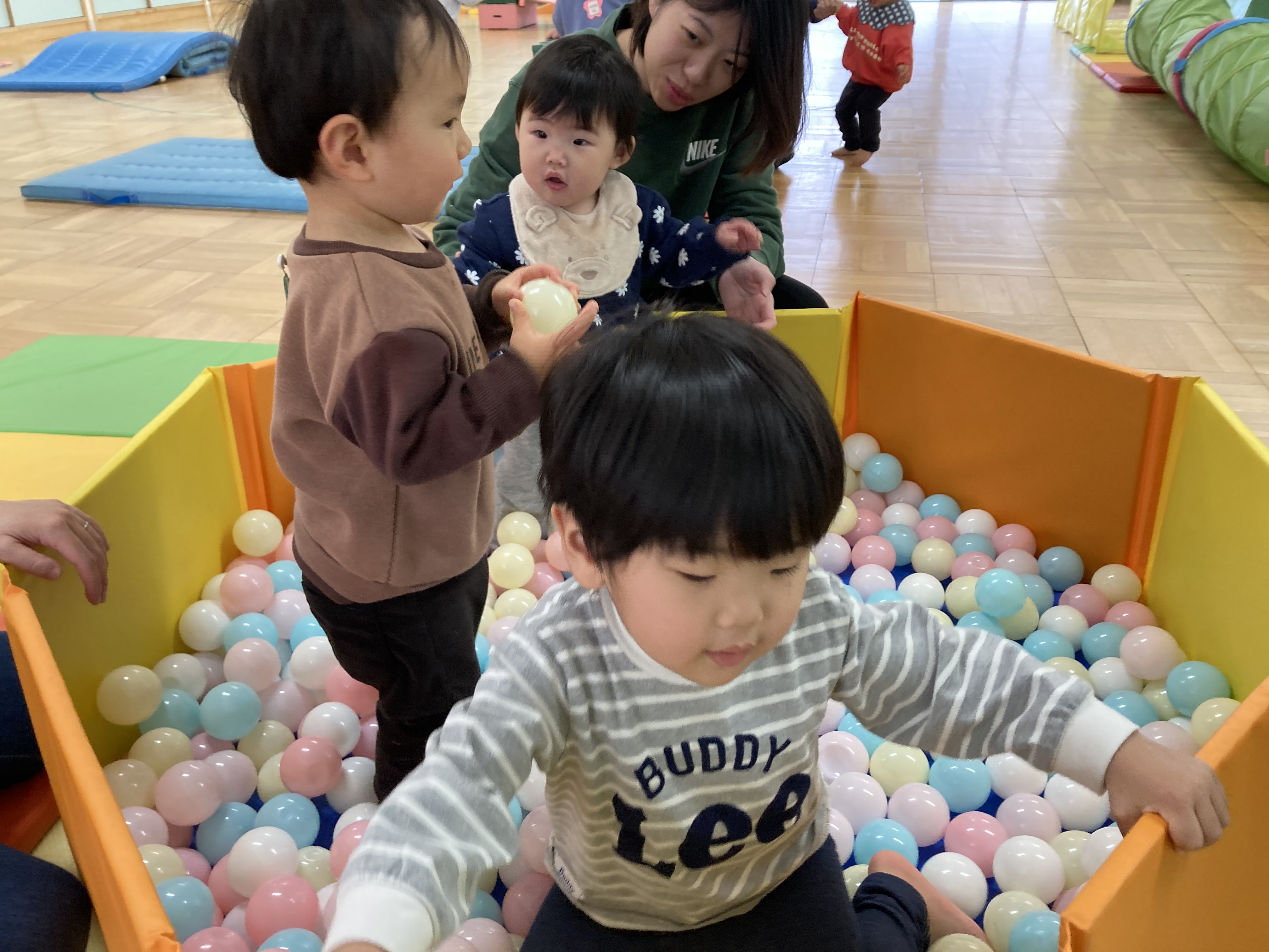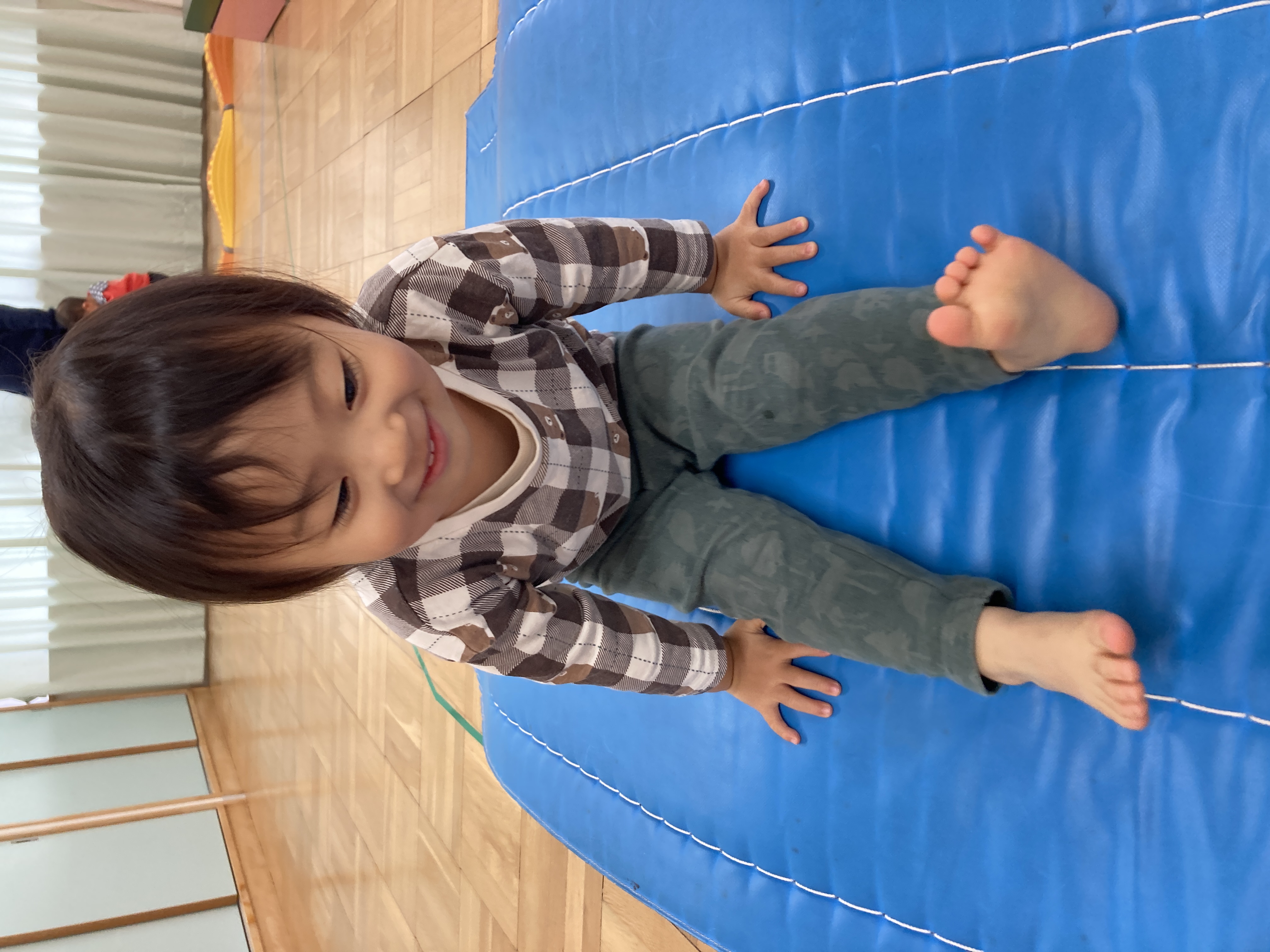最初は広いホールにドキドキしながらも、保護者の方と一緒にマットの滑り台や巧技台の滑り台・トンネル・ボールプール・トランポリンと体を動かして遊んでいました。