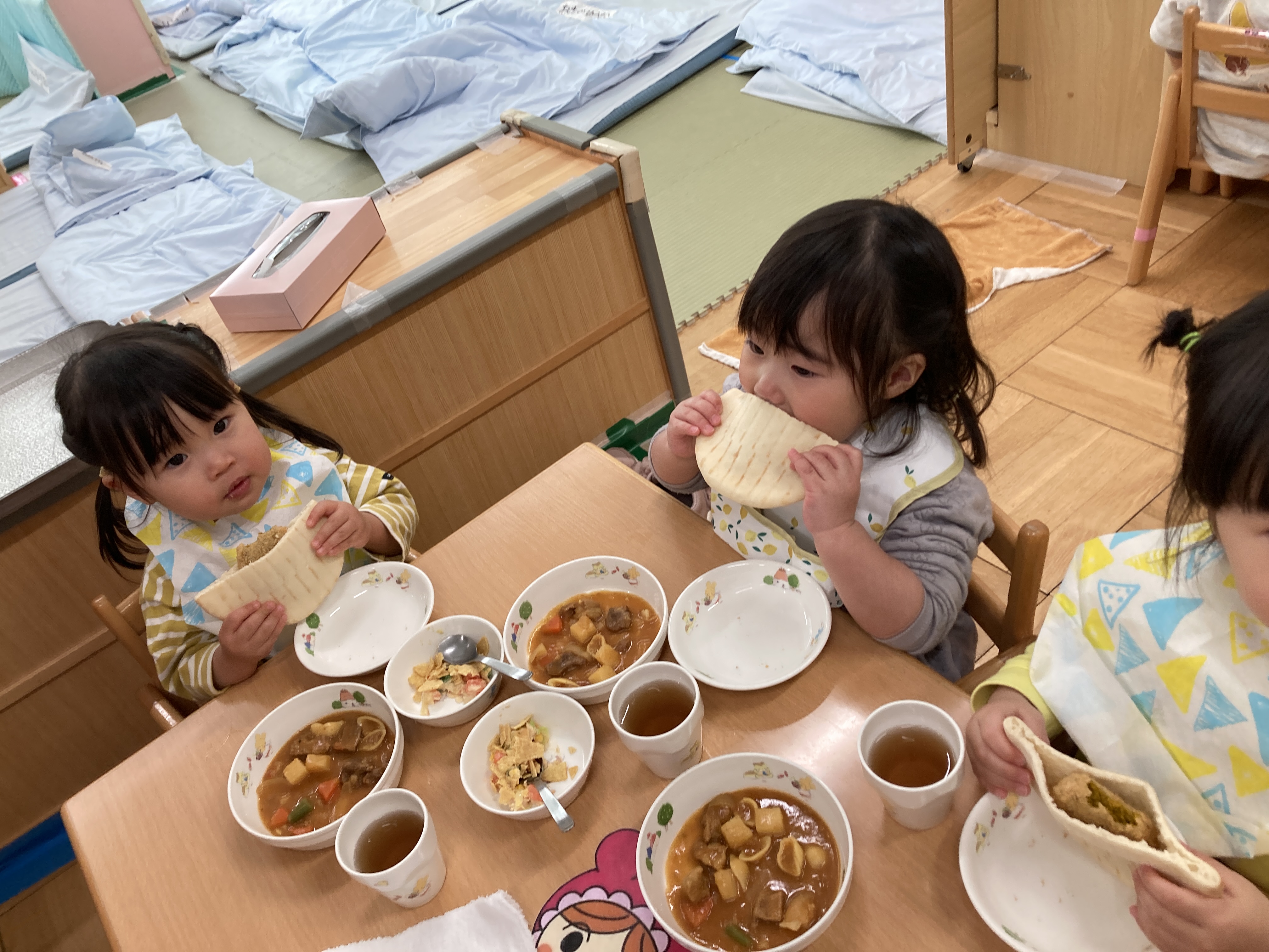 1歳児クラスのみんなは大きなピタパンに必死にかぶりつく姿がなんとも言えない表情ですね。