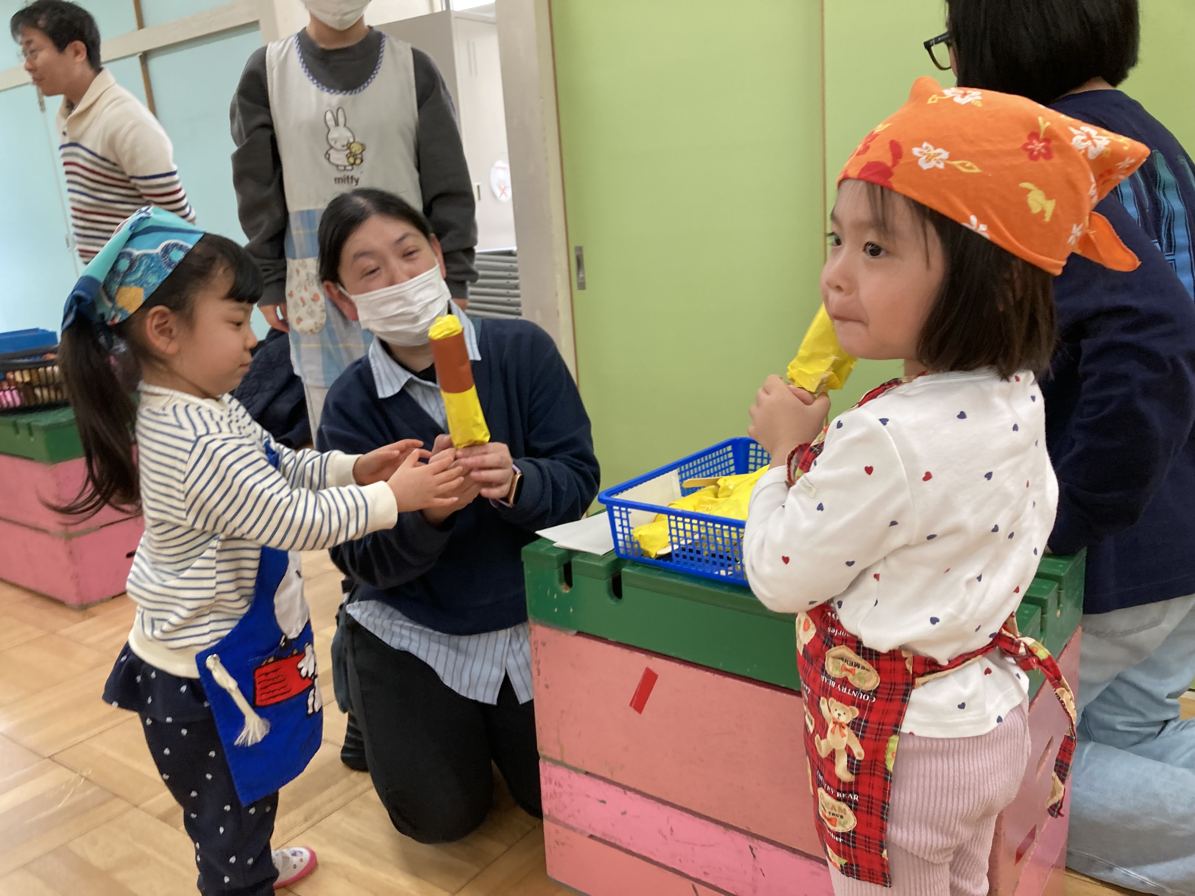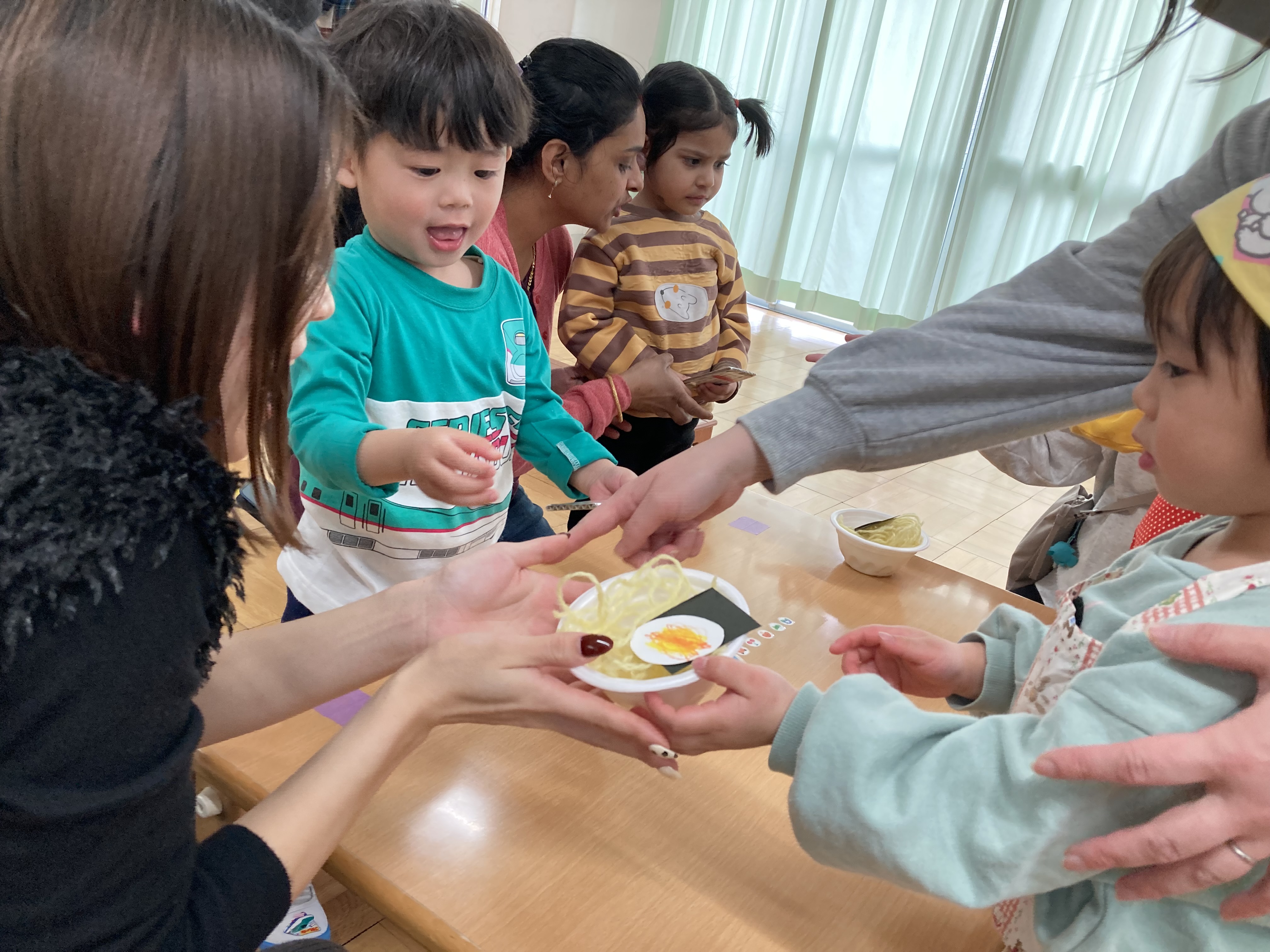 そして、その後は普段の保育の中で行っているお店屋さんごっこを保護者の方にも一緒に体験してもらいました。