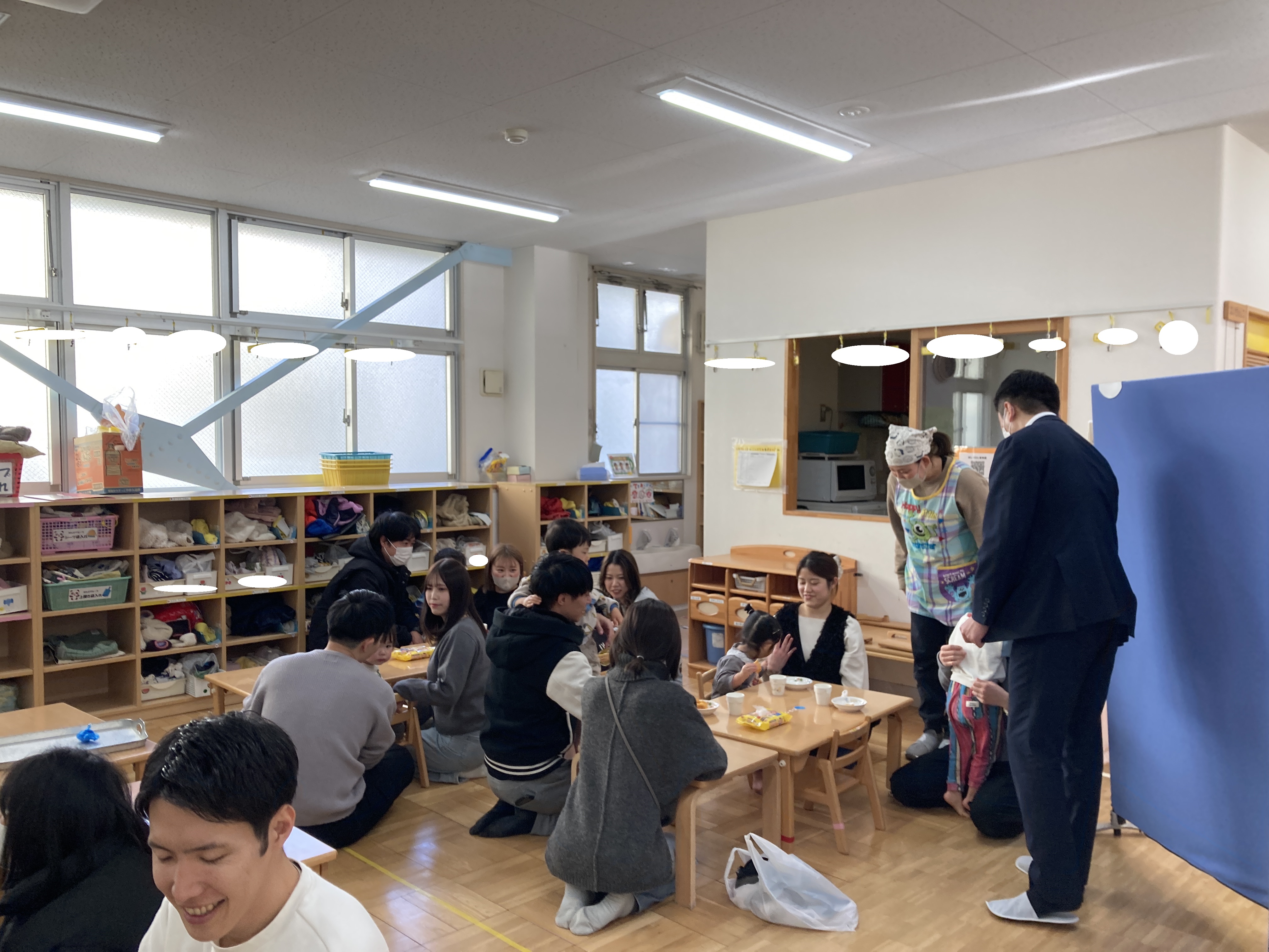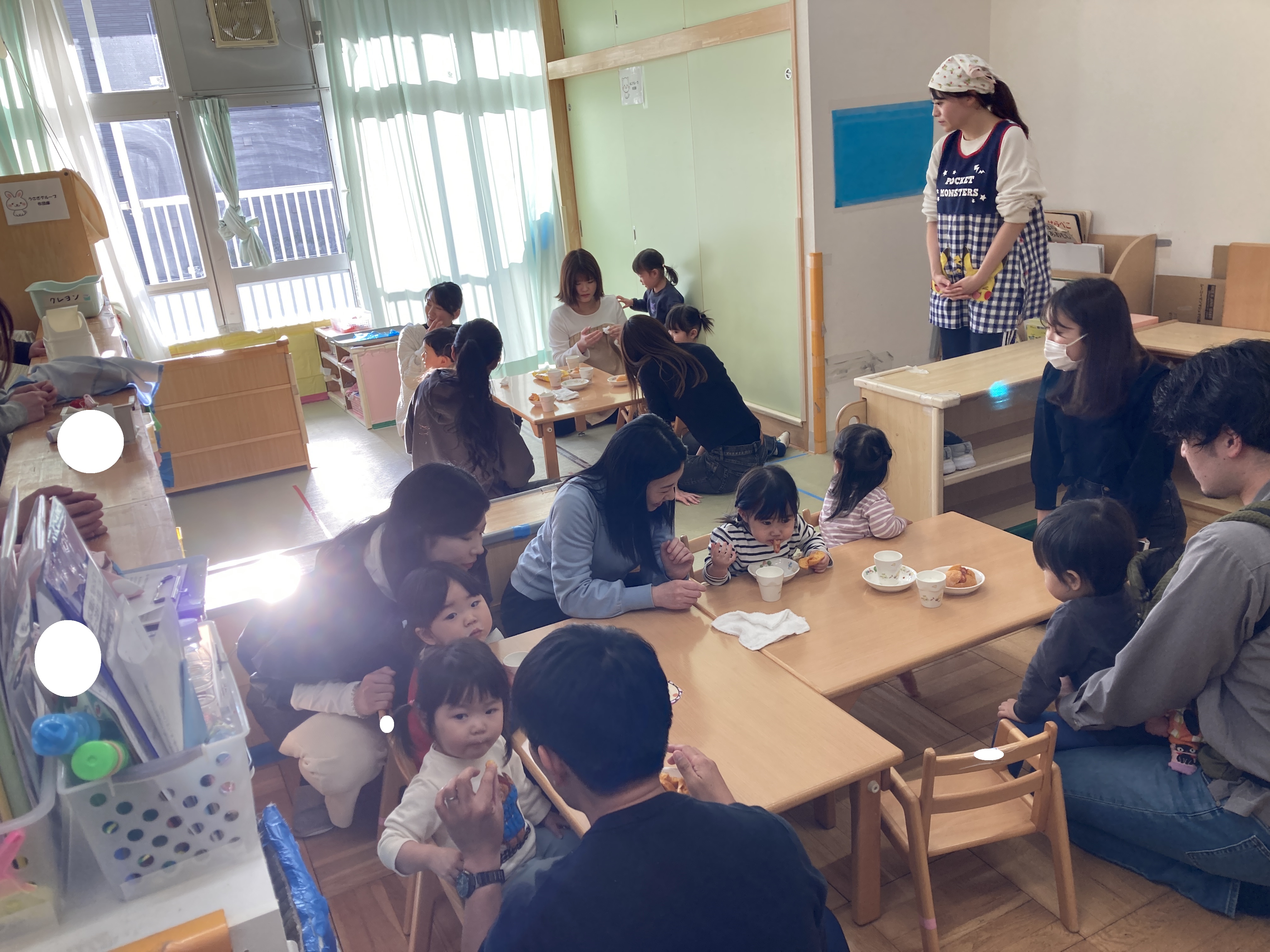 午睡中に保護者会を行い、そのすぐあと、保護者の方に子ども達のところに会いに行ってもらいました!寝起き後に保護者の方がいることに気付くと、びっくりとした表情を見せると同時に大喜び♡おやつの時間も隣りに座ってもらい、食べているところを見てもらいました。