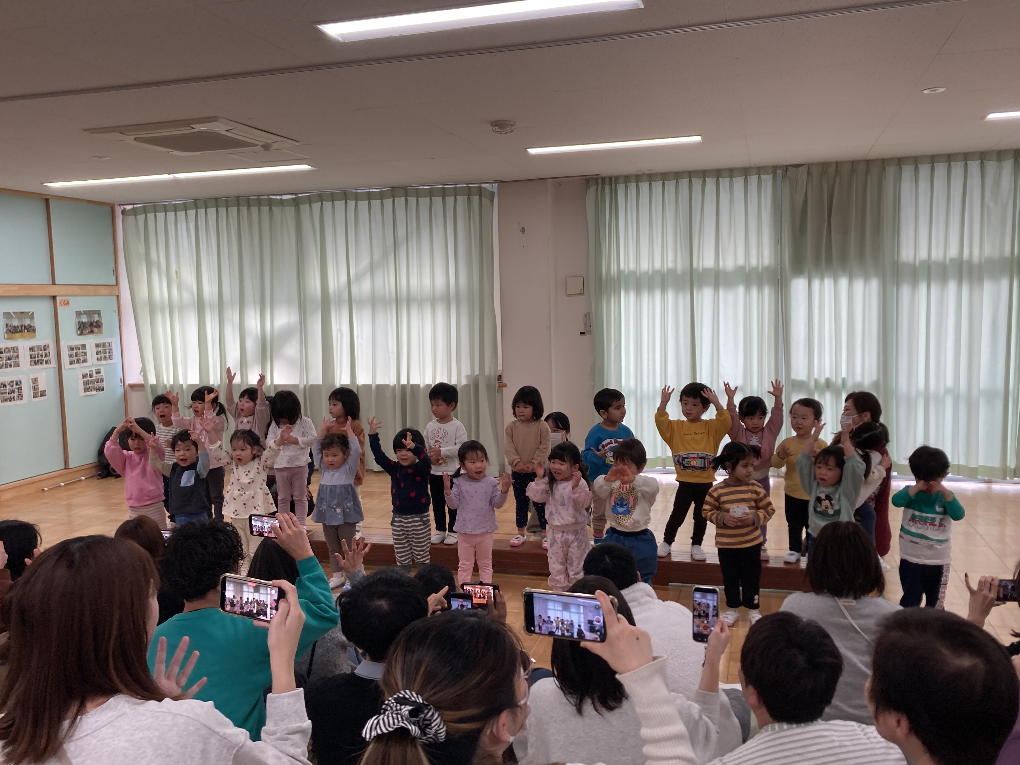 うめ組は保護者会後、子ども達が来るのをホールで少し待っててもらい、そこに子ども達が登場です!保護者の方に気付くと、にっこり嬉しそうな子ども達。最初は歌【おもちゃのチャチャチャ】発表をしました♪緊張している子もいましたが、子ども達の可愛い歌声がホールに響き渡りましたよ。