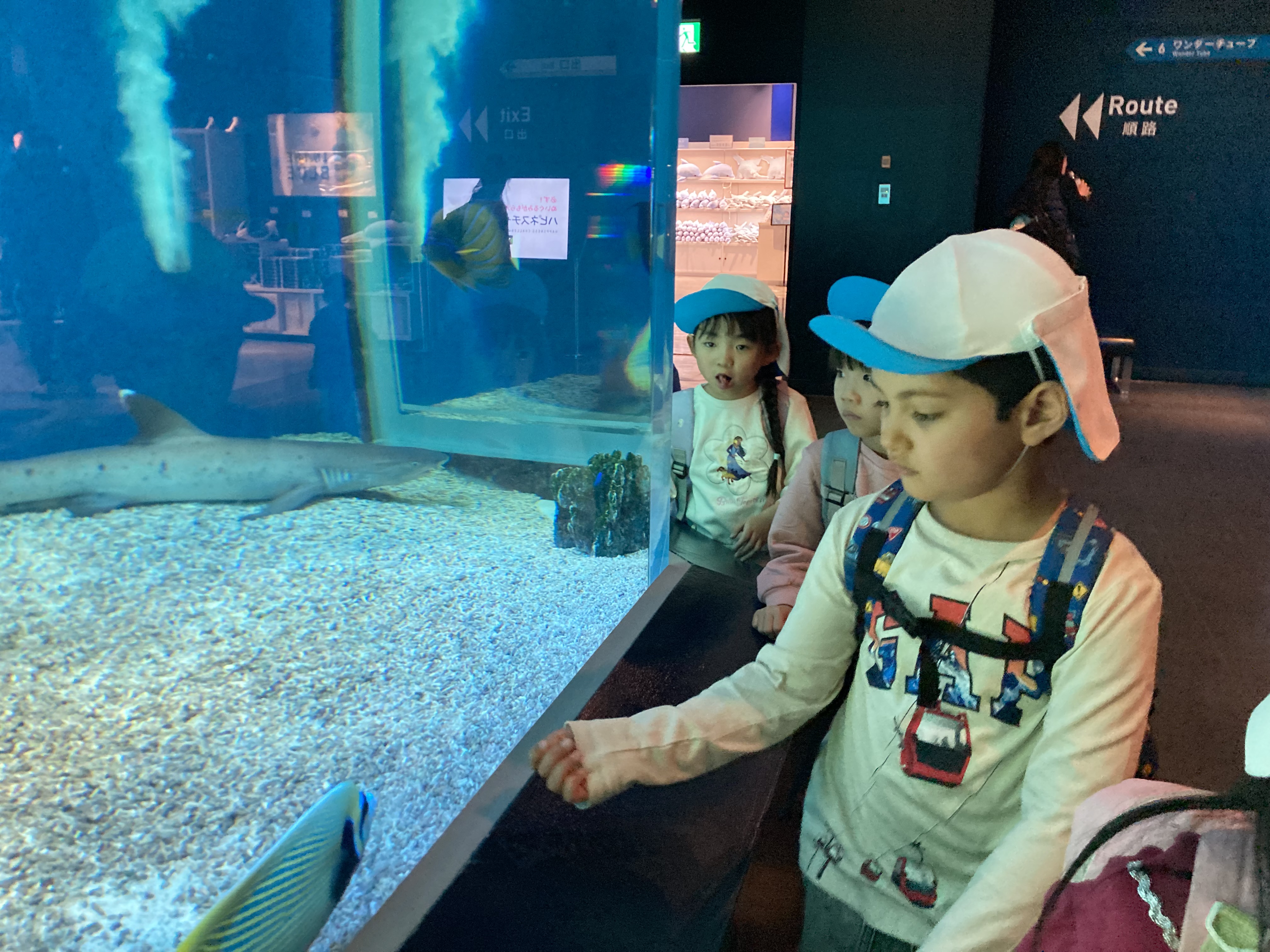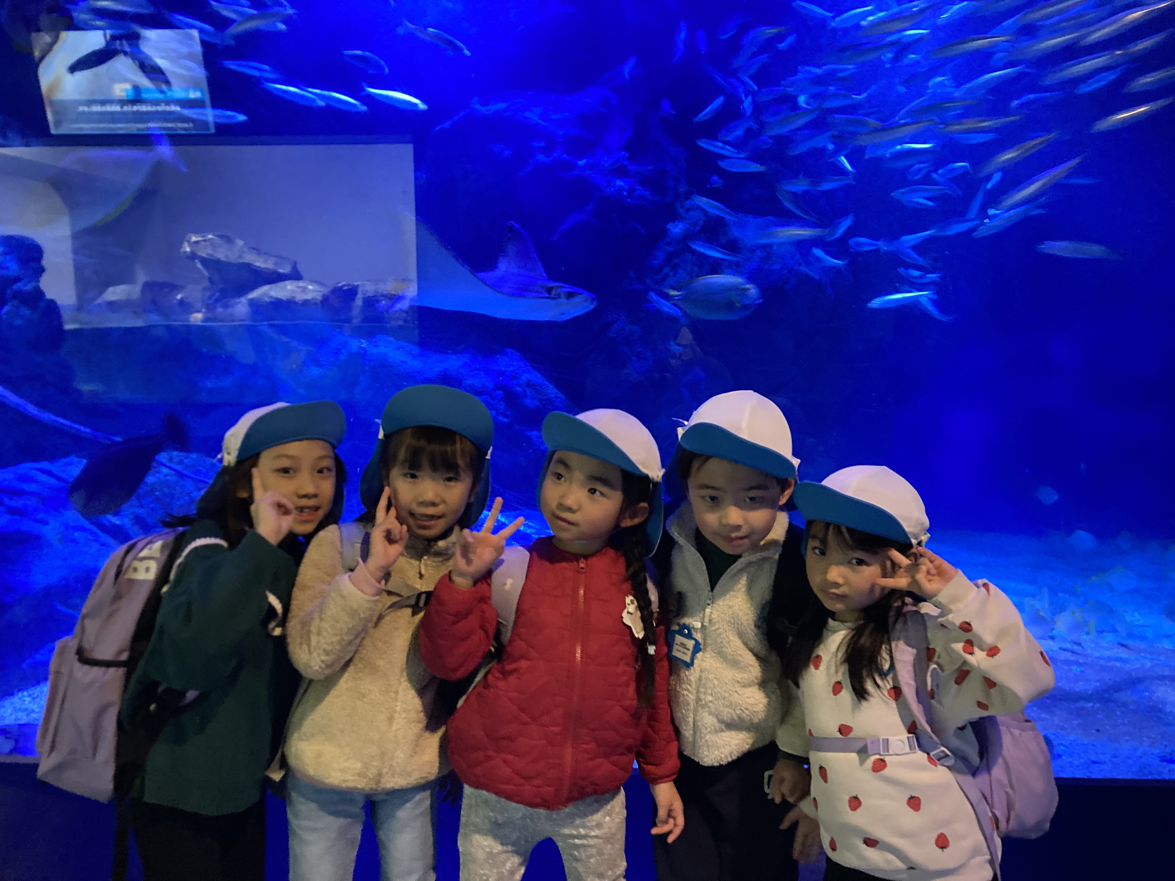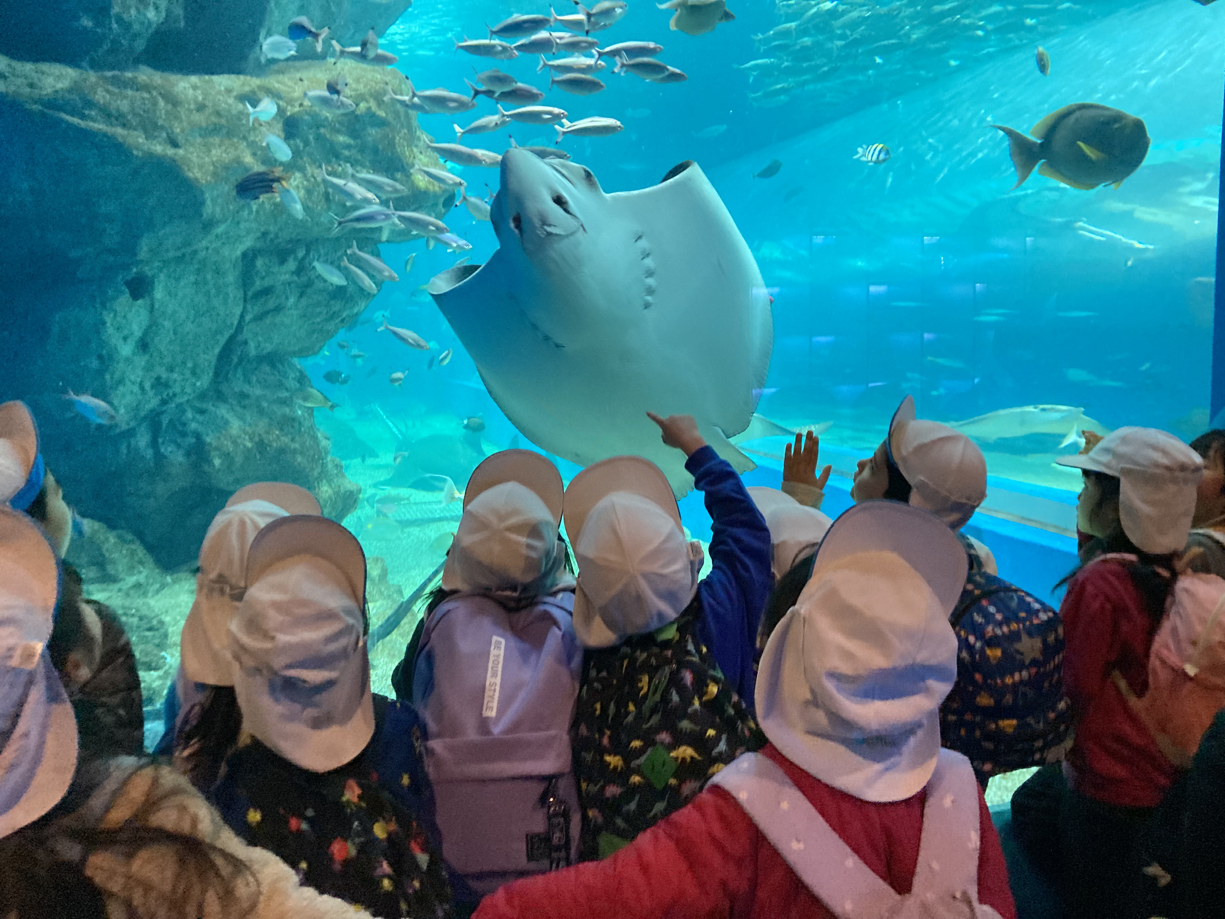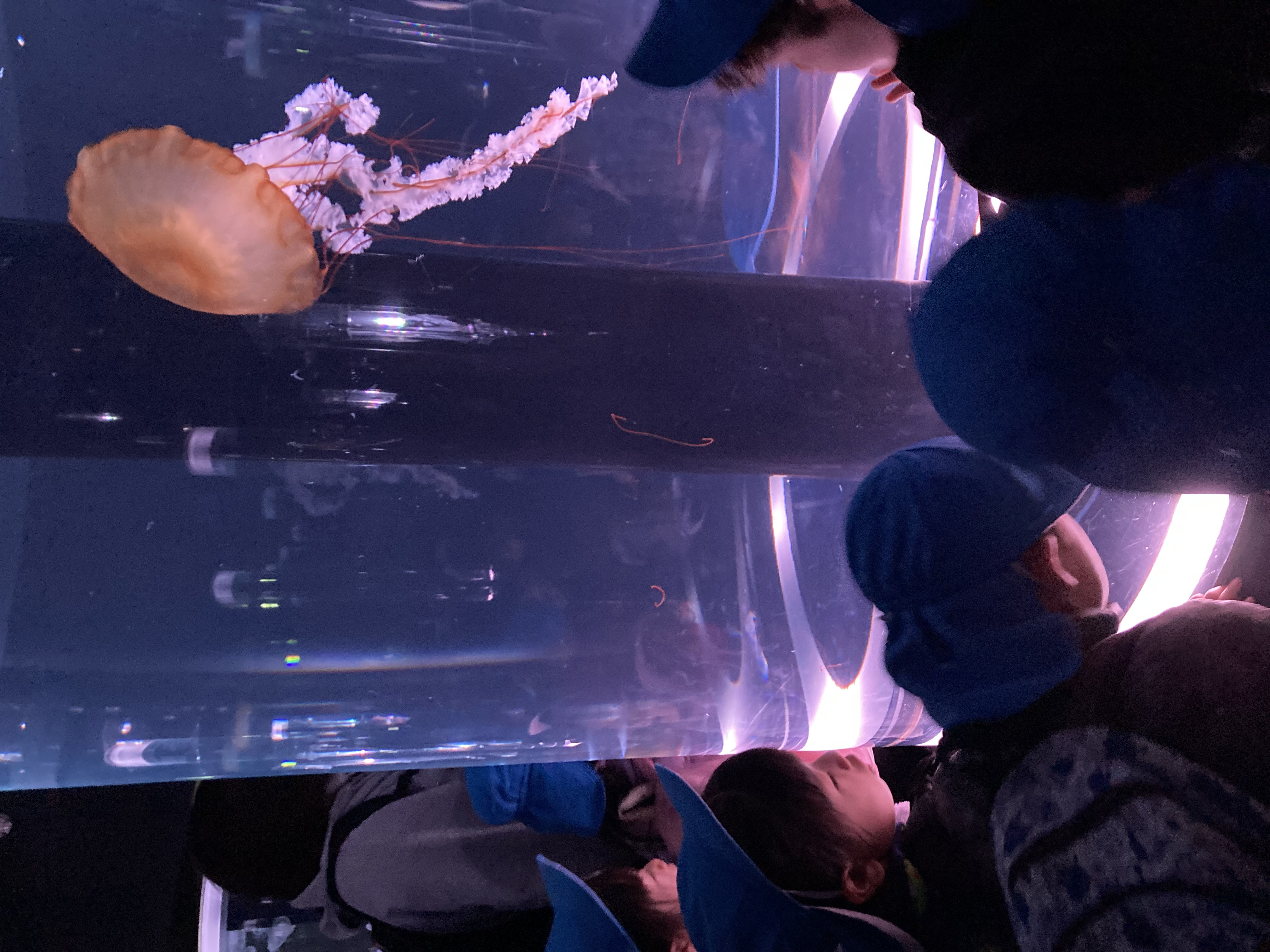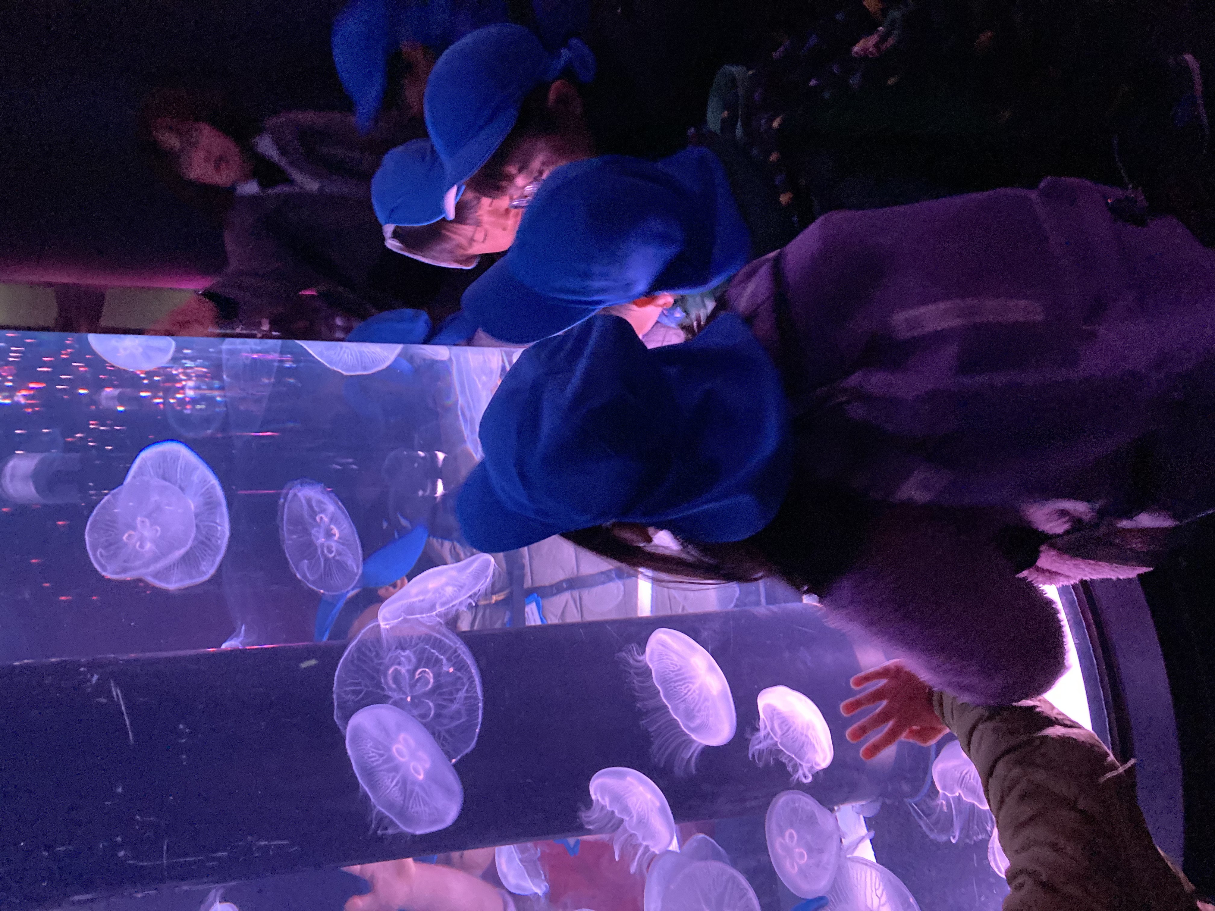 水族館に到着!最初は暗い雰囲気の中でクラゲや魚を見ました。