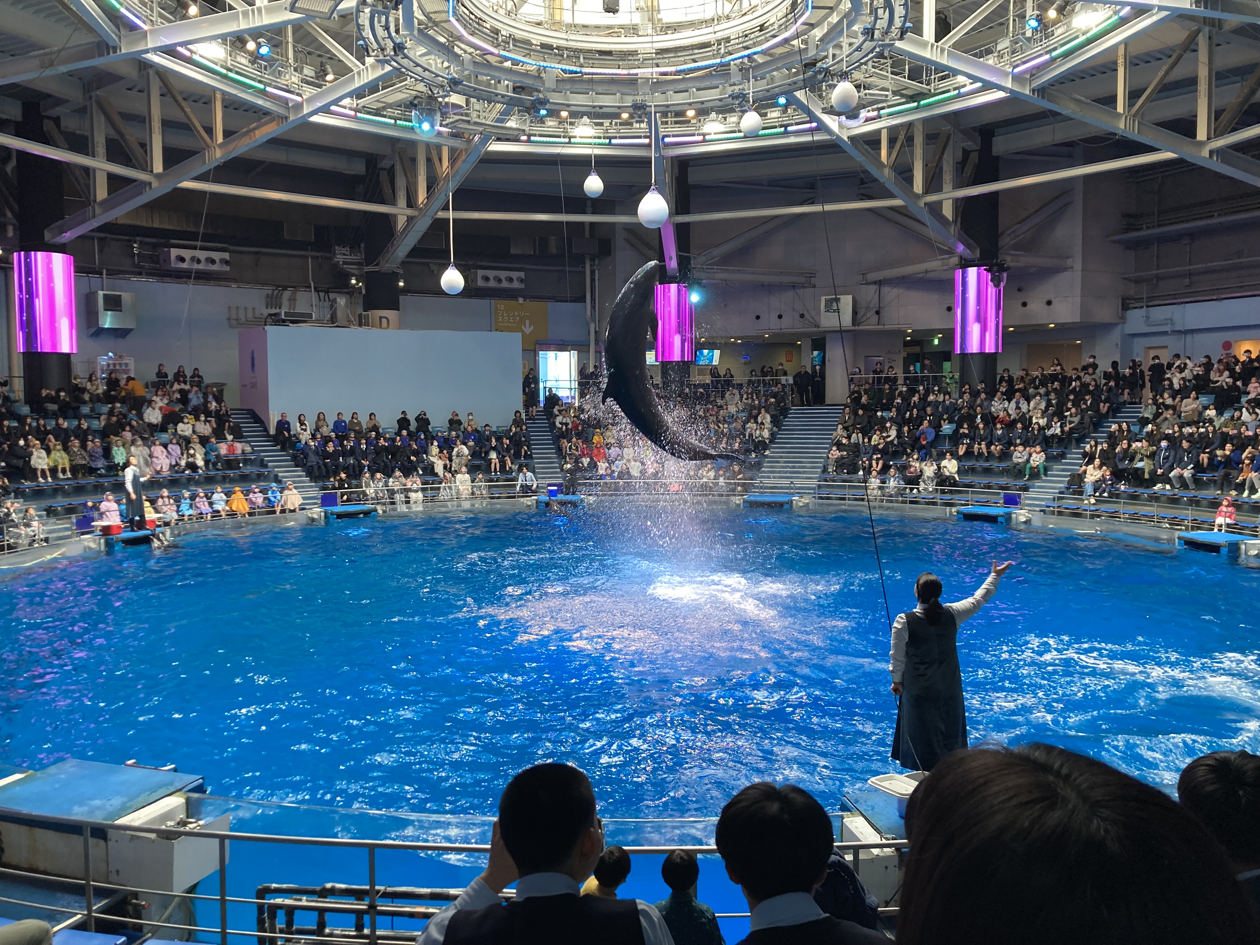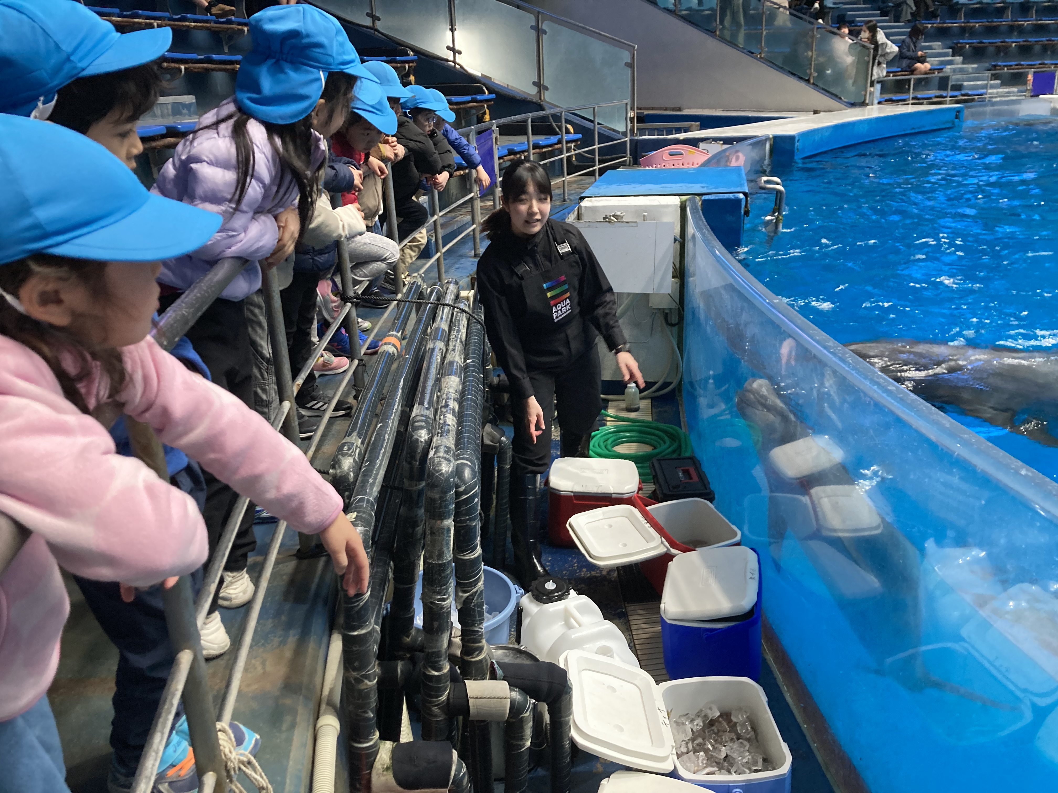 始まるまで時間があったので近くに行ってイルカを見たり、飼育員さんに「何を食べるの?」「お名前は?」と質問したりしました。