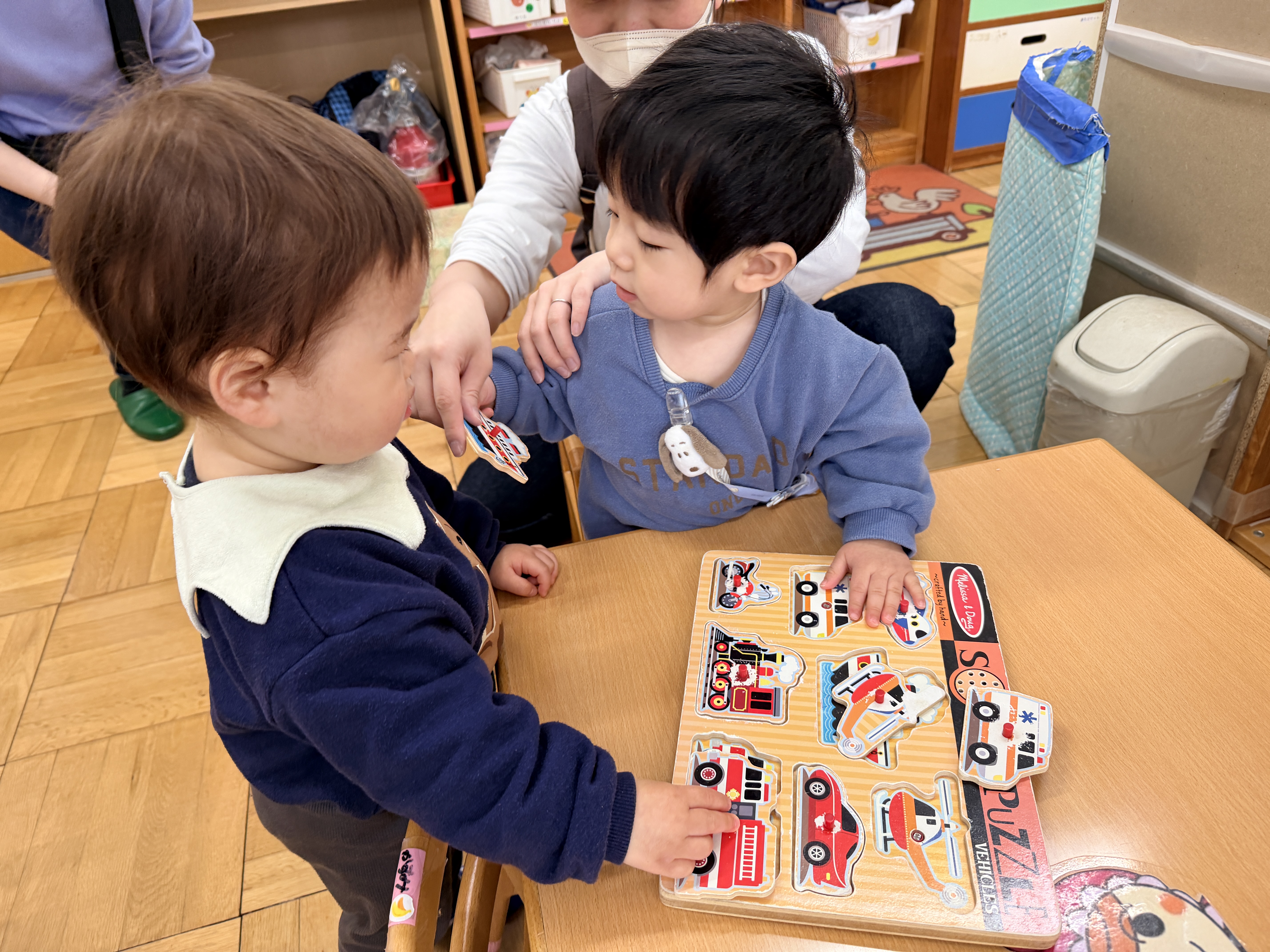 でも大好きなパパママと一緒なので、少しずつおもちゃに手を伸ばし始めたり、お友達に興味を示して顔を覗いたりし始めました。
